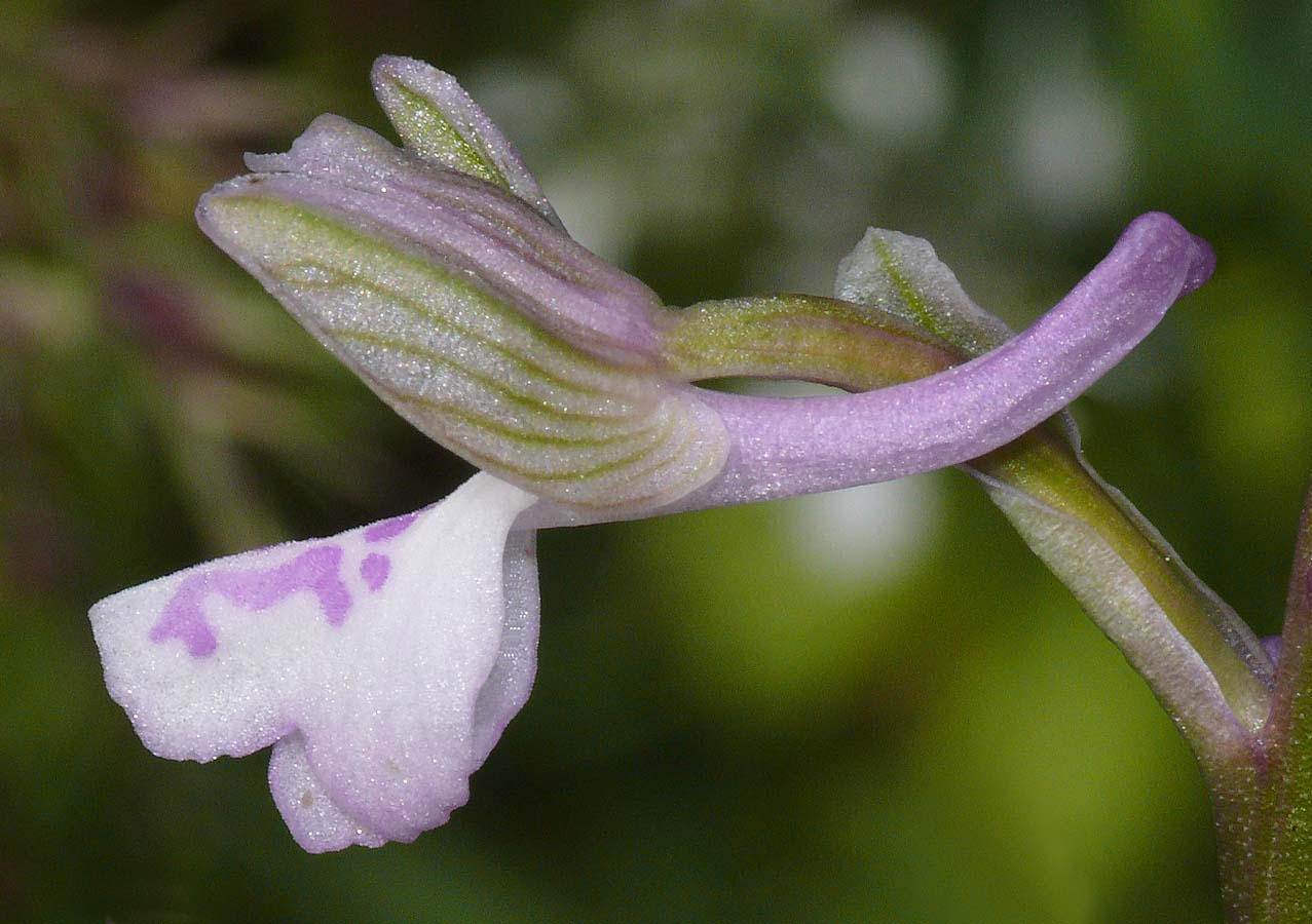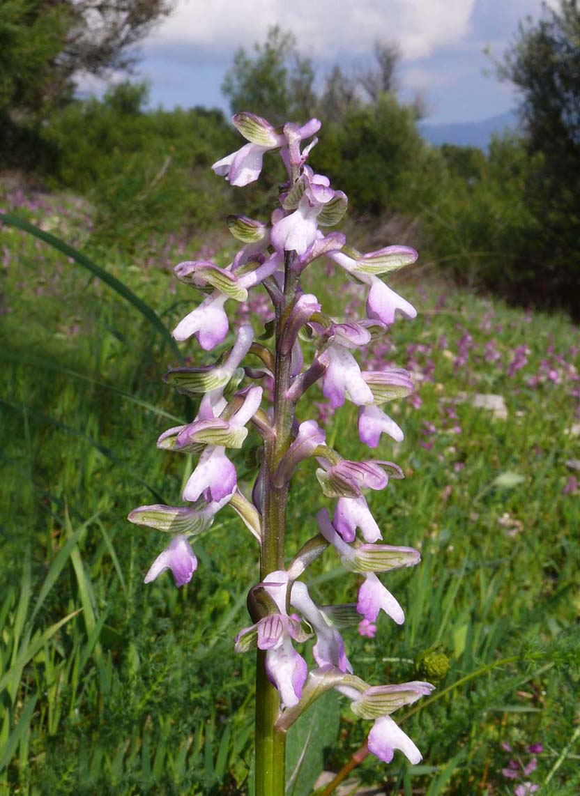 Its range is somewhat uncertain but as its name suggests, is widespread throughout the Caucasus, the near east, Balkans and has most recently been discovered in the islands of the Aegean and adjacent Turkish coast. It seems likely that A. morio subsp. caucasica is distributed more widely than this and further discoveries will almost certainly follow. The principle differences between this species and A. morio itself are as follows :- 1. The flower is smaller. 2. The lateral lobes of the lip are usually more tightly folded back. 3. The inflorescence generally carries more individual flowers. 4. The median lobe of the lip is longer than the lateral lobes. This latter feature is perhaps the most significant differentiating characteristic. With the similar and some consider debatable A. picta, the lobes tend to be of similar lengths and are always flared rather than folded back. Another worthwhile if not diagnostic feature of caucasica is the overall appearance of the plant which tends to be tall, slender stemmed and with a neat and fairly compact spike of small flowers. The first picture illustrates this point very well. The photos are from Lesbos and Samos, dating from the first week of April at which time they were in full flower. Populations in cooler regions would appear later and into late May. |