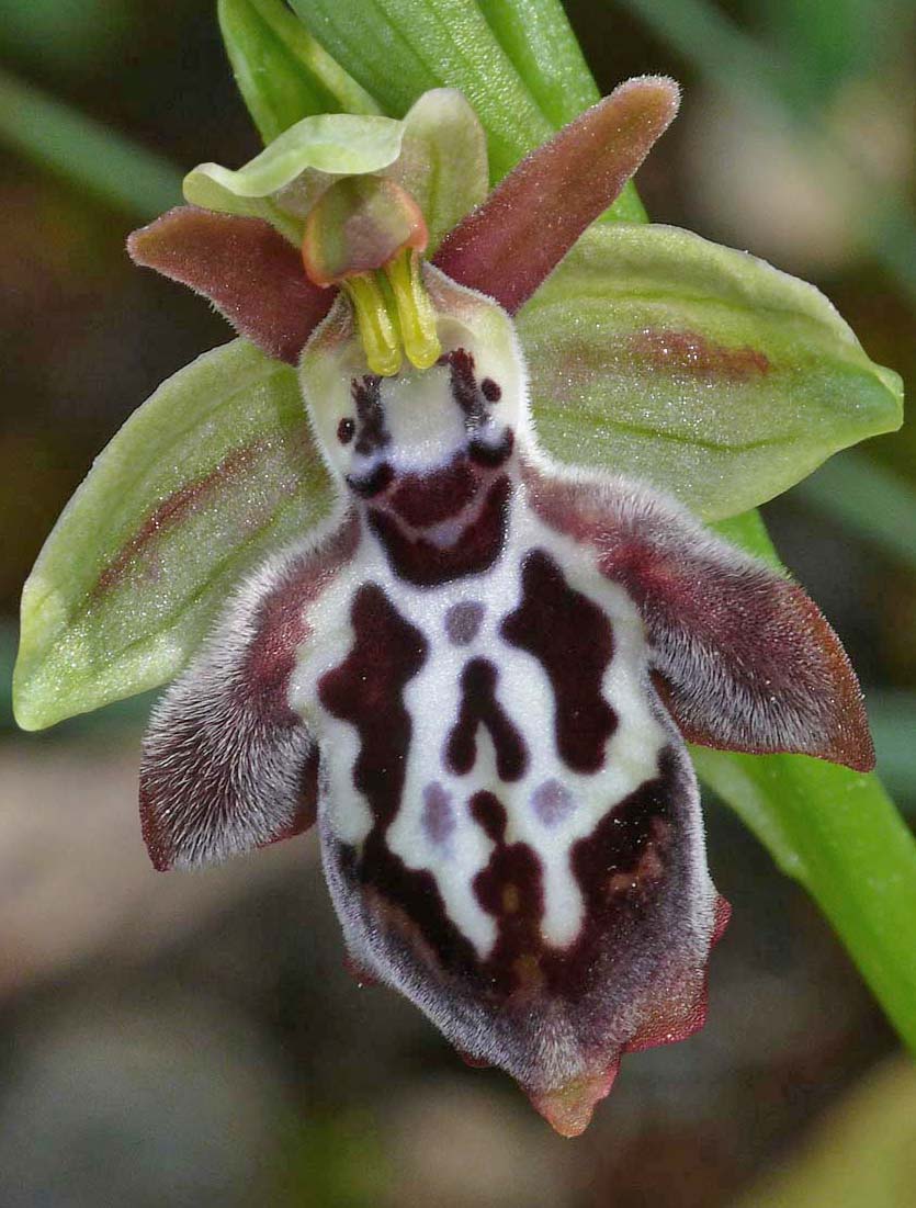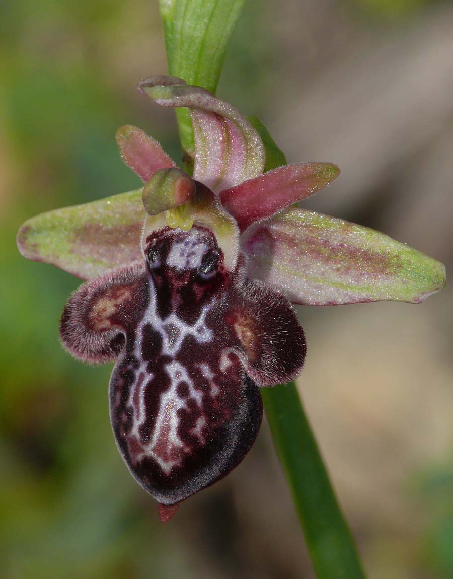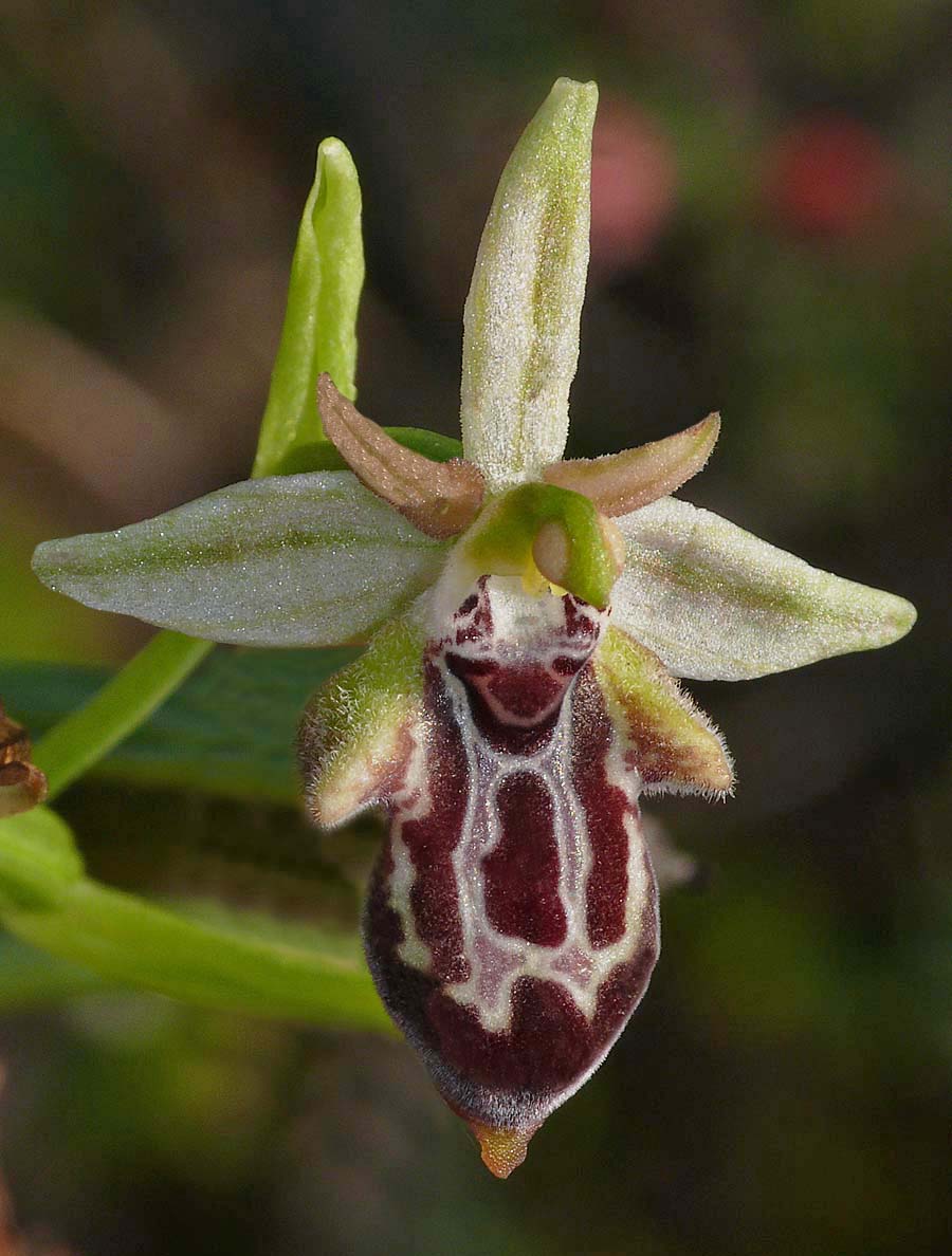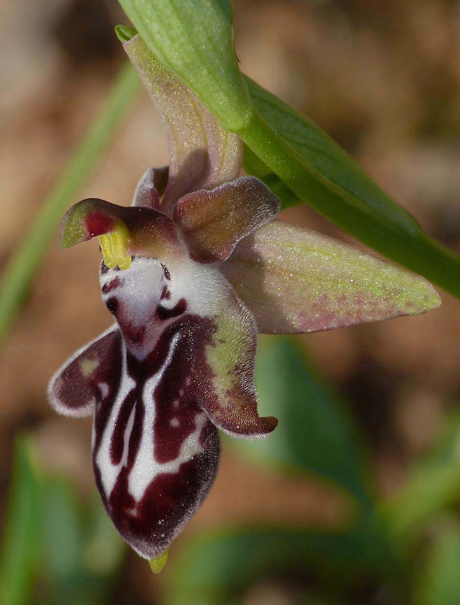 This species is a Greek endemic being found in the Cyclades, Karpathos and Crete where it is not uncommon on the eastern side of the island. It has also been recently discovered in small numbers on the mainland in both Attica and the southern Peloponnese. It is a very similar plant to O. cretica and on Crete itself, the two species are known to hybridize, though the scope for this is limited by minimal geographical overlap and significant differences in flowering times. Even in pure populations, natural variation ensures distinguishing between O. ariadnae and O. cretica is not always straightforward. In typical forms however, two features in particular serve to separate the taxons. The first of these is the stigmatic cavity which in O. cretica is constricted at the base, creating the appearance of a neck, whereas in O. ariadnae, it widens at the base or at least rises straight up from the shoulders (see pictures 4 and 13). A second characteristic is the normally more complex and extensive specular pattern of O. ariadnae. Commencement of flowering can vary, sometimes appearing up to a month before its close relative. They both however bloom for lengthy periods and can easily be found flowering concurrently, though rarely side by side. O. ariadnae starts flowering as early as February and is normally over by the end of April. The pictures are all from Crete and date from the first two weeks of April. |