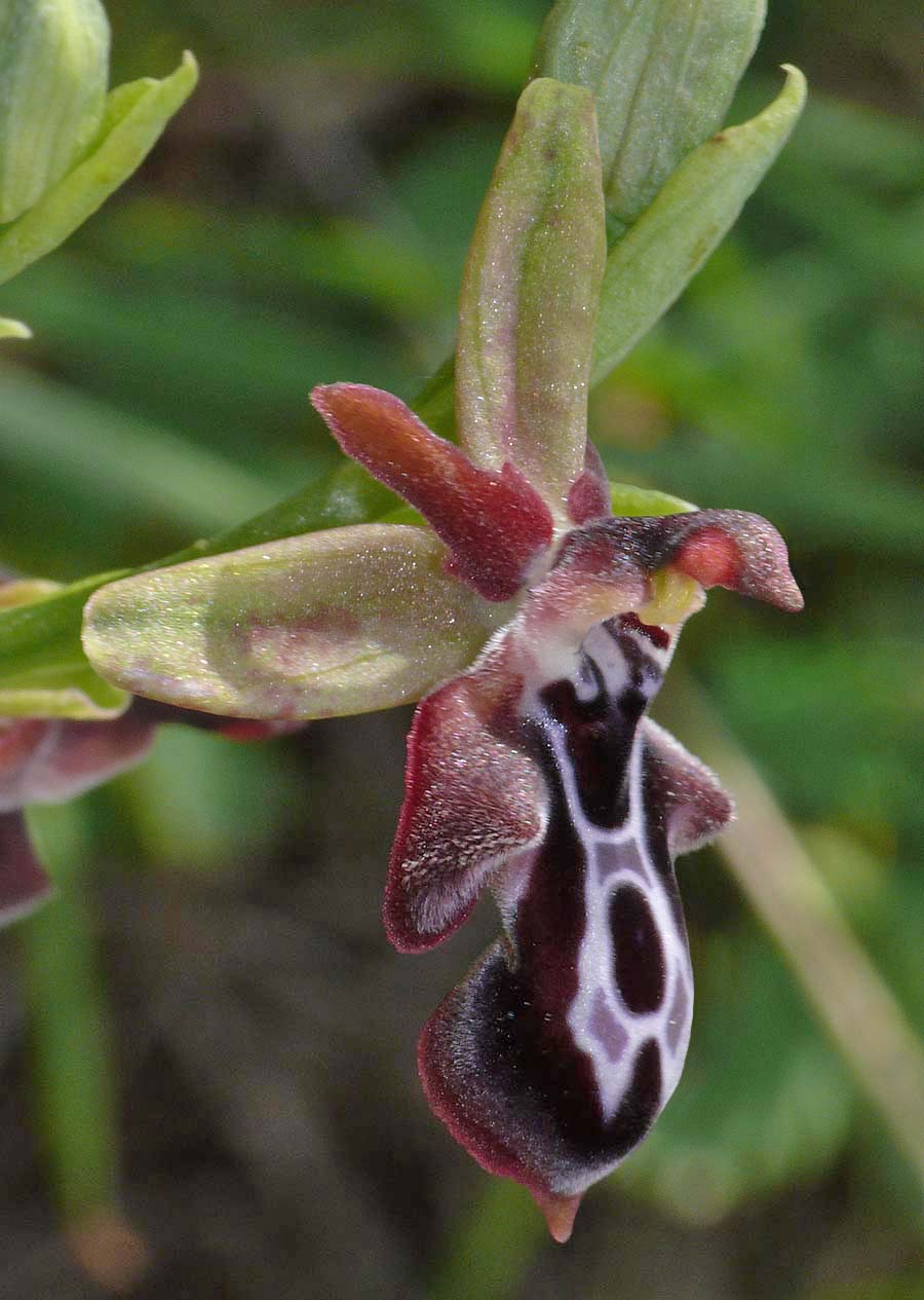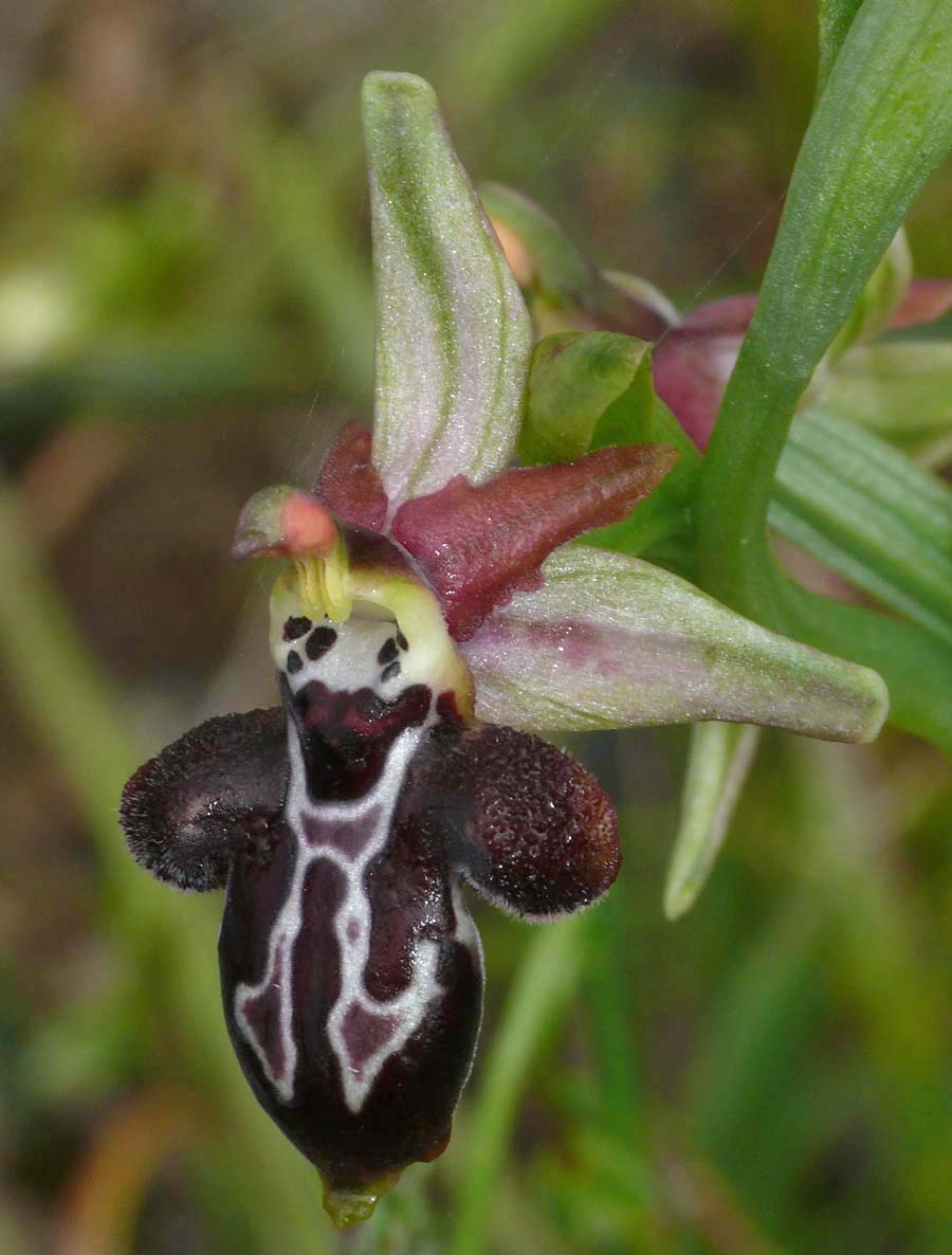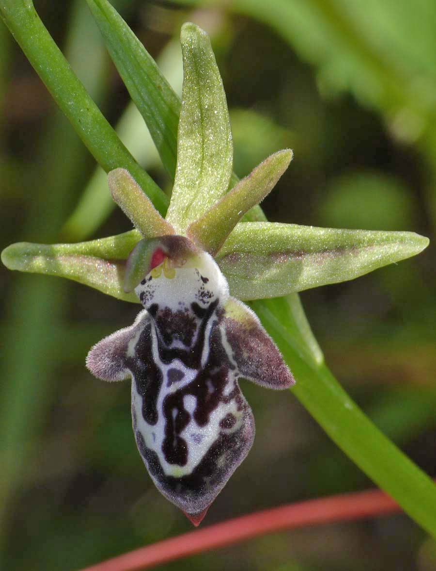 This species is a Greek endemic being found in the Cyclades, Karpathos and Crete where it is not uncommon on the eastern side of the island. It has also been recently discovered in small numbers on the mainland in both Attica and the southern Peloponnese. It is a very similar plant to O. cretica and on Crete itself, the two species are known to hybridize, though the scope for this is limited by minimal geographical overlap and significant differences in flowering times. Even in pure populations, natural variation ensures distinguishing between O. ariadnae and O. cretica is not always straightforward. In typical forms however, two features in particular serve to separate the taxons. The first of these is the stigmatic cavity which in O. cretica is constricted at the base, creating the appearance of a neck, whereas in O. ariadnae, it widens at the base or at least rises straight up from the shoulders (see pictures 4 and 13). A second characteristic is the normally more complex and extensive specular pattern of O. ariadnae. Commencement of flowering can vary, sometimes appearing up to a month before its close relative. They both however bloom for lengthy periods and can easily be found flowering concurrently, though rarely side by side. O. ariadnae starts flowering as early as February and is normally over by the end of April. The pictures are all from Crete and date from the first two weeks of April. |