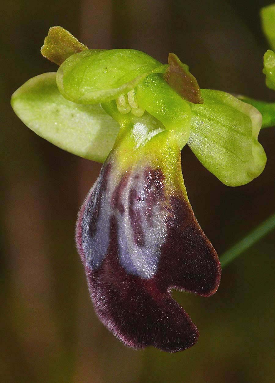 O. arnoldii was first described from Tarragona, Spain by Delforge in 1999 and is named in honour of the contemporary botanist, Mr J. P. Arnold. This species is a member of the O. funerea group of Ophrys. There is however little consensus amongst experts as to the true status of the species and its become the subject of ongoing study in an attempt to establish its taxonomic position, particularly its relationship to O. lupercalis and O. forestieri which many believe to be synonymous anyway. The confusion and doubts about its status as a species are not in any way allayed by the fact that all three of these Ophrys are pollinated by the same mining bee, Andrena nigroaenea. This is another Pseeudophrys for which a description of morphological characteristics fails to satisfactorily distinguish it from other similar species. Fowering periods can be of some guidance as O. arnoldii is the last of the three to bloom, first appearing in mid April and sometimes persisting through to mid June. This later flowering enables it to avail itself of the services of the second generation of its pollinator. O. arnoldii will tolerate a range of conditions from full sun to mid shade and dry to moist soils, though always on calcareous substrates. It is a robust plant with flowers that are large and often numerous (up to ten) with lateral lobes that although separated from the median lobe by significant sinuses, are invariably folded under in a way that usually disguises this feature. The pictures are from northern Spain, southern France and Mallorca, dating from the last week in April, at which time the plants were just beginning their flowerng cycle. |