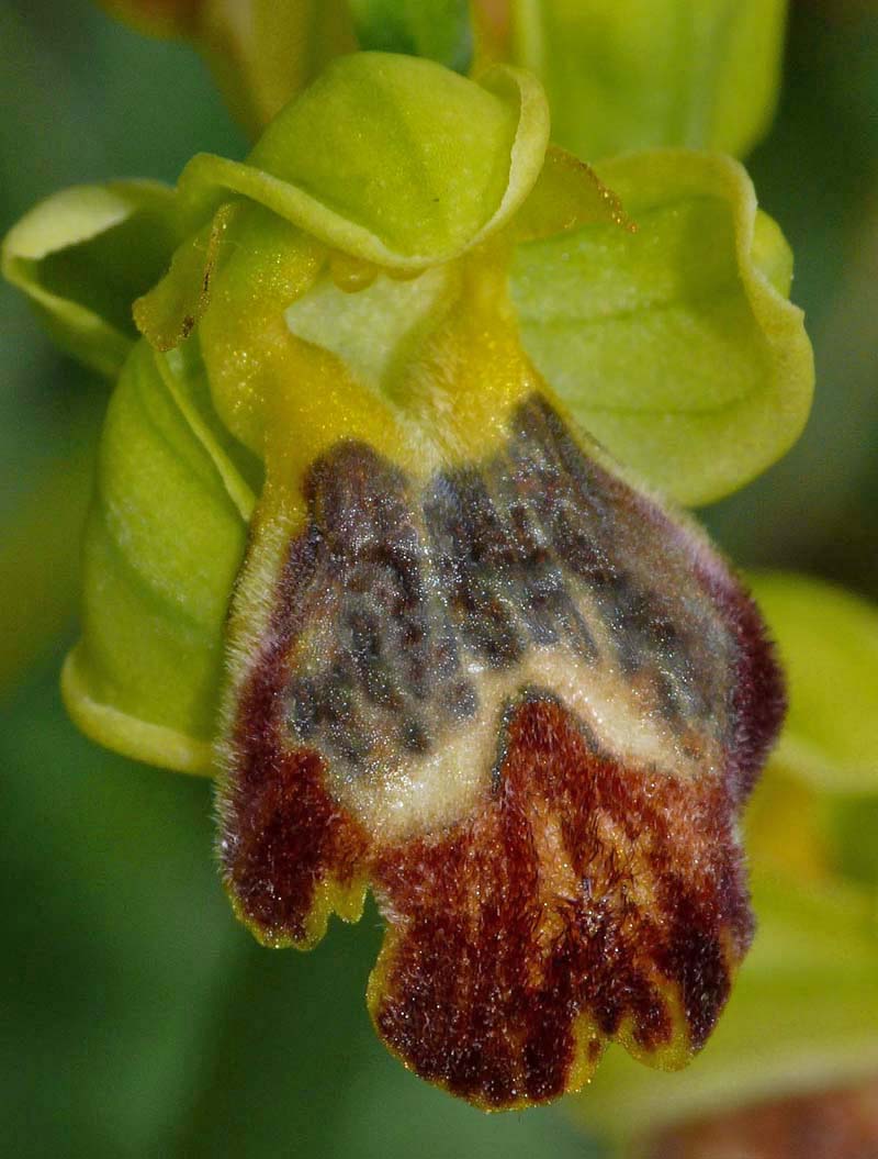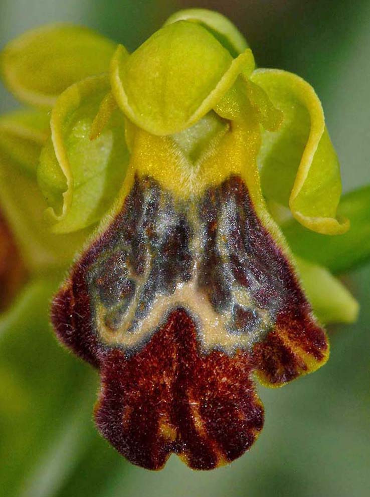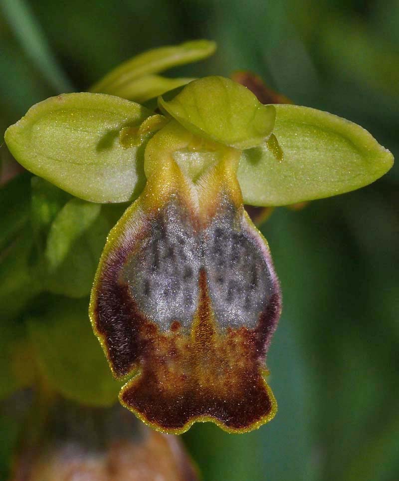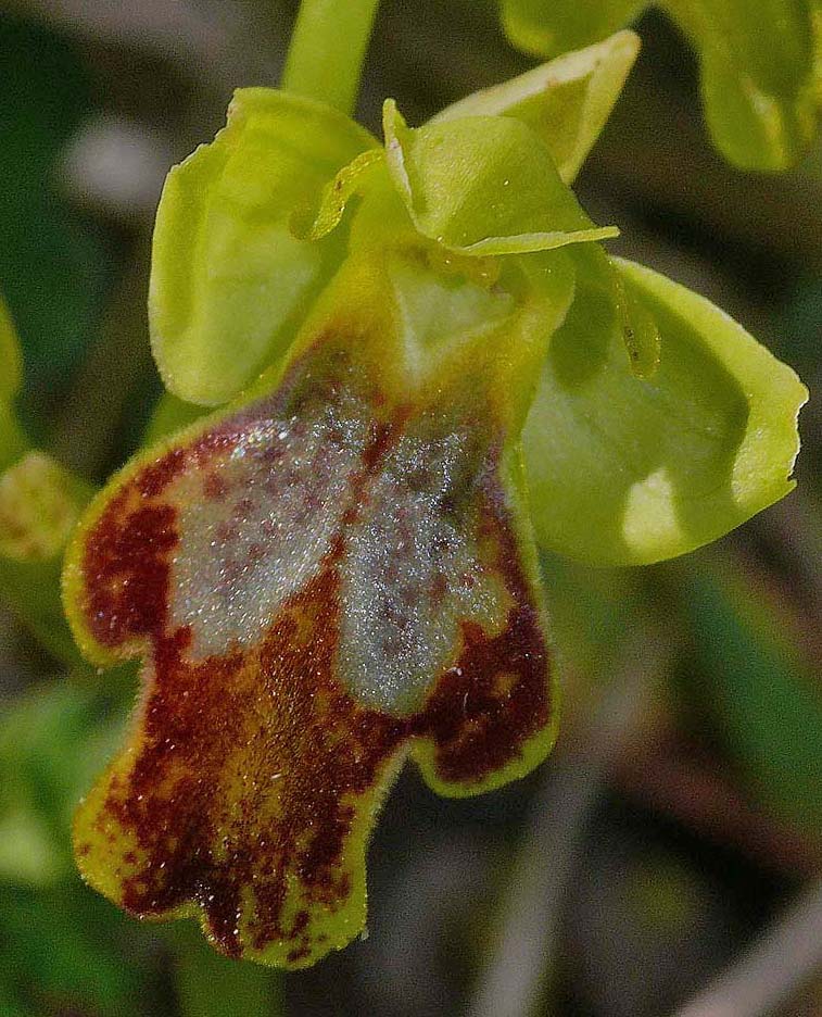 This Ophrys was first described by Delforge from Malta in 2000 and was named O. caesiella where "caes"  refers to the bluish grey colouration of the