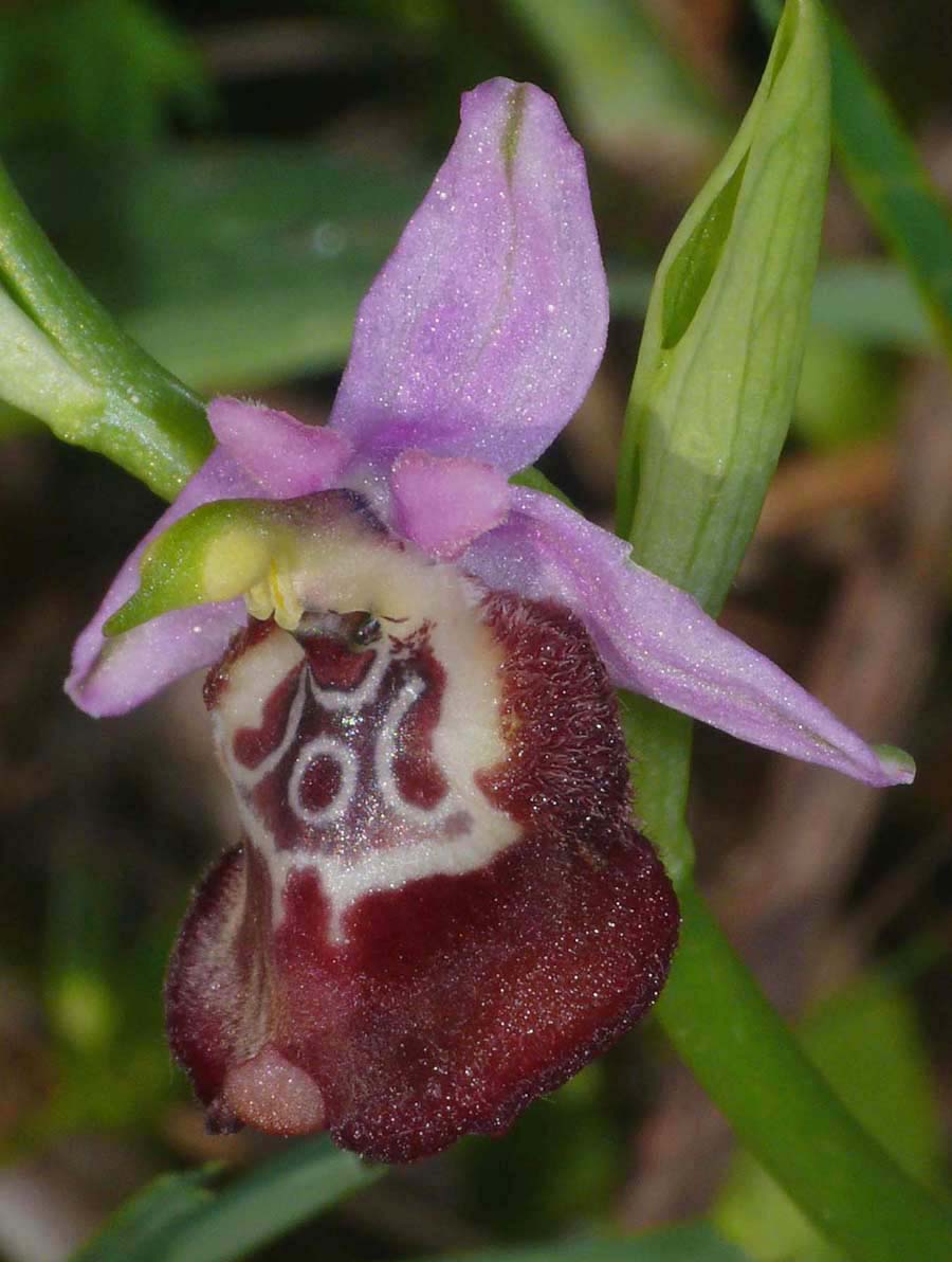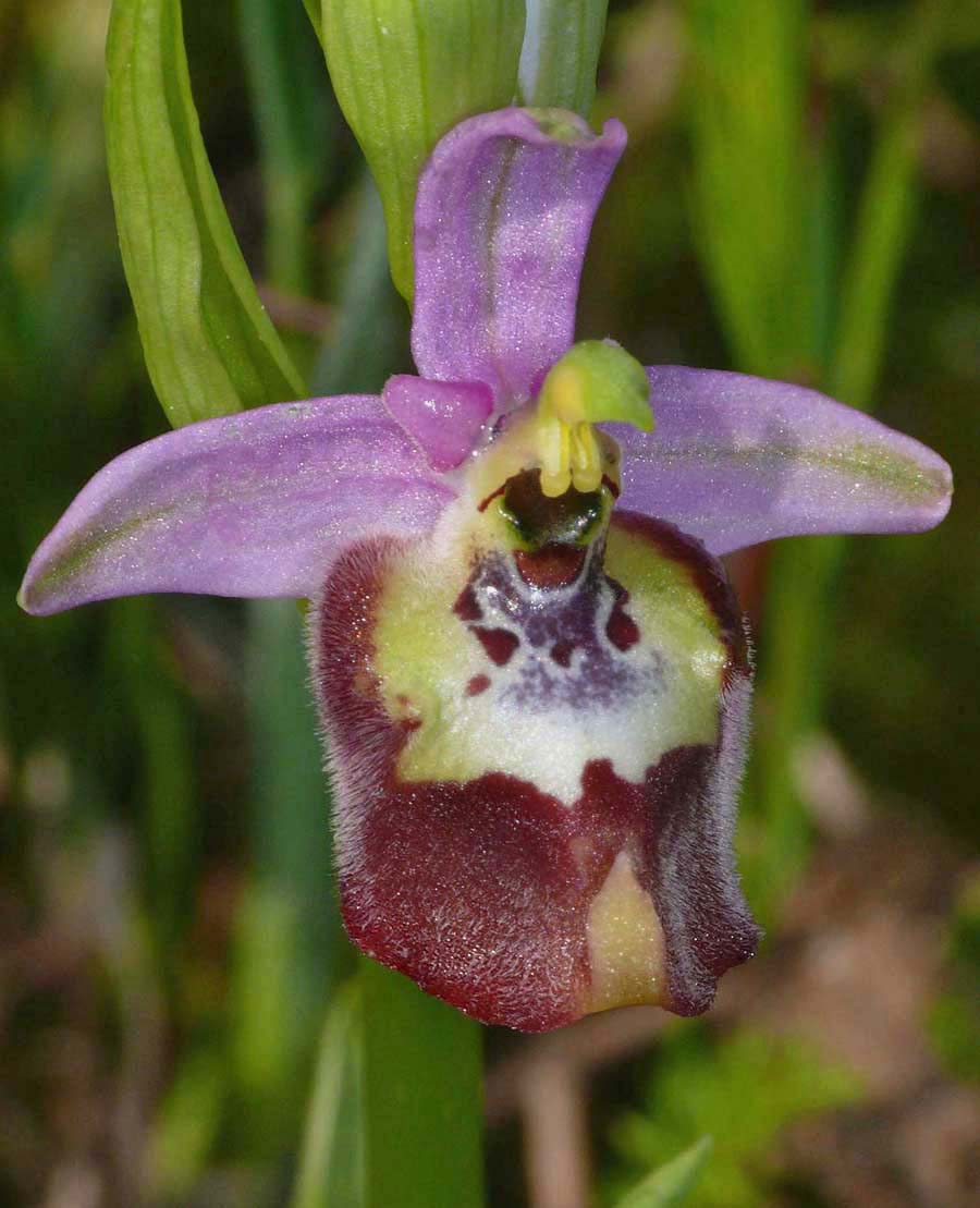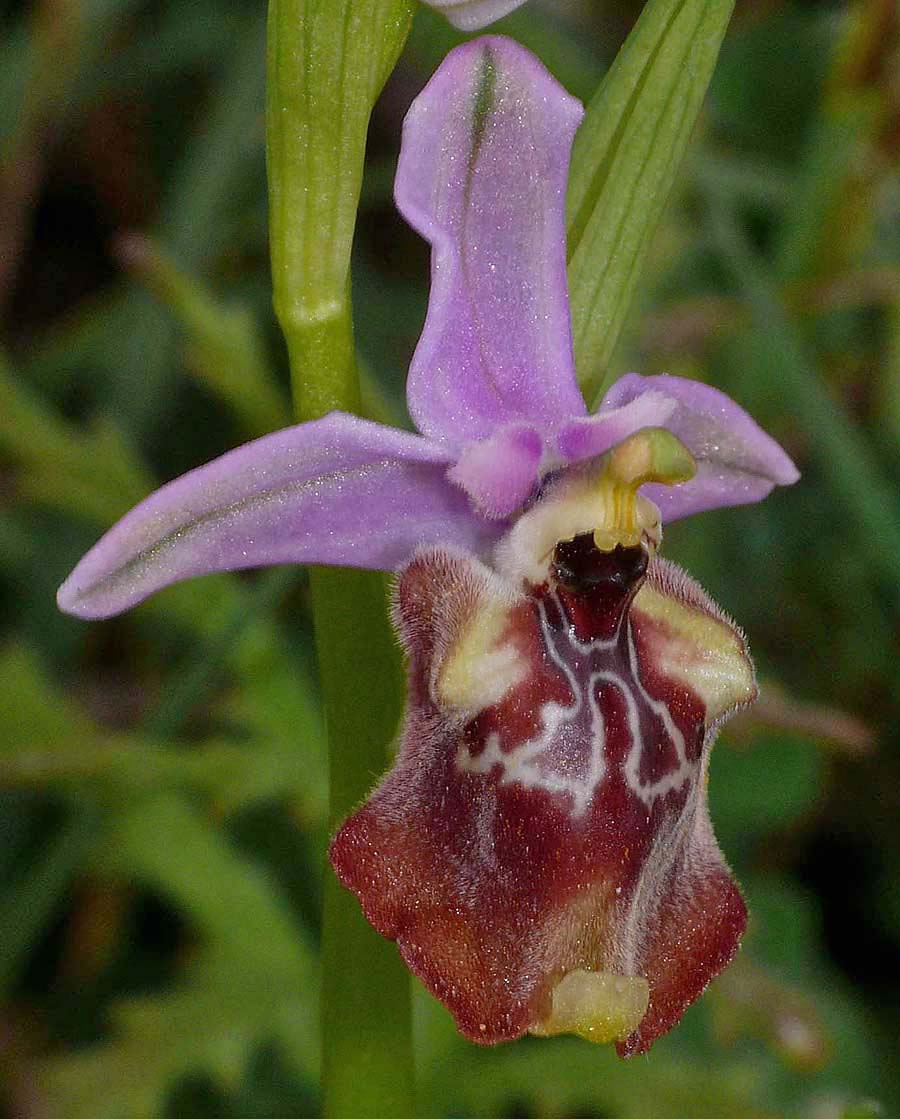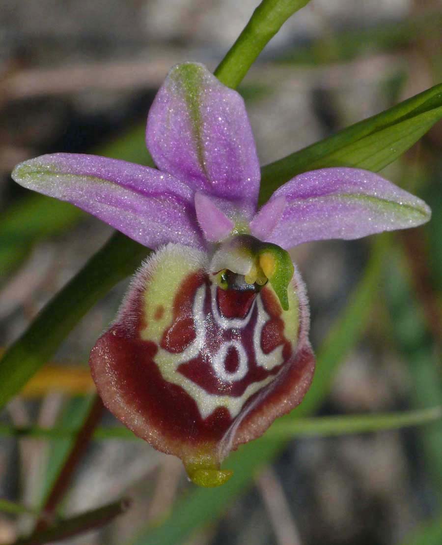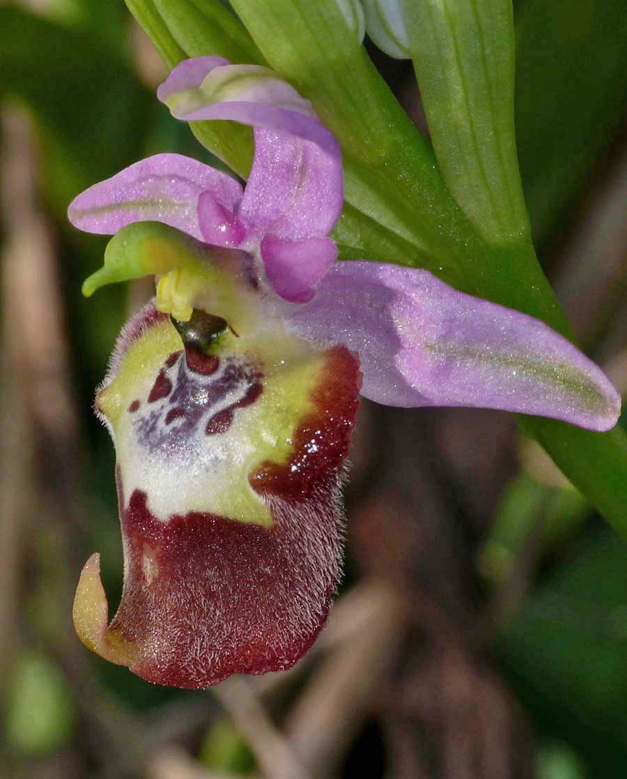 This is one of seven members of the O. fuciflora group that was first formally described by Bartolo and Pulvirenti in 1997 from the Siracusa region of Sicily. O. calliantha is endemic to that island where although often plentiful in its preferred locations, is extremely local in its overall distribution. Its name means "beautiful flower" and it undoubtedly lives up to this title being both brightly coloured and distinctively marked. It is perhaps the easiest of the Sicilian fuciflorids to recognize, though as with the other species, it frequently suffers genetic interference which can complicate identification. Several of these pictures depict specimens which exhibit some non typical features and probably fall into this category. The "typical" O. calliantha has pink to purple sepals, matching petals and a boldly patterned speculum with strong white to lemon yellow lining that can sometimes be so thick as to form a complete blotch. Anyone familiar with O. candica could be forgiven for thinking they were back in the Aegean as the two species are morphologically remarkably similar. This Ophrys has variously been regarded over the years as a sub species of O. fuciflora, O.oxyrrhynchos and unsurprisingly O. candica. A fellow Sicilian endemic, O. biancae is an adept impersonator of all its fuciflorid cousins but is both a significantly smaller and earlier flower. As with O. lacaitae, O. calliantha is a late starter and will be coming into bloom when O. biancae is well past its best. The illustrations are all from the south east of Sicily, east of Ferla and date from the last week of April. |