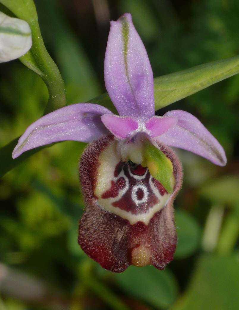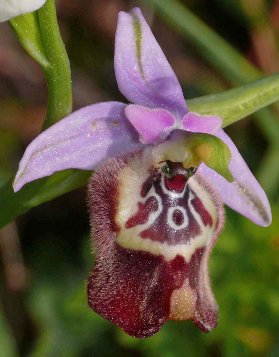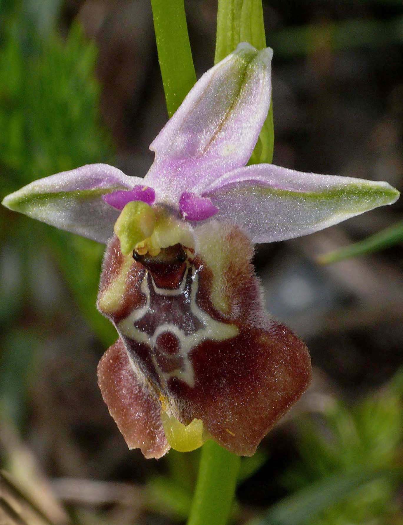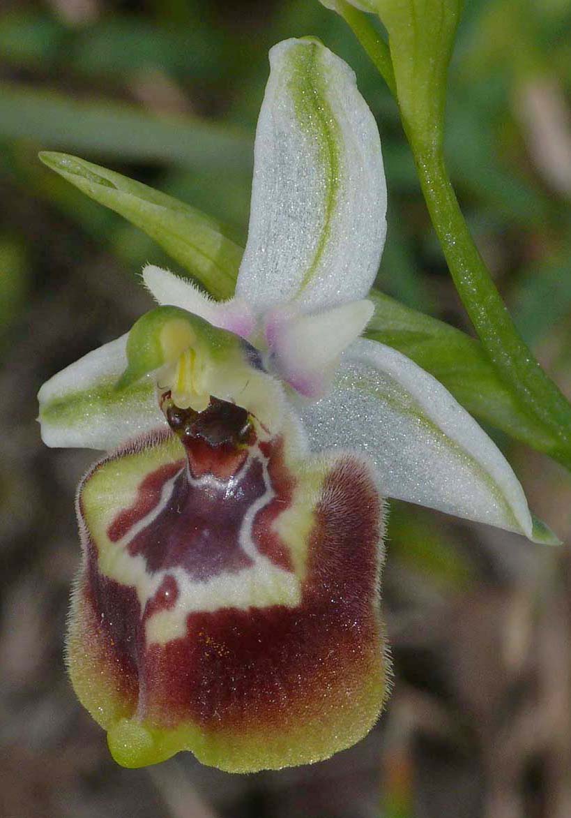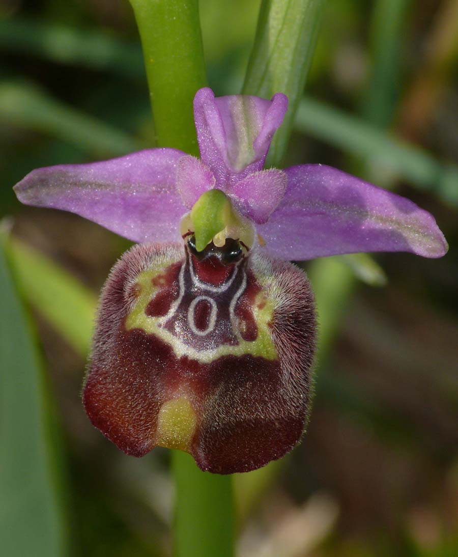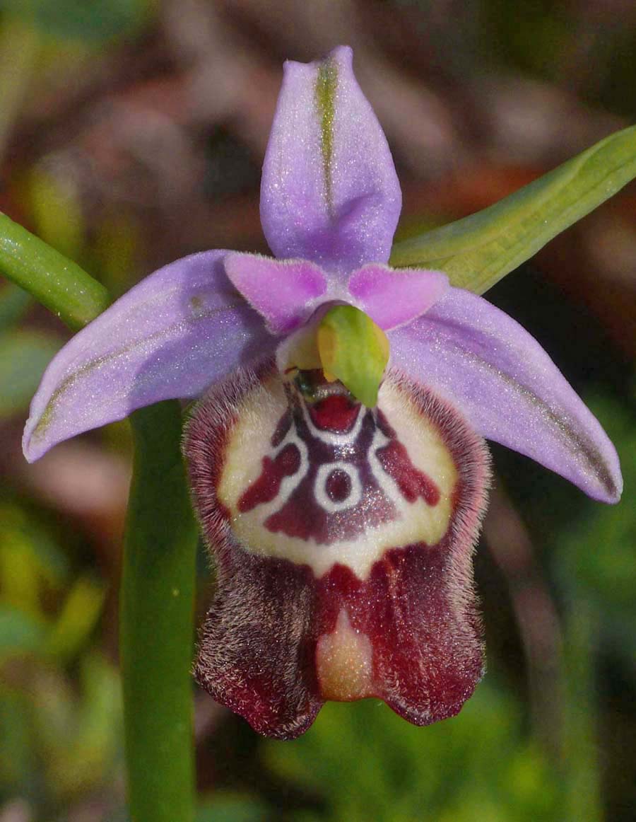 This is one of seven members of the O. fuciflora group that was first formally described by Bartolo and Pulvirenti in 1997 from the Siracusa region of Sicily. O. calliantha is endemic to that island where although often plentiful in its preferred locations, is extremely local in its overall distribution. Its name means "beautiful flower" and it undoubtedly lives up to this title being both brightly coloured and distinctively marked. It is perhaps the easiest of the Sicilian fuciflorids to recognize, though as with the other species, it frequently suffers genetic interference which can complicate identification. Several of these pictures depict specimens which exhibit some non typical features and probably fall into this category. The "typical" O. calliantha has pink to purple sepals, matching petals and a boldly patterned speculum with strong white to lemon yellow lining that can sometimes be so thick as to form a complete blotch. Anyone familiar with O. candica could be forgiven for thinking they were back in the Aegean as the two species are morphologically remarkably similar. This Ophrys has variously been regarded over the years as a sub species of O. fuciflora, O.oxyrrhynchos and unsurprisingly O. candica. A fellow Sicilian endemic, O. biancae is an adept impersonator of all its fuciflorid cousins but is both a significantly smaller and earlier flower. As with O. lacaitae, O. calliantha is a late starter and will be coming into bloom when O. biancae is well past its best. The illustrations are all from the south east of Sicily, east of Ferla and date from the last week of April. |