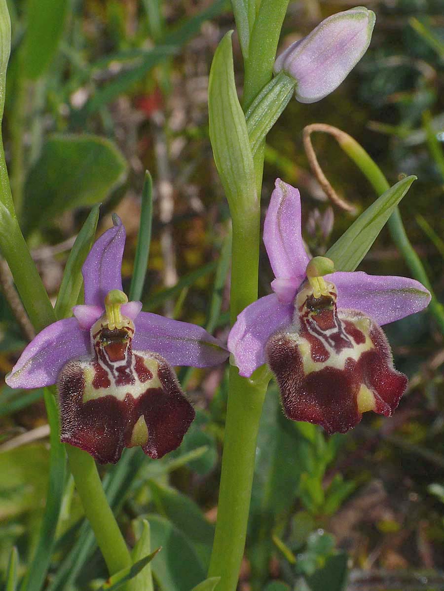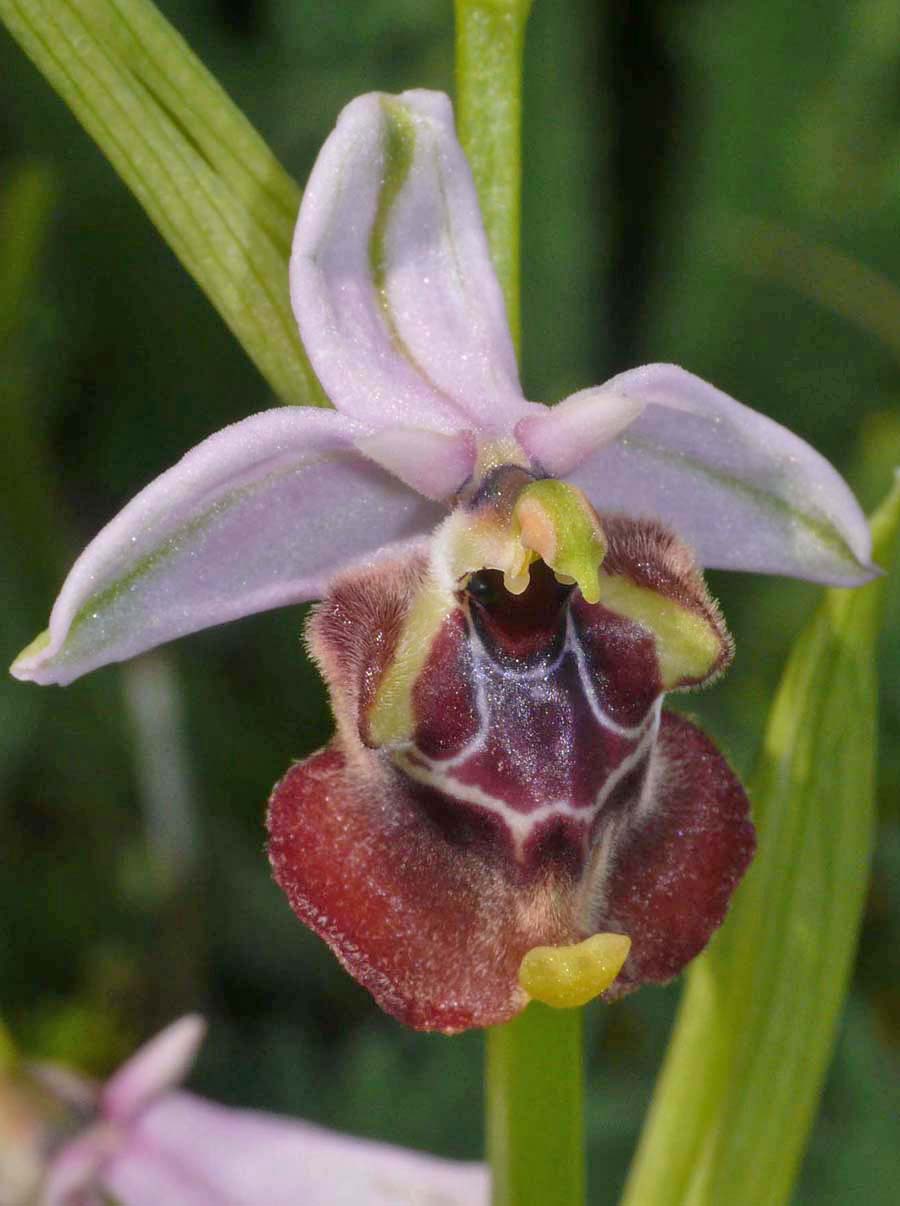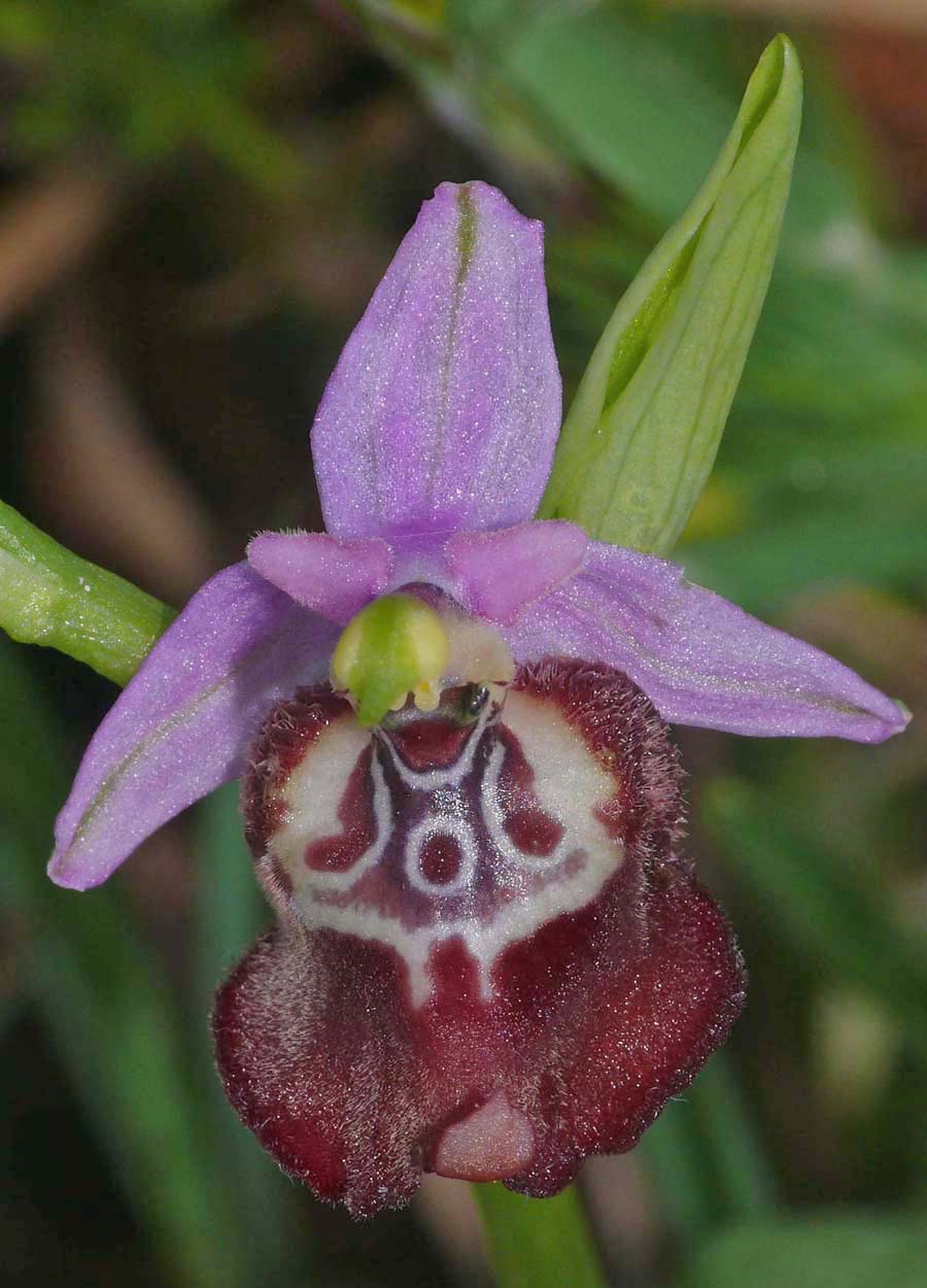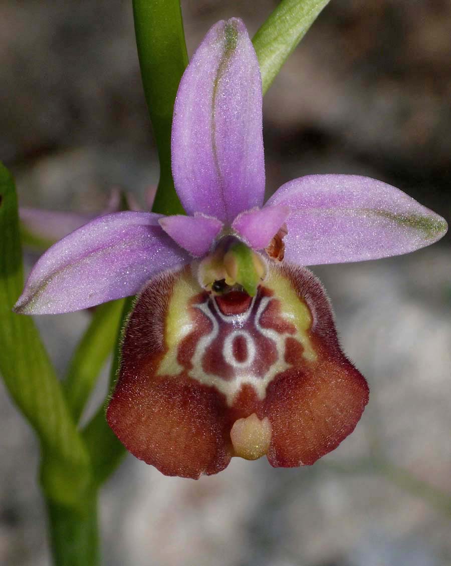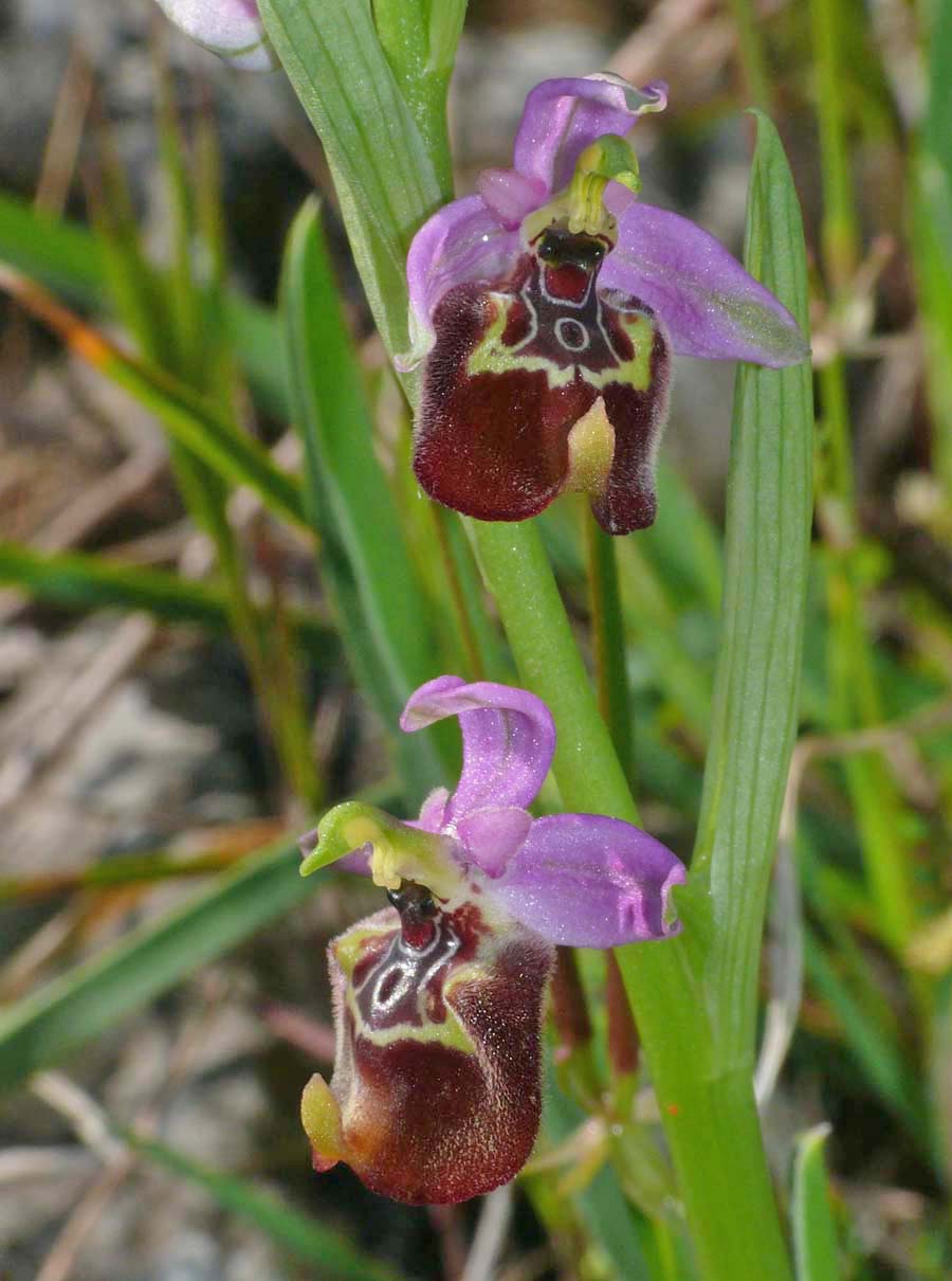 This is one of seven members of the O. fuciflora group that was first formally described by Bartolo and Pulvirenti in 1997 from the Siracusa region of Sicily. O. calliantha is endemic to that island where although often plentiful in its preferred locations, is extremely local in its overall distribution. Its name means "beautiful flower" and it undoubtedly lives up to this title being both brightly coloured and distinctively marked. It is perhaps the easiest of the Sicilian fuciflorids to recognize, though as with the other species, it frequently suffers genetic interference which can complicate identification. Several of these pictures depict specimens which exhibit some non typical features and probably fall into this category. The "typical" O. calliantha has pink to purple sepals, matching petals and a boldly patterned speculum with strong white to lemon yellow lining that can sometimes be so thick as to form a complete blotch. Anyone familiar with O. candica could be forgiven for thinking they were back in the Aegean as the two species are morphologically remarkably similar. This Ophrys has variously been regarded over the years as a sub species of O. fuciflora, O.oxyrrhynchos and unsurprisingly O. candica. A fellow Sicilian endemic, O. biancae is an adept impersonator of all its fuciflorid cousins but is both a significantly smaller and earlier flower. As with O. lacaitae, O. calliantha is a late starter and will be coming into bloom when O. biancae is well past its best. The illustrations are all from the south east of Sicily, east of Ferla and date from the last week of April. |