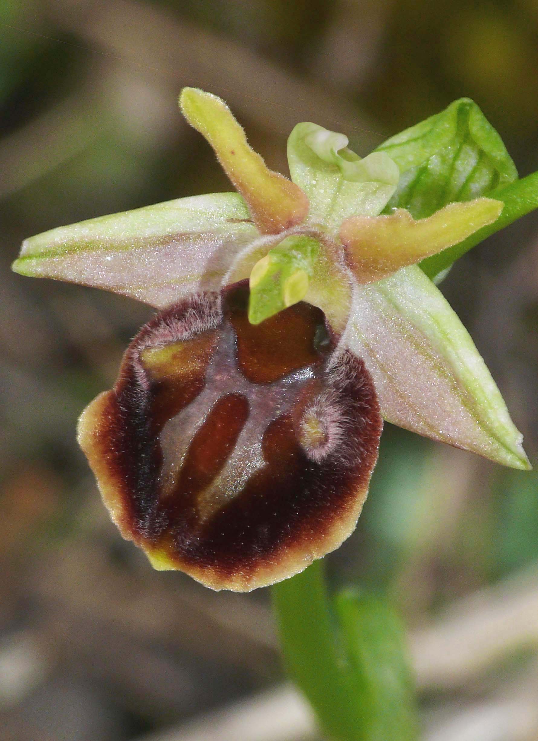 O. chaonica was first described from Epirus by Kreutz and Heitz as O. mammosa subsp. parviflora in 2013 and subsequently promoted to full species status by Delforge in 2015. Its name refers to the ancient region of Chaonia in north western Epirus, northern Greece. This is a member of the sometimes confusing O. mammosa group but unlike many of its cousins, one which exhibits several features that simplify identification. The first and most obvious characteristic is that it's very small in all its parts, the plant is invariably less than 20cms in height and the flowers are few in number (two to four), not much more than half the size of the bigger but similar O. epirotica. The lateral sepals are long, green flushed pink and swept back whereas the dorsal sepal is bent forward, often strongly so. The lip is heart shaped with a yellow margin and moderately developed protuberances that are glabrous inside and very hairy on the outside. Its distribution is not fully understood but is known with certainty from a triangular area formed by Grevena, Ioannina and Larissa where it prefers grassland and waste areas with some shrub cover, normally on calcareous soils. Although several populations have been reported, the individual plants within them is generally small. The photo dates from the end of April at which time flowering was just beginning. |