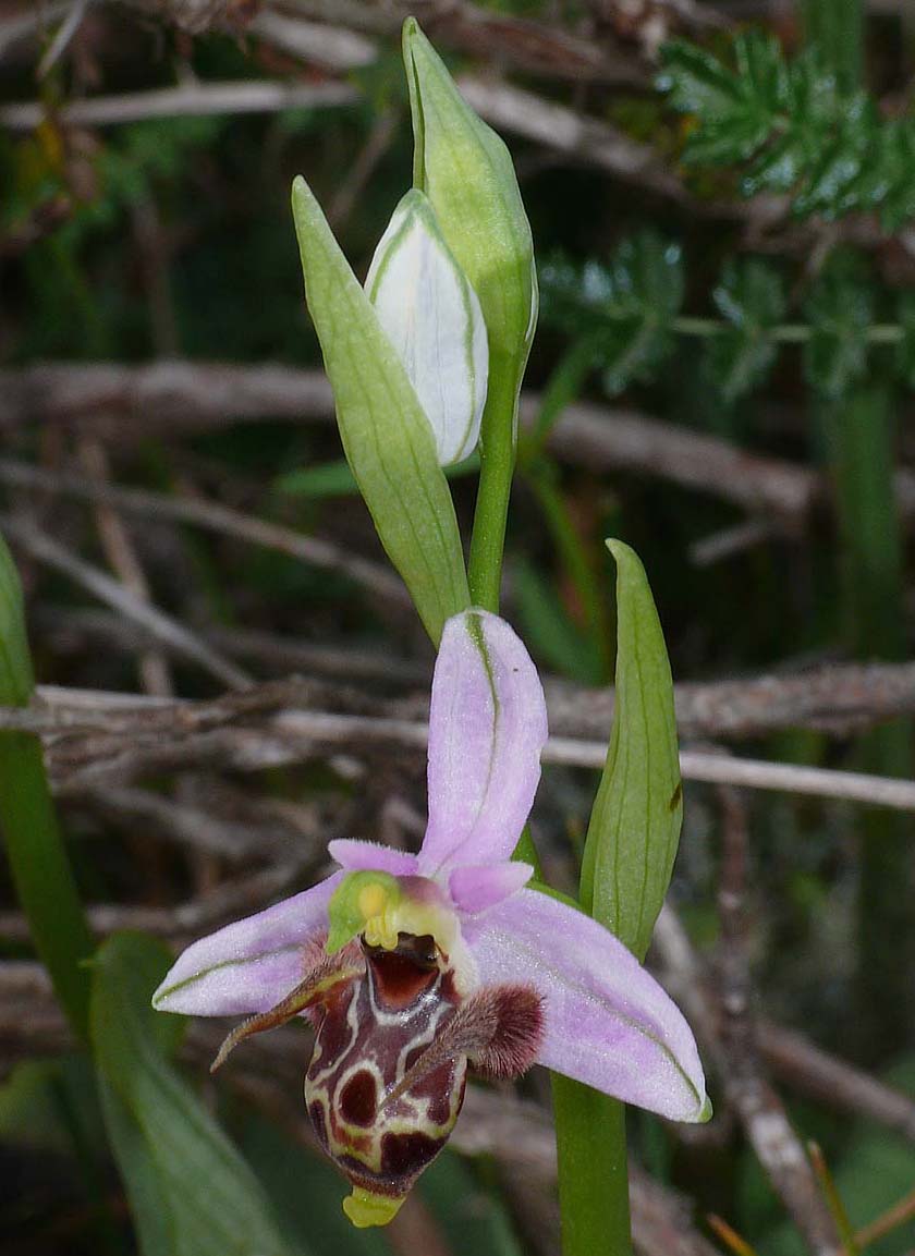 O. crassicornis was first described from the Ionian island of Lefkada, as a form of O. cornuta by Renz in 1928 and promoted to full species status in 2004 by Devillers and Devillers-Terschuren. Its name means "thick horned" and is a reference to the well developed protuberences of the species. It's a member of the large O. oestrifera group which has been the recipient of much study and attention over the last two decades but none of which has satisfactorily clarified significant taxonomic questions, particularly as they relate to the group in the eastern Mediterranean. The distribution and very existence of O. crassicornis has been called into question over recent years. The description that follows reflects one of the views, that it is a valid species with a range encompassing the southern Ionian islands and adjacent areas of the Greek mainland and northern Peloponnese. Distinguishing this species from O. cerastes is a job for the experts and in the absence of pollinator identification the plants depicted here have been selected with reference to the parameters of their known distribution. The photographs all come from the island of Cephalonia where only O. stavri and O. cephaloniensis present challenges to identification though both are extremely rare and relatively easy to differentiate. It is worth mentioning however that O. crassicornis grows alongside both these taxons in some sites. O, crassicornis exhibits a slightly larger flower than any of the previously mentioned species and is also a more robust plant with a basal rosette of silvery green leaves. The pictures date from the first week of April. |