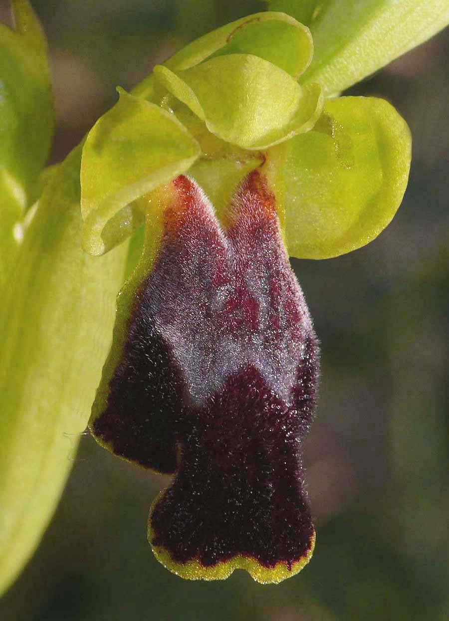 These studies resulted in the repositioning of some species and also the description of new species such as O. delforgei and O. malacitana. In the case of O. forestieri it emerged that the small flowered variant was a separate taxon and subsequently named O. delforgei whilst the larger flowered variant retained the name of O. forestieri. It was further concluded that plants in Southern France and northern Spain formerly regarded as O. lupercalis, were in fact synonymous with O. forestieri. At present O. lupercalis still seems to be regarded as a valid species elsewhere in its range but this position is unclear and requires study. O. forestieri is now included in the O. obaesa group and thought to be closely related to both O. sulcata and O. vasconica. It is a fairly robust, tall stemmed plant with stalked flowers appearing at short intervals up the stem. The flowers are large and usually present a more colourful appearance than other Pseudorchis with which it can sometimes grow. This impression is created by the normally wide yellow margin and reddish tones that often permeate the speculum. O. forestieri is an early flowerer and as was the case with the plants illustrated here, can be in full flower by the middle of March. The pictures come from the Marseille region of Southern France and also from populations on the northern coast of Spain which cannot as yet be confirmed as being part of this species newly defined distribution. |