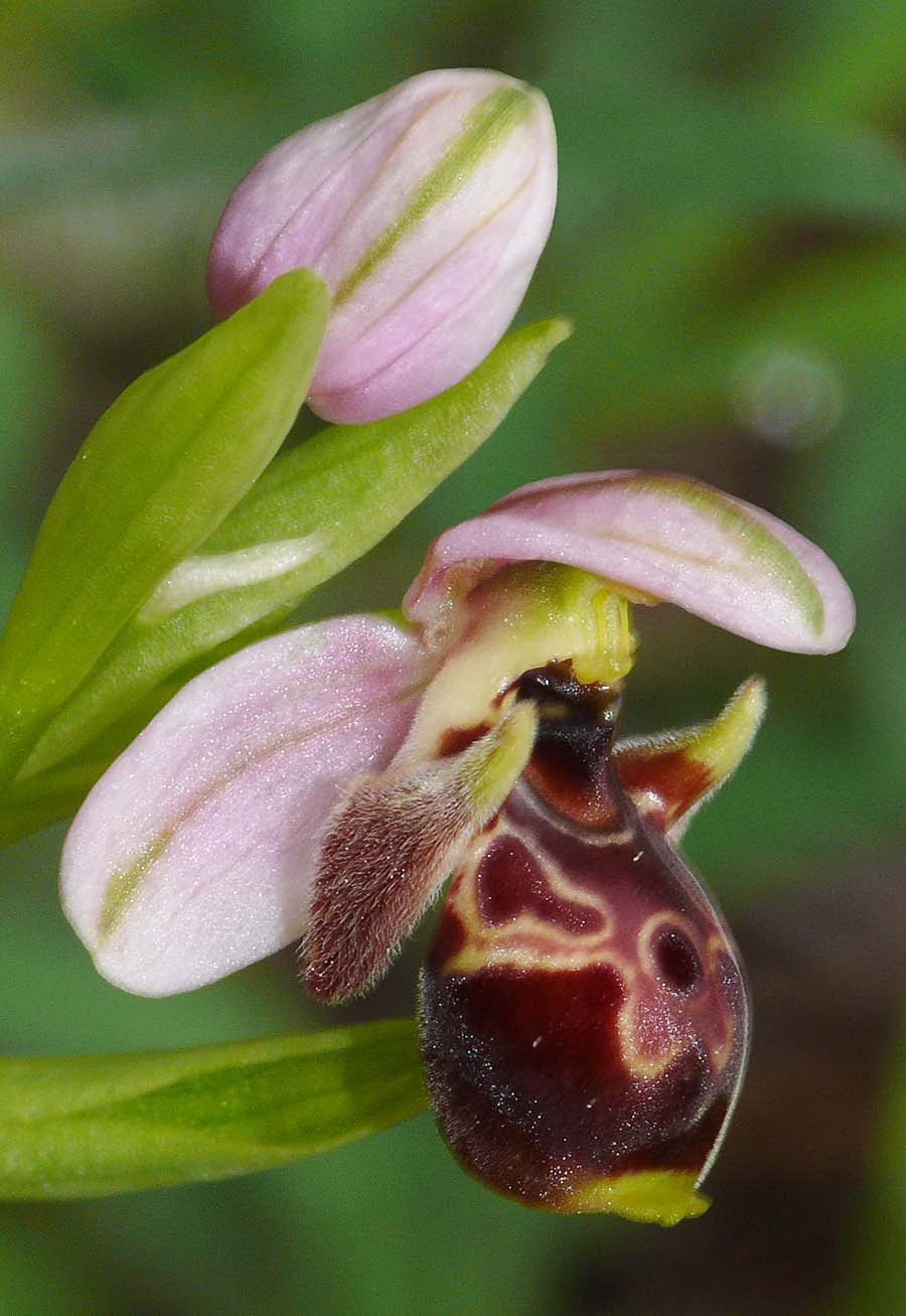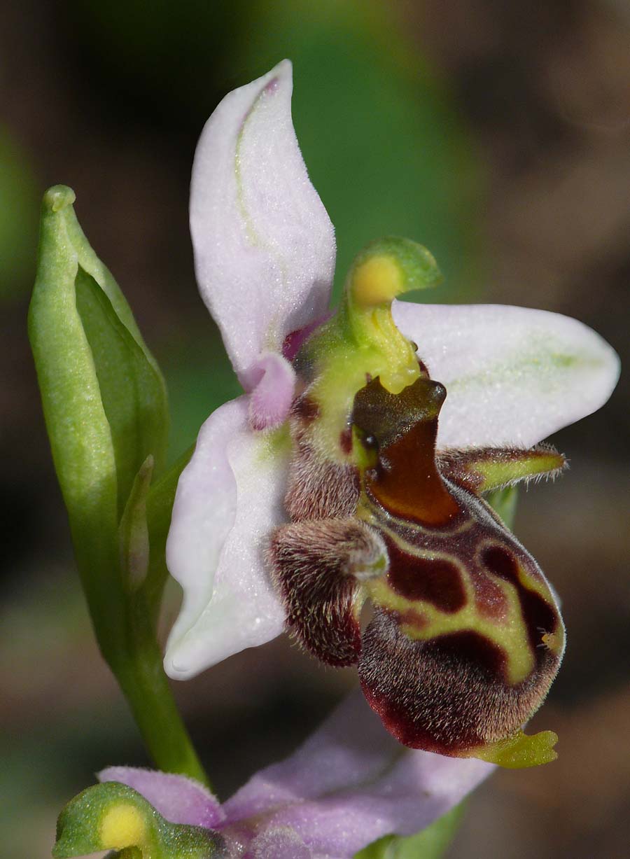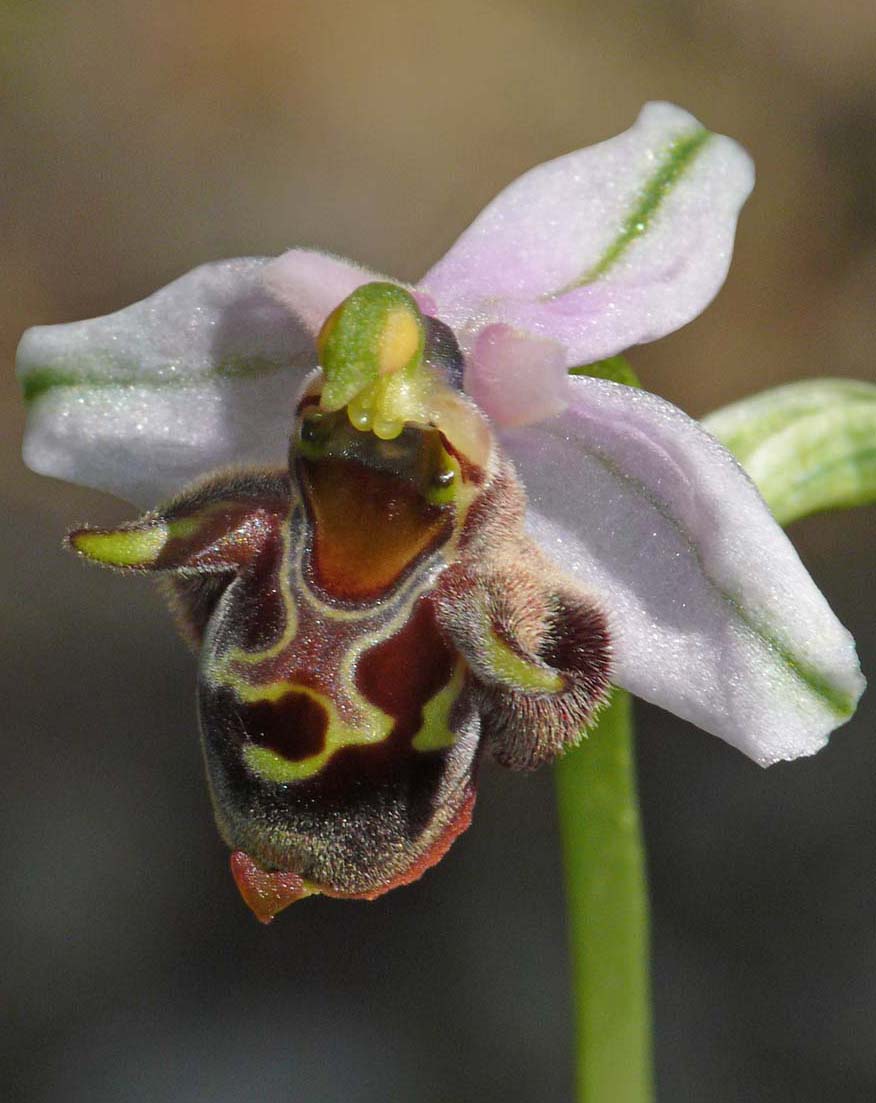 This was the prevailing view until recently when the opinion was reversed and the two species were again regarded as separate taxons. This view is not at all universally endorsed with many pointing to the fact that they share the same pollinator and that both are reported as very variable with formal descriptions that do not satisfactorily distinguish them. These two species are extremely difficult to differentiate and the authors cannot present this page as authoritative. O. heterochila was originally thought to be endemic to Rhodes but has subsequently been discovered on other of the Aegean islands, notably Chios, Samos and Lesbos. It's a member of the eastern Mediterranean O. heldreichii group, which although local, can be abundant in a variety of habitats. A key differentiator between O. heterochila and O. dodekanensis is flowering time with the latter declining as the former first appears in mid March. The former also differs in that its lip shows a tendency towards a fuciflorid form whereas the latter generally appears long and thin due to the strongly reflexed lobes. Both species may be differentiated from the similar O. minutula and O. cornutula by the less colourful, drabber speculum. The pictures are from Rhodes, Samos and Chios, dating from the first week of April. |