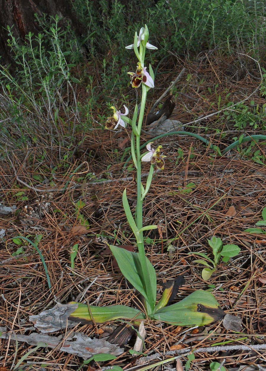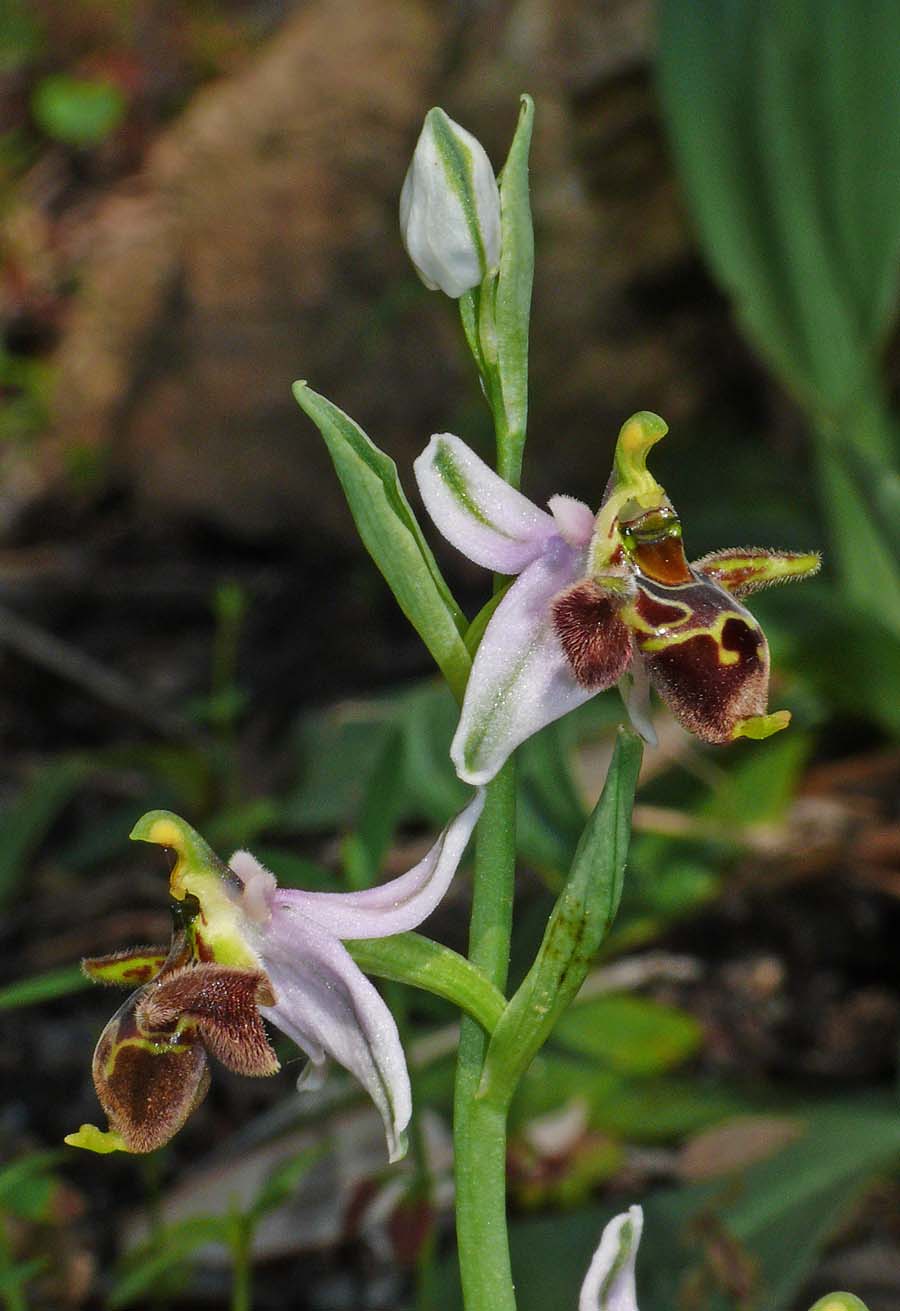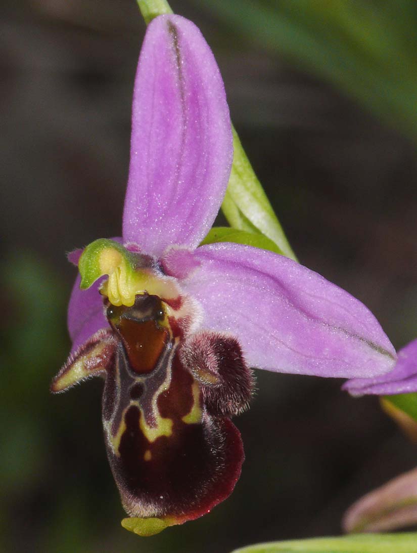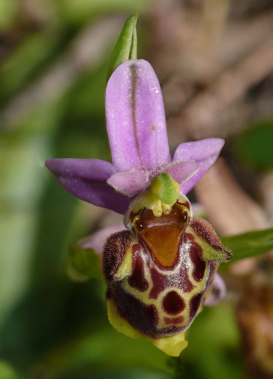 This was the prevailing view until recently when the opinion was reversed and the two species were again regarded as separate taxons. This view is not at all universally endorsed with many pointing to the fact that they share the same pollinator and that both are reported as very variable with formal descriptions that do not satisfactorily distinguish them. These two species are extremely difficult to differentiate and the authors cannot present this page as authoritative. O. heterochila was originally thought to be endemic to Rhodes but has subsequently been discovered on other of the Aegean islands, notably Chios, Samos and Lesbos. It's a member of the eastern Mediterranean O. heldreichii group, which although local, can be abundant in a variety of habitats. A key differentiator between O. heterochila and O. dodekanensis is flowering time with the latter declining as the former first appears in mid March. The former also differs in that its lip shows a tendency towards a fuciflorid form whereas the latter generally appears long and thin due to the strongly reflexed lobes. Both species may be differentiated from the similar O. minutula and O. cornutula by the less colourful, drabber speculum. The pictures are from Rhodes, Samos and Chios, dating from the first week of April. |