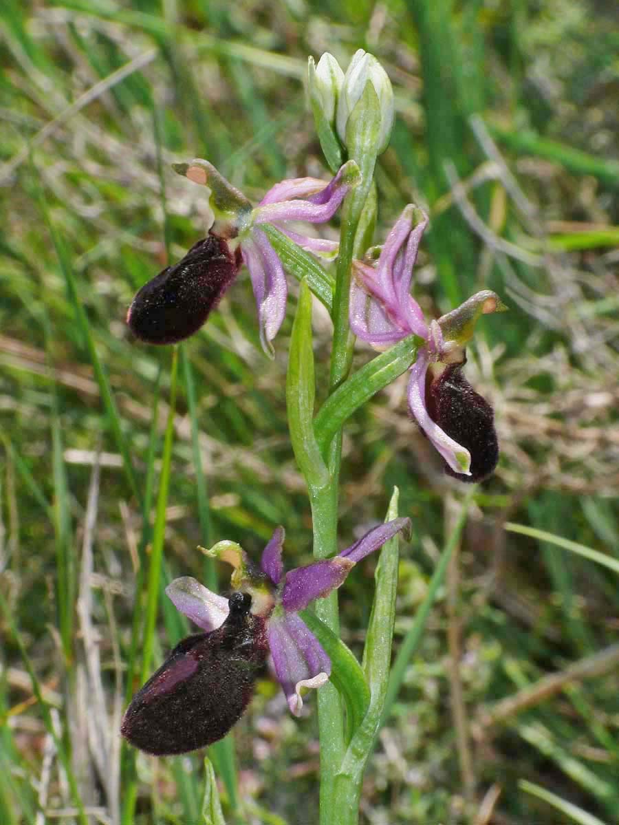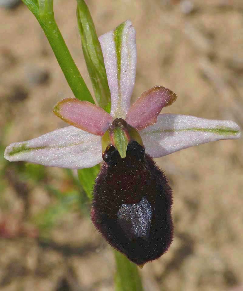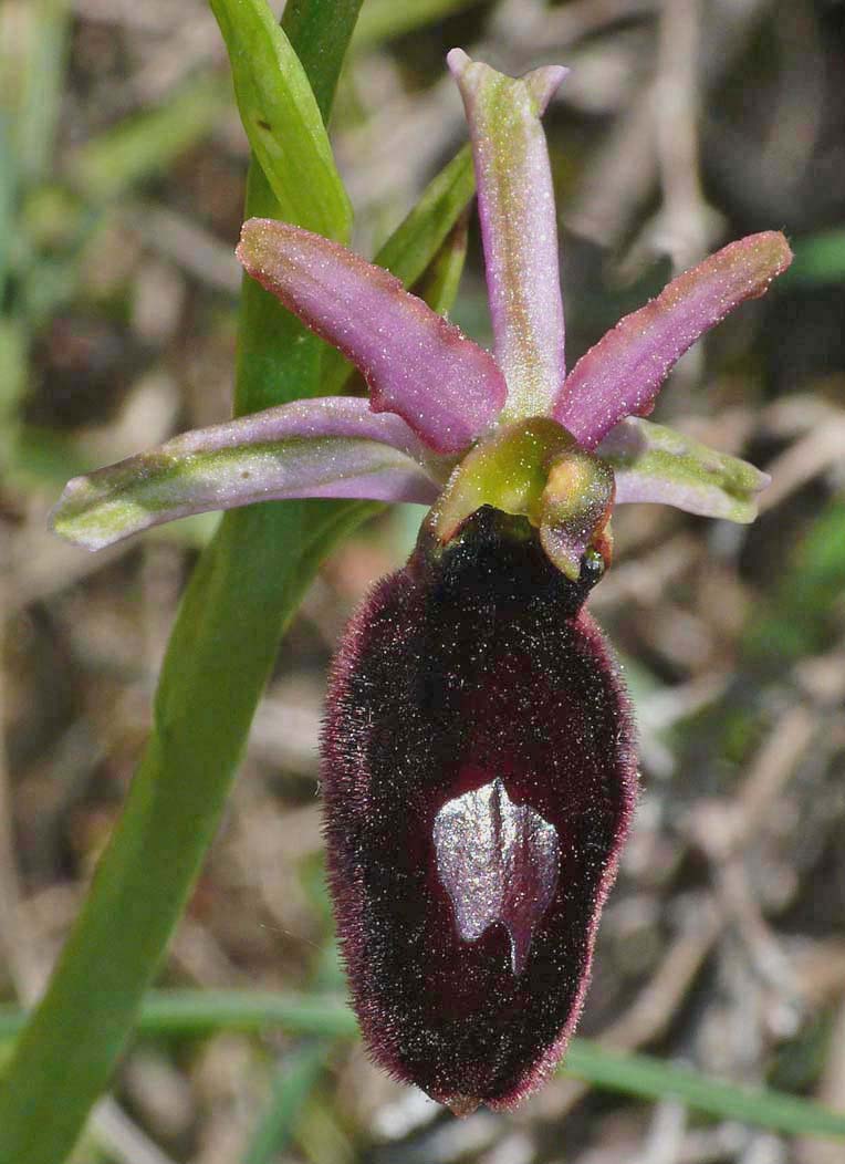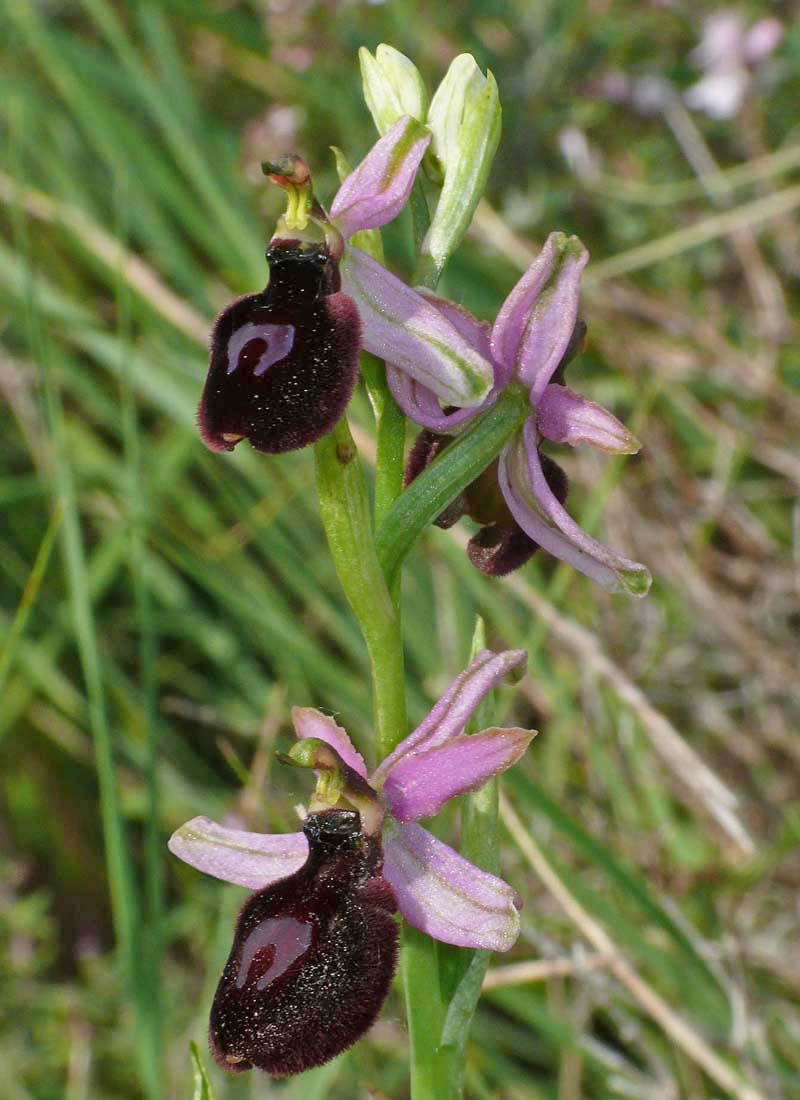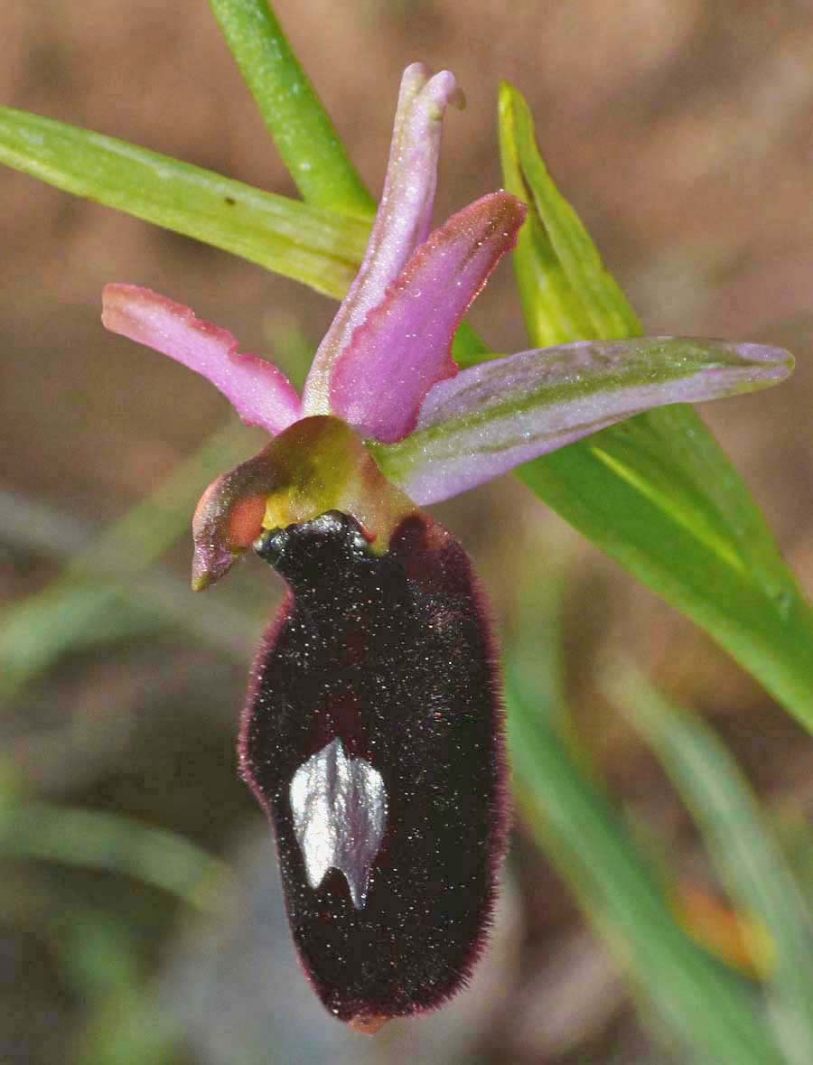 O. aurelia is distributed from Bouches-du-Rhone through the coastal Provinces as far as the Portofino peninsula in Italy. Its range is not thought to overlap with O. magniflora whose distribution is confined to the more south westerly provinces of France, primarily Aude. Some botanical opinion believe these two species are simply geotypes and morphologically there is little to separate the two large flowered taxons. O. catalaunica is confined to a limited area in Catalonia and interestingly, in just a few sites across the border in Corbieres. Once again some experts do not accept the distinction between O. catalaunica and O. magniflora and thus by extension, there must be a valid case to consider all three species synonymous. O. magniflora is, as already mentioned, a large flowered species with a lip that is on average some 3mm longer than that of O. catalaunica. Despite much research however, it is hard to find consistent supporting evidence for other suggested differences, such as petal width and speculum position. Study of many photographs of these species seem to show a good deal of variation but few characteristics that are unique to any one of them . An exception to this is the frequently observed deeper perianth colouration of O. aurelia. The photos here depict large flowered plants from Aude which following current taxonomy, are therefore assumed to be O. magniflora, they date from the middle of May. |