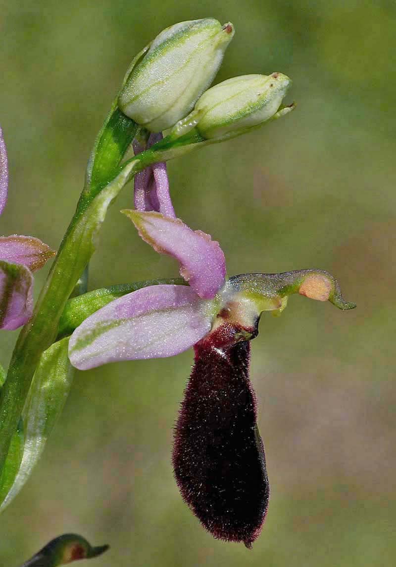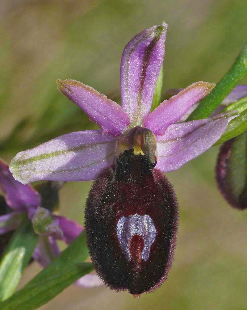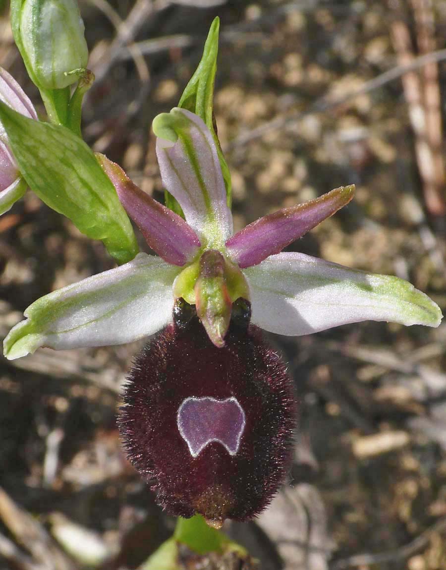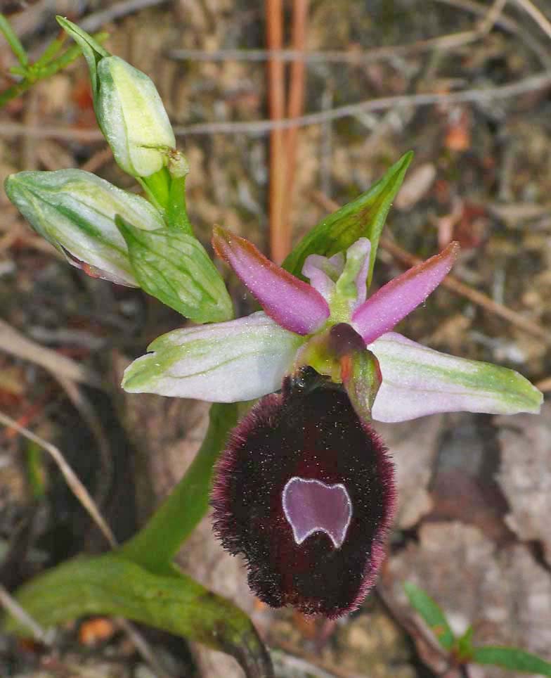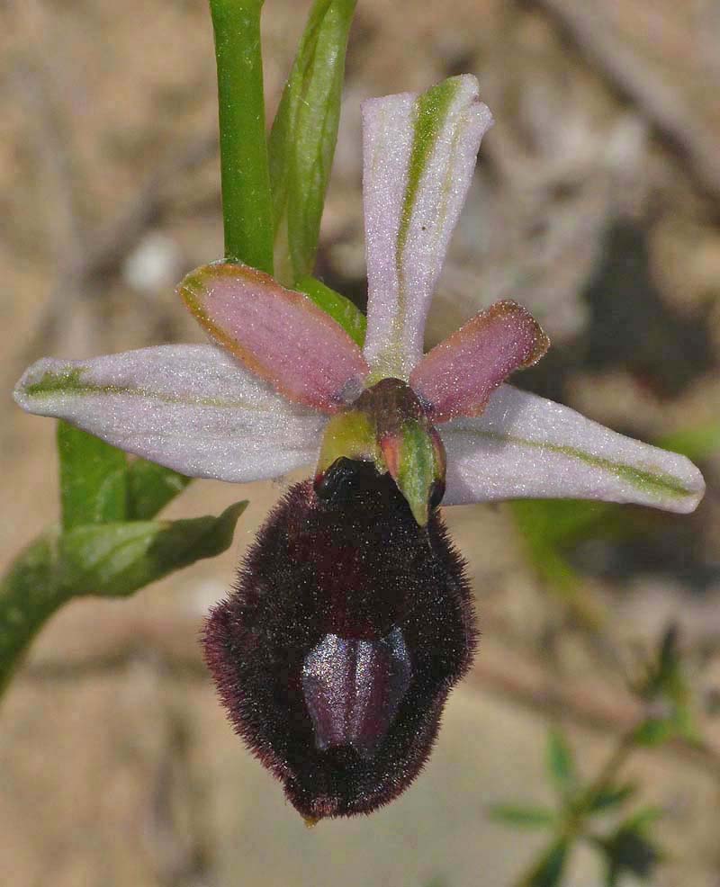O. aurelia is distributed from Bouches-du-Rhone through the coastal Provinces as far as the Portofino peninsula in Italy. Its range is not thought to overlap with O. magniflora whose distribution is confined to the more south westerly provinces of France, primarily Aude. Some botanical opinion believe these two species are simply geotypes and morphologically there is little to separate the two large flowered taxons. O. catalaunica is confined to a limited area in Catalonia and interestingly, in just a few sites across the border in Corbieres. Once again some experts do not accept the distinction between O. catalaunica and O. magniflora and thus by extension, there must be a valid case to consider all three species synonymous. O. magniflora is, as already mentioned, a large flowered species with a lip that is on average some 3mm longer than that of O. catalaunica. Despite much research however, it is hard to find consistent supporting evidence for other suggested differences, such as petal width and speculum position. Study of many photographs of these species seem to show a good deal of variation but few characteristics that are unique to any one of them . An exception to this is the frequently observed deeper perianth colouration of O. aurelia. The photos here depict large flowered plants from Aude which following current taxonomy, are therefore assumed to be O. magniflora, they date from the middle of May. |