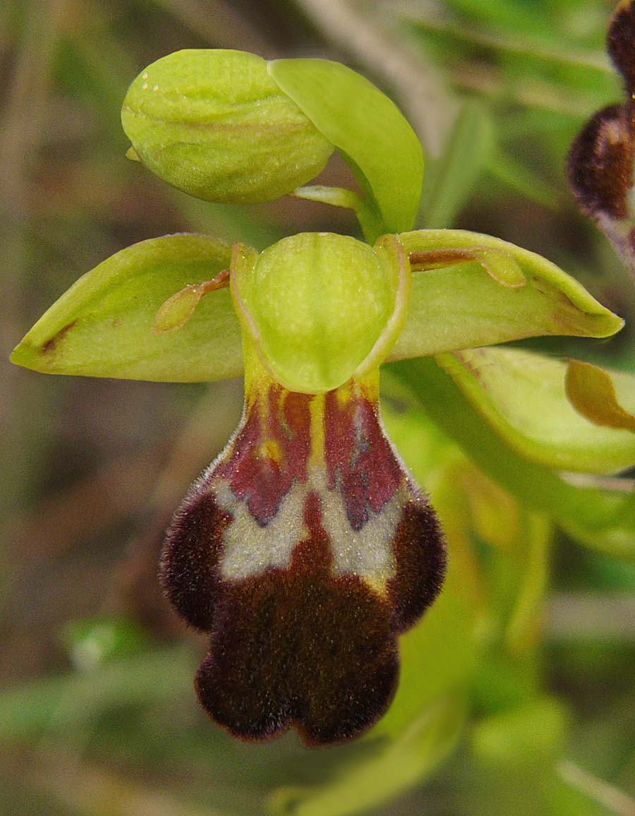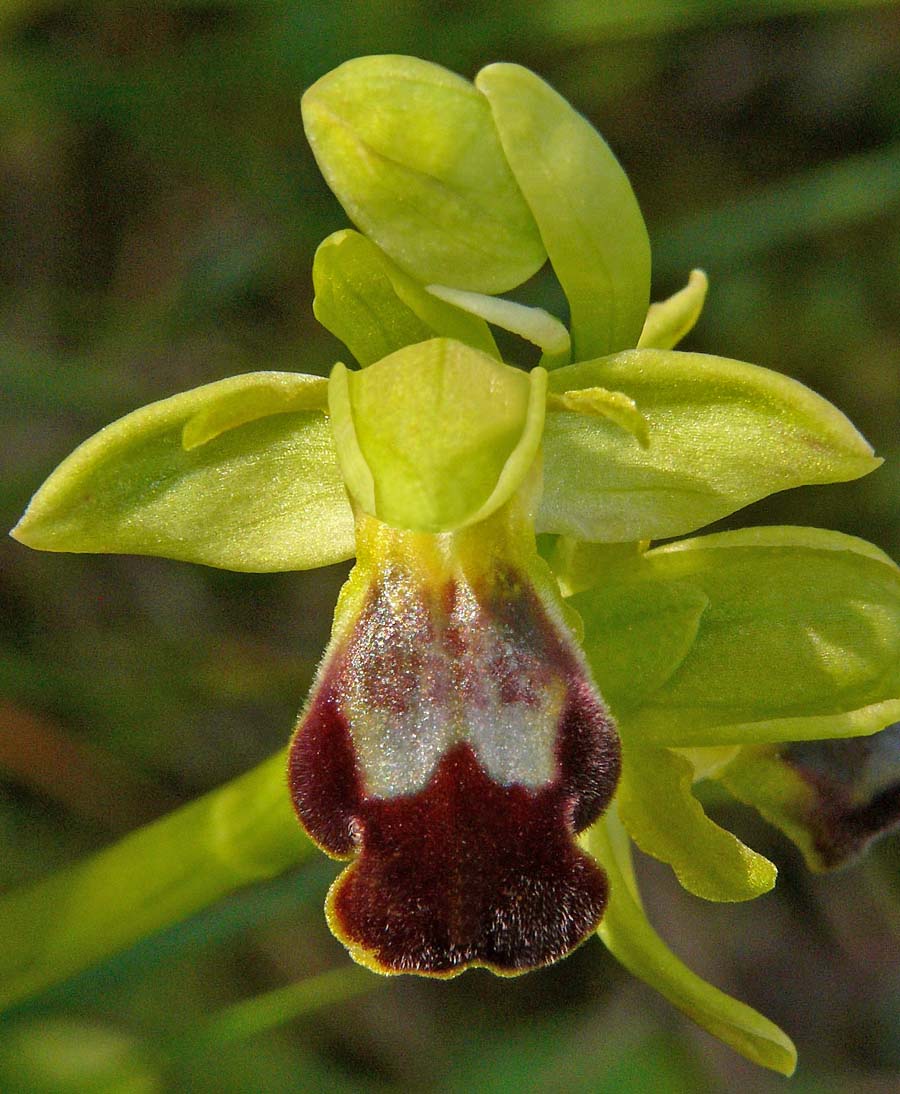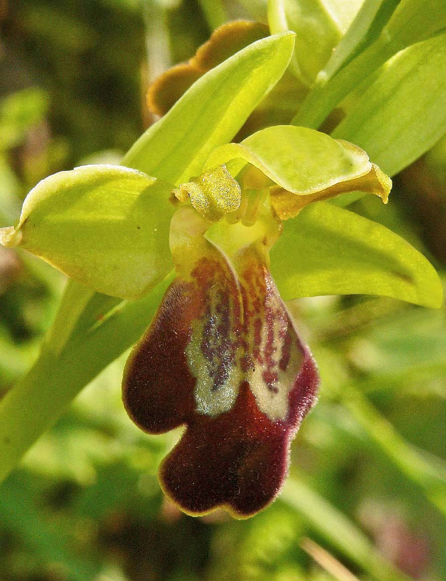 In 2015, Paulus and Hirth produced research that established this orchid to be a widespread species throughout the eastern Aegean and that it encompassed a range of Pseudphrys, then variously considered to be late flowering forms of O. sitiaca or O. leucadica and separate taxons including O. parosica and O. phaseliana. It was proven by exhaustive testing that they all shared the same pollinator, Andrena gravida and therefore, despite significant morphological differences were a single species. Delforge first described O. pelinaea in 2007 from the island of Chios where it was found on Mount Pelineo but since then it has been discovered to be widespread and common on many other eastern Aegean islands and probably also occurs in western Turkey. The illustrations are from Lesbos and Chios, demonstrating very well the significant variation in appearance of this species. It is thought to be of hybrid origin, with the hybridogenous O. sitiaca as one of its forebears. Its perhaps unsurprising therefore that O. pelinaea is so variable. Perhaps the most consistent identifying feature of O. pelinaea is the broad silvery omega at the tip of the speculum, very reminiscent of O. sitiaca but with a pronounced V shaped groove in the basal area. The lip is three lobed and generally with a yellow or orange margin though this feature is often disguised by the strong reflexation. As with other members of the O. omegaifera grouping, it is both large flowered and a particularly robust plant. The photographs date from the middle of April. |