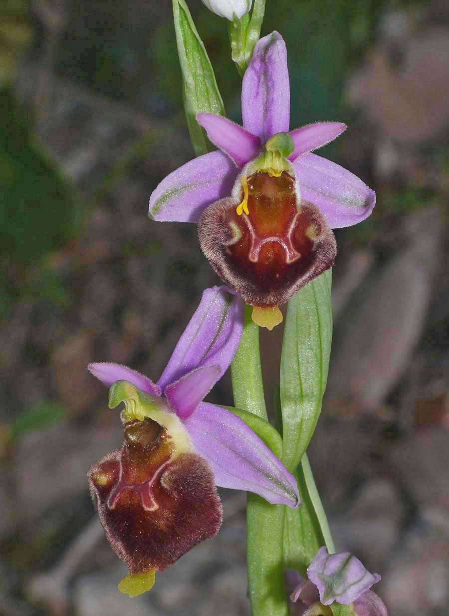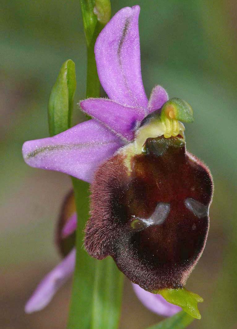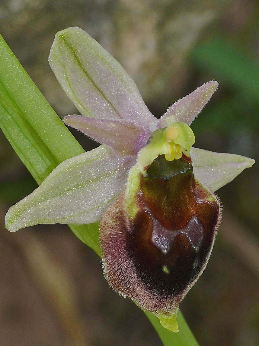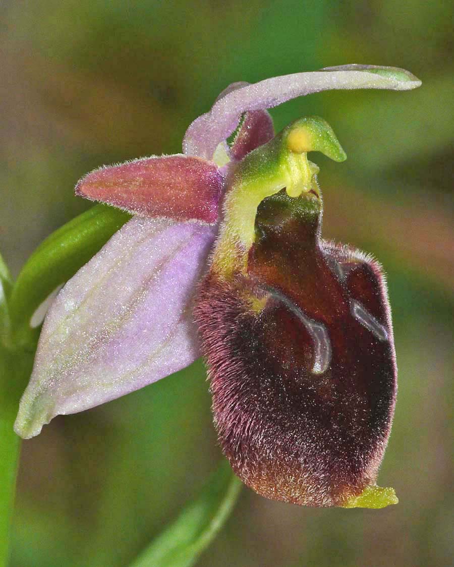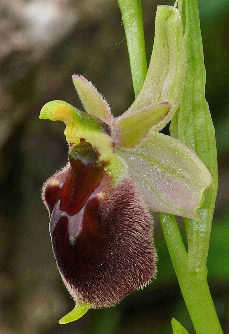 | This is a member of the fourteen strong O. argolica group which was first identified by Nelson as a subspecies of O. fuciflora. This was subsequently corrected and formally described as O. pollinensis by Devillers and Devillers-Terschuren from Salerno in 2000. O. pollinensis is an Italian endemic whose range is limited to the west of the country, south of Salerno and extending as far as northern Calabria. Much of this area is made up of the Cilento and Pollino National Parks and indeed the name of this Ophrys refers to its association with Mount Pollino. It is a hybridogenous species with O. crabronifera, O. biscutella and a member of the O. fuciflora group as progenitors. Although a distinctive orchid, it is extremely variable and as can be seen from the photos, often exhibit features more usually associated with its O. fuciflora heritage, notably the speculum which unusually for the O. argolica group can often comprise a conventional H pattern, attached at the base and surrounding a reddish basal field. In northerly parts of its range, there is a marginal overlap with close relative O. crabronifera, flowering times do however differ with O. pollinensis being significantly later, even at lower altitudes. Whilst in typical forms identification can be straightforward, some variations exhibit strong morphological similarity to O. crabronifera and its unsurprising that some authorities believe the two are in fact conspecific. Others accept the distinction and further assert that there is no overlap, with O. pollinensis completely replacing O. crabronifera as one travels south. The pictures are all from the Cilento National Park in Campania, dating from the last week of April. |  | |