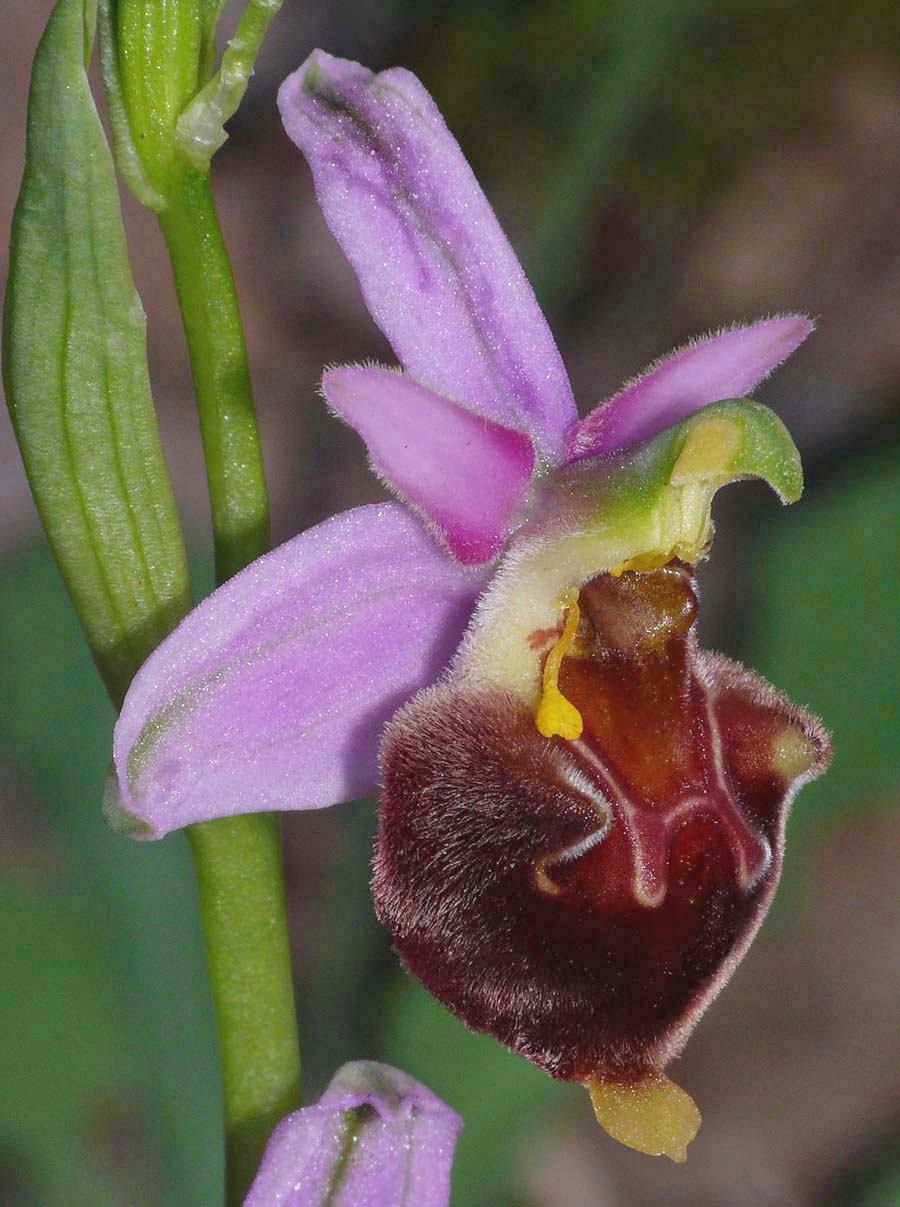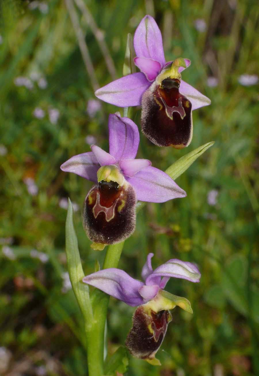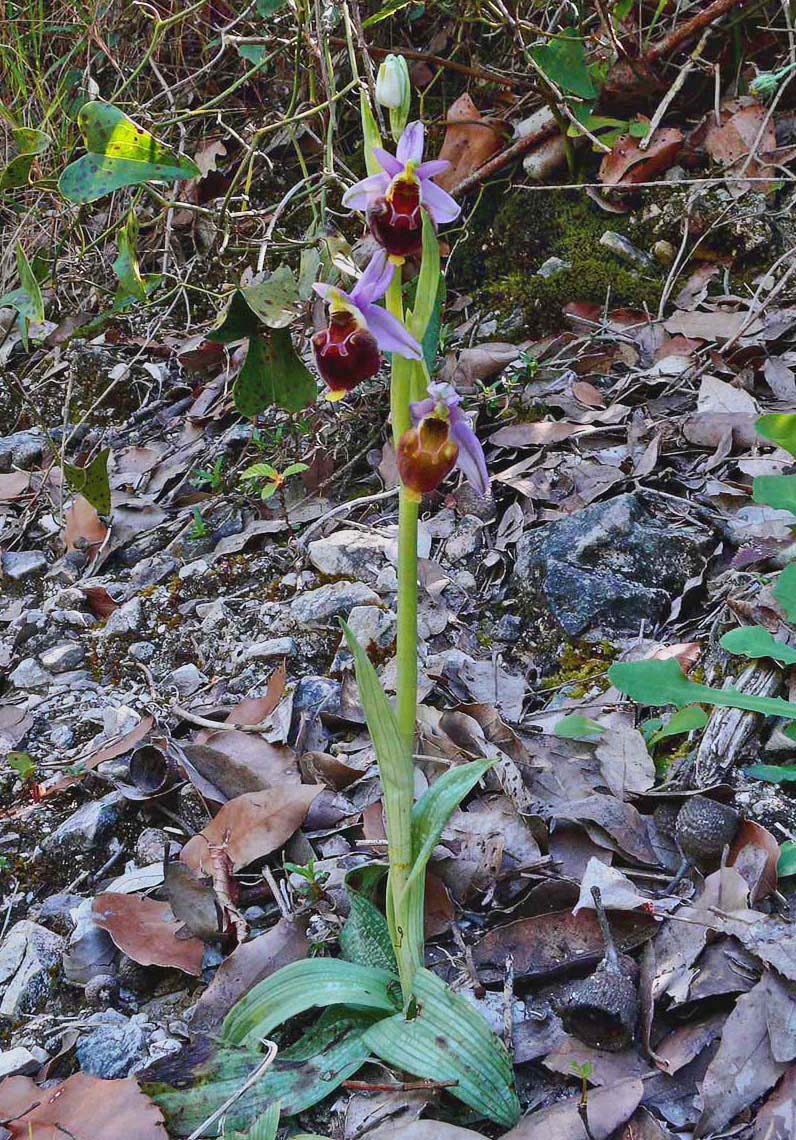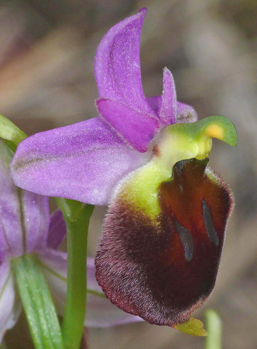 | This is a member of the fourteen strong O. argolica group which was first identified by Nelson as a subspecies of O. fuciflora. This was subsequently corrected and formally described as O. pollinensis by Devillers and Devillers-Terschuren from Salerno in 2000. O. pollinensis is an Italian endemic whose range is limited to the west of the country, south of Salerno and extending as far as northern Calabria. Much of this area is made up of the Cilento and Pollino National Parks and indeed the name of this Ophrys refers to its association with Mount Pollino. It is a hybridogenous species with O. crabronifera, O. biscutella and a member of the O. fuciflora group as progenitors. Although a distinctive orchid, it is extremely variable and as can be seen from the photos, often exhibit features more usually associated with its O. fuciflora heritage, notably the speculum which unusually for the O. argolica group can often comprise a conventional H pattern, attached at the base and surrounding a reddish basal field. In northerly parts of its range, there is a marginal overlap with close relative O. crabronifera, flowering times do however differ with O. pollinensis being significantly later, even at lower altitudes. Whilst in typical forms identification can be straightforward, some variations exhibit strong morphological similarity to O. crabronifera and its unsurprising that some authorities believe the two are in fact conspecific. Others accept the distinction and further assert that there is no overlap, with O. pollinensis completely replacing O. crabronifera as one travels south. The pictures are all from the Cilento National Park in Campania, dating from the last week of April. |  | |