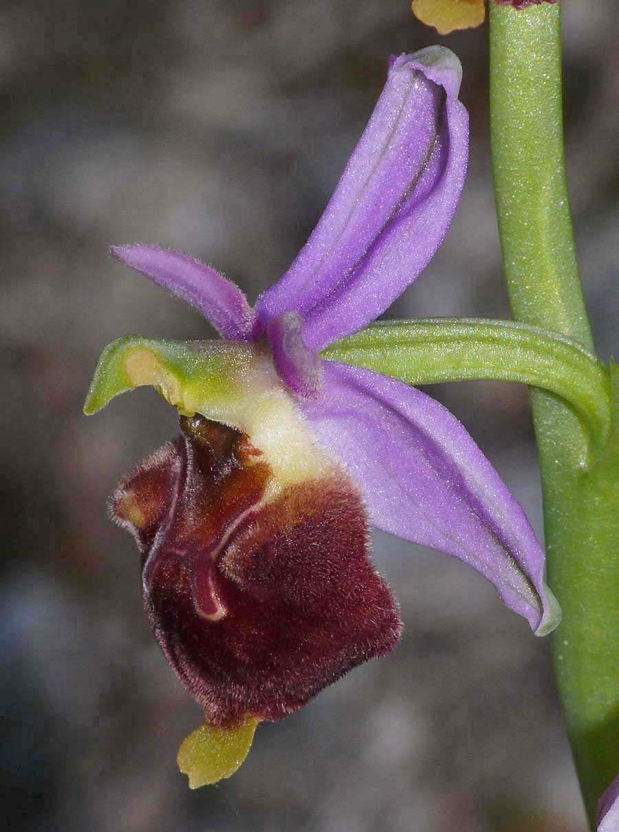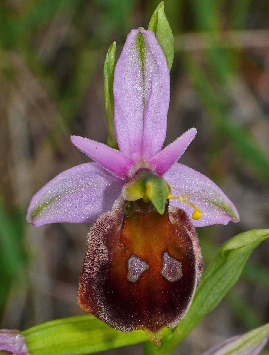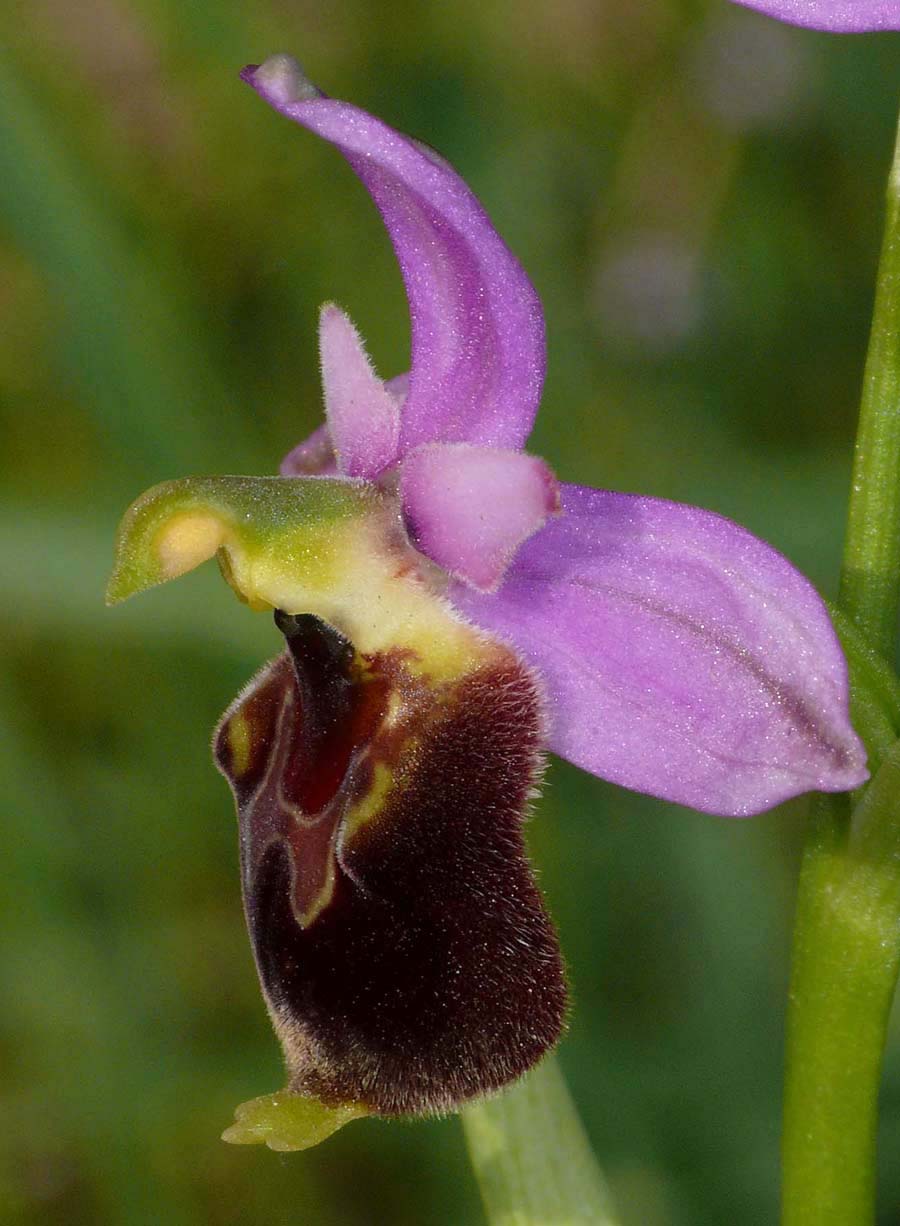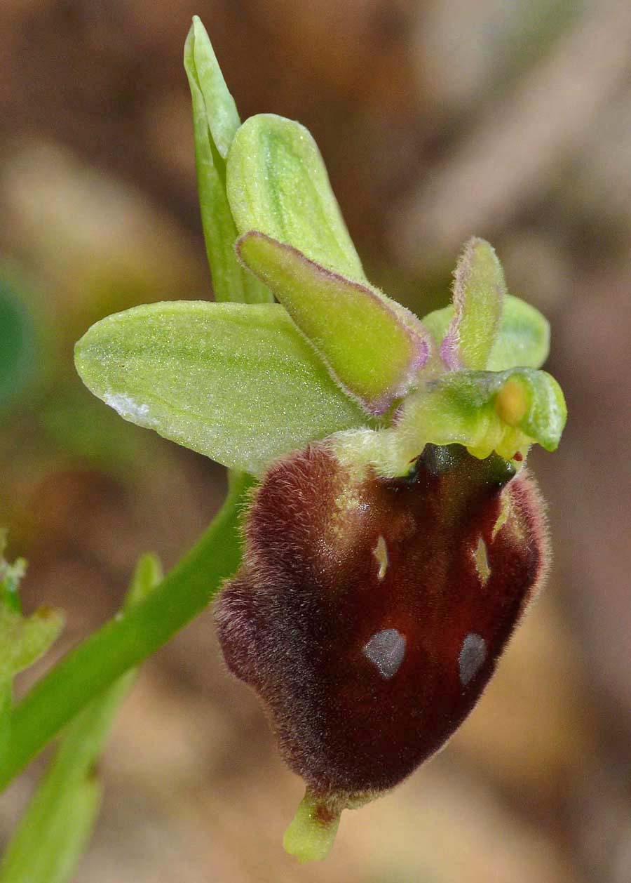 | This is a member of the fourteen strong O. argolica group which was first identified by Nelson as a subspecies of O. fuciflora. This was subsequently corrected and formally described as O. pollinensis by Devillers and Devillers-Terschuren from Salerno in 2000. O. pollinensis is an Italian endemic whose range is limited to the west of the country, south of Salerno and extending as far as northern Calabria. Much of this area is made up of the Cilento and Pollino National Parks and indeed the name of this Ophrys refers to its association with Mount Pollino. It is a hybridogenous species with O. crabronifera, O. biscutella and a member of the O. fuciflora group as progenitors. Although a distinctive orchid, it is extremely variable and as can be seen from the photos, often exhibit features more usually associated with its O. fuciflora heritage, notably the speculum which unusually for the O. argolica group can often comprise a conventional H pattern, attached at the base and surrounding a reddish basal field. In northerly parts of its range, there is a marginal overlap with close relative O. crabronifera, flowering times do however differ with O. pollinensis being significantly later, even at lower altitudes. Whilst in typical forms identification can be straightforward, some variations exhibit strong morphological similarity to O. crabronifera and its unsurprising that some authorities believe the two are in fact conspecific. Others accept the distinction and further assert that there is no overlap, with O. pollinensis completely replacing O. crabronifera as one travels south. The pictures are all from the Cilento National Park in Campania, dating from the last week of April. |  | |