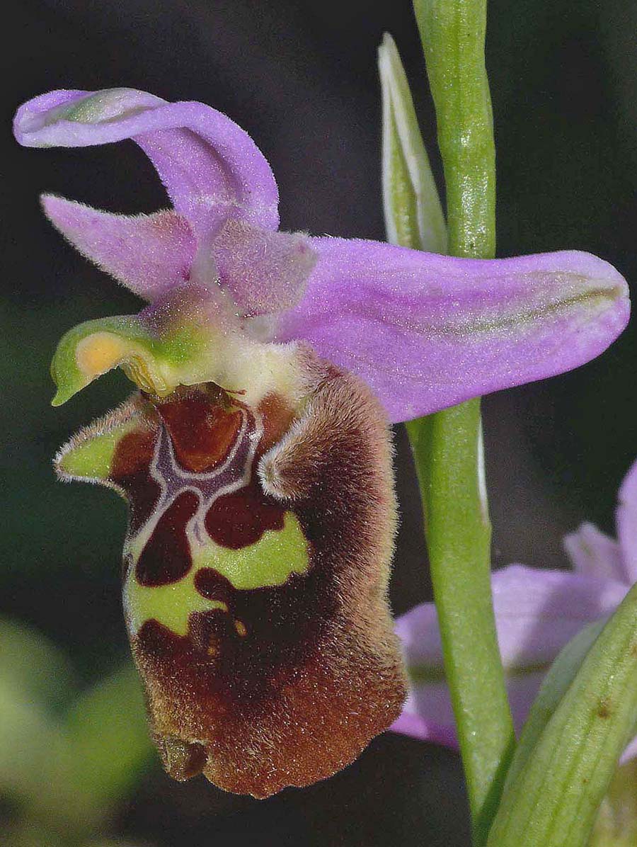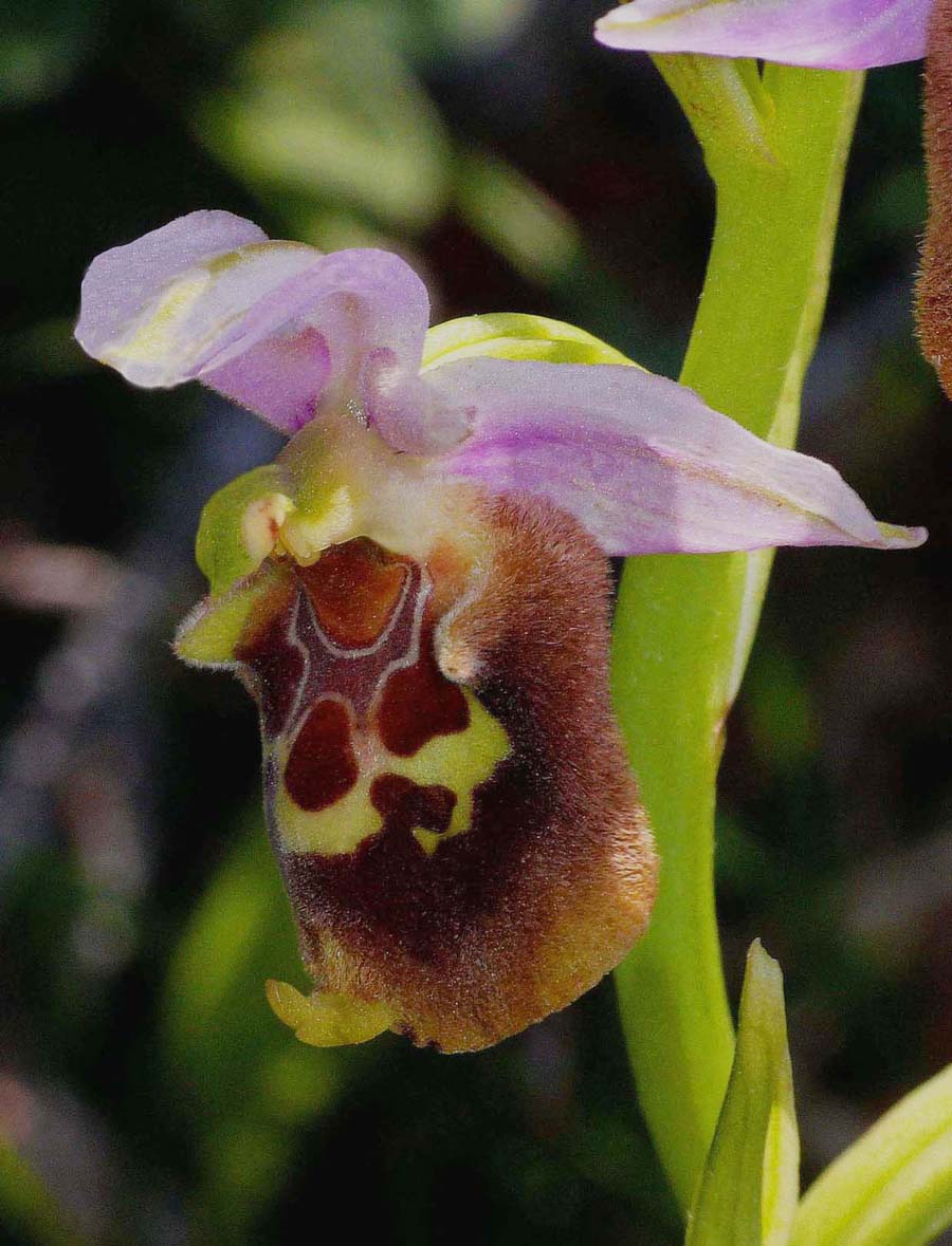 It is found in parts of the Cyclades and on the Dodecanese islands of Rhodes, Samos and Kos, though it's widely acknowledged that its range may be wider. As mentioned above, the key distinguishing feature of this species is the lip, in which the margins are strongly recurved and then flare to form a petticoat like frill around the distal part of the flower. The speculum is extensive, encompassing most of the labellum but rarely particularly complicated, consisting of bold cream or yellowish lining and commonly with multiple oselli. O. peudoapulica can be easily confused with O. calypsus and on Kos where the two species co-exist, there are examples of plants with intermediate features. Picture 3 from Rhodes depicts an example of this where the margins are reflexed but not flared, It also exhibits the "pot bellied" waistline typical of O. calypsus though according to some, this species is not now thought to occur on that island. There are undoubtedly still some issues in need of resolution. The photos come from the Dodecanese islands of Rhodes and Samos, dating from the second week of April. |