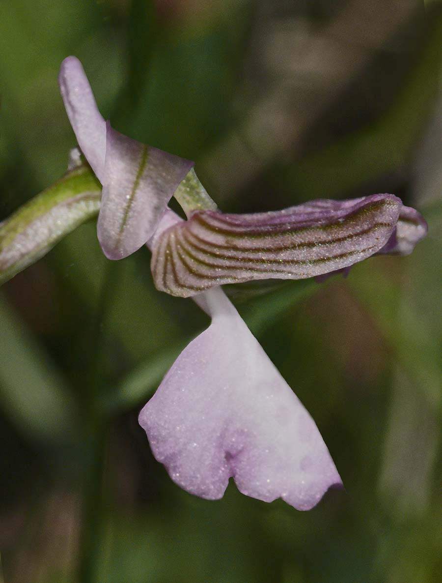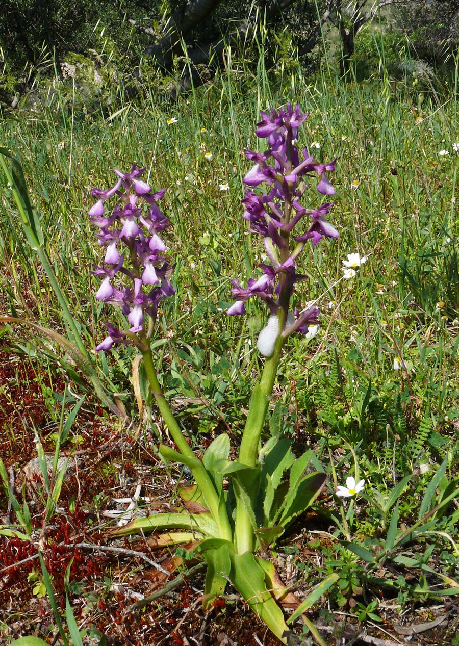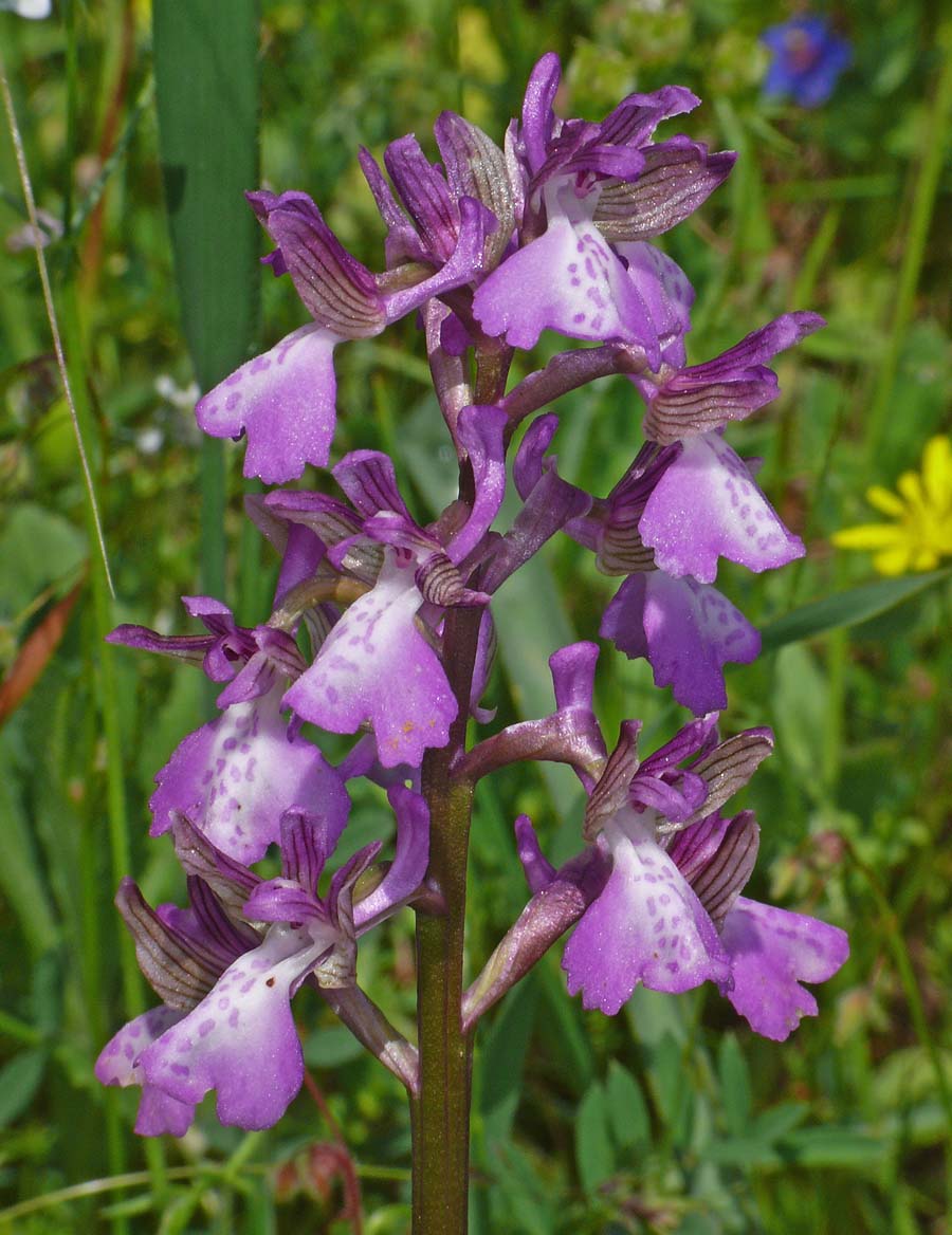 Its range is somewhat uncertain but as its name suggests, is widespread throughout the Caucasus, the near east, Balkans and has most recently been discovered in the islands of the Aegean and adjacent Turkish coast. It seems likely that A. morio subsp. caucasica is distributed more widely than this and further discoveries will almost certainly follow. The principle differences between this species and A. morio itself are as follows :- 1. The flower is smaller. 2. The lateral lobes of the lip are usually more tightly folded back. 3. The inflorescence generally carries more individual flowers. 4. The median lobe of the lip is longer than the lateral lobes. This latter feature is perhaps the most significant differentiating characteristic. With the similar and some consider debatable A. picta, the lobes tend to be of similar lengths and are always flared rather than folded back. Another worthwhile if not diagnostic feature of caucasica is the overall appearance of the plant which tends to be tall, slender stemmed and with a neat and fairly compact spike of small flowers. The first picture illustrates this point very well. The photos are from Lesbos and Samos, dating from the first week of April at which time they were in full flower. Populations in cooler regions would appear later and into late May. |