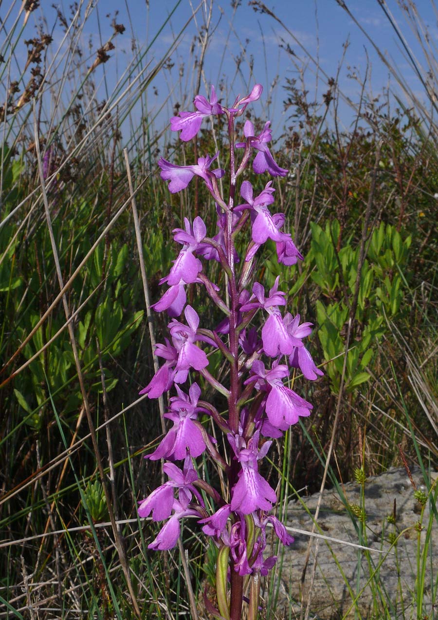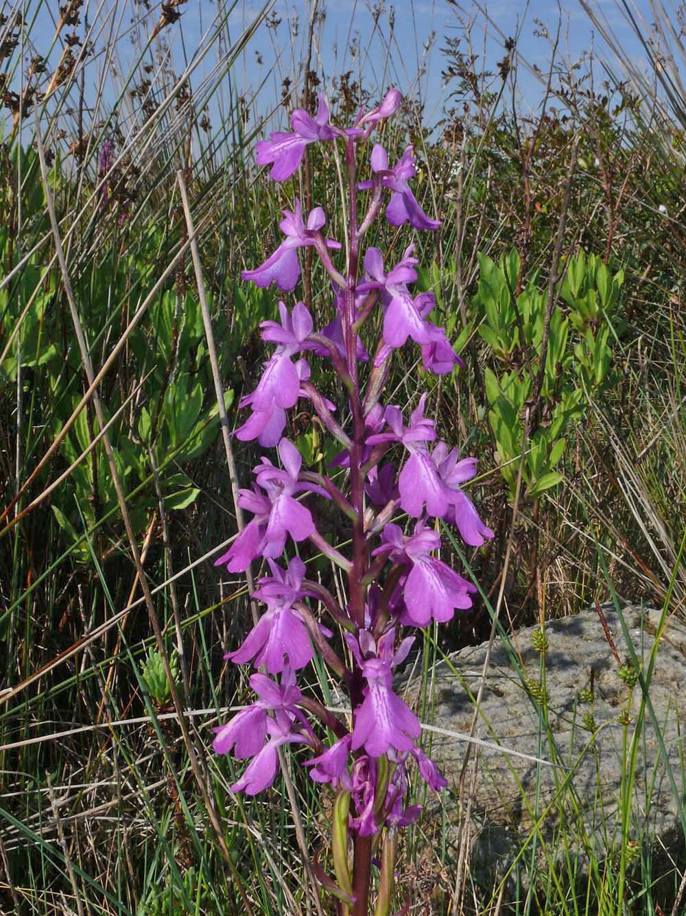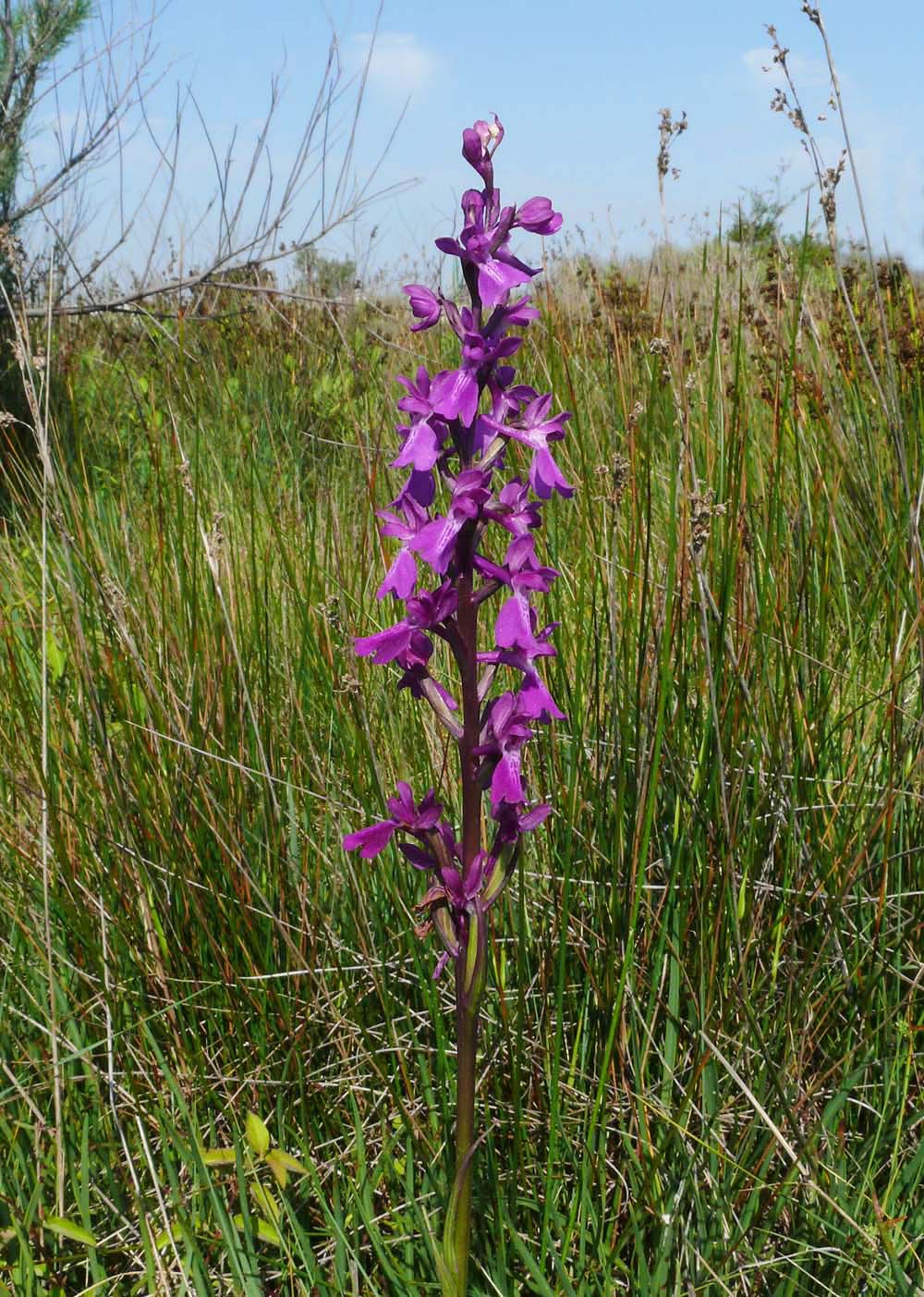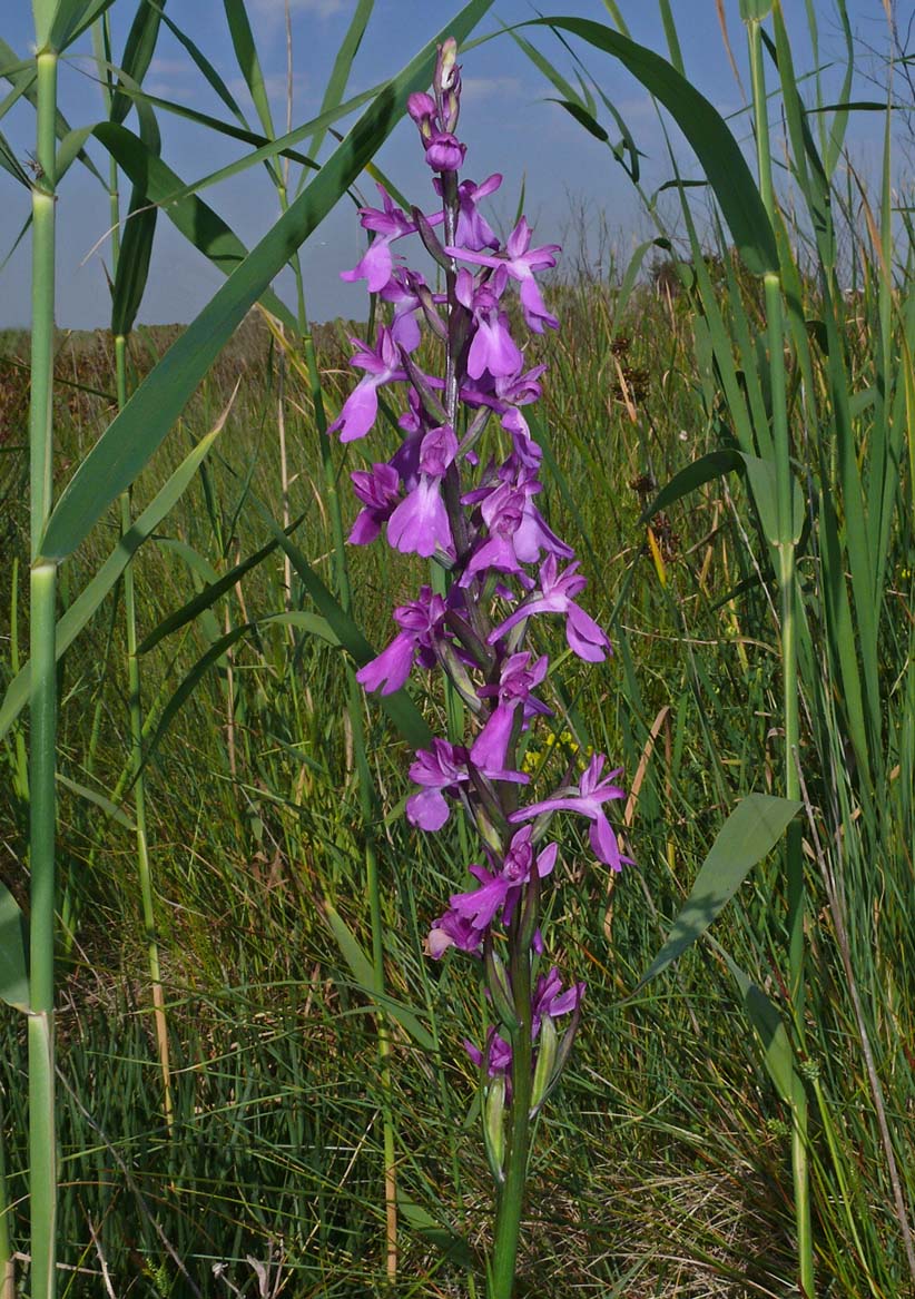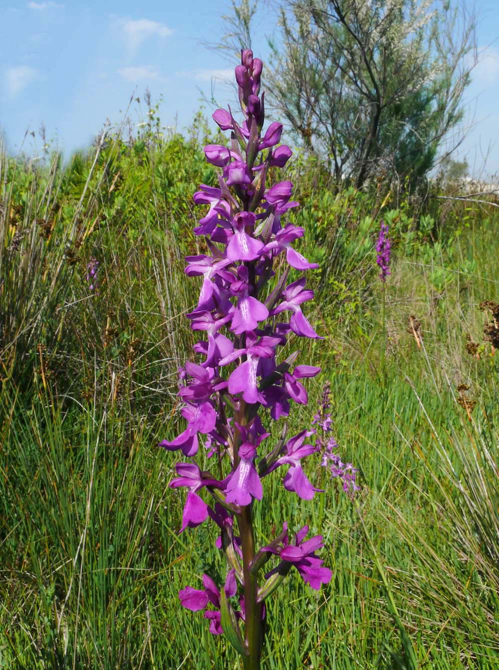 This is a close relative of A. laxiflora and at first sight is often mistaken for that species, particularly as its found in similar damp to wet conditions. Closer inspection however reveals differences and most notably in the shape and pattern of the lip. Whereas A. laxiflora has a plain or lightly spotted white central lip with lateral lobes that are strongly reflexed, A. palustris shows strong purple striation and lateral lobes that are only marginally curved backwards, being better described as flared. It is a tall plant up to around 60cms with a relatively lax inflorescence. Distinguishing this species from the subspecies elegans is less easy and perhaps the most reliable differentiating feature is the spur which in A. palustris is either straight or descendant whilst subsp. elegans is always ascendant and often markedly so. Other less consistent differences are the latters smaller, more pointed sepals, a denser, taller inflorescence and bracts which are usually significantly longer than the ovary. A. palustris has a more widespread distribution throughout most of continental Europe including Scandinavia whereas subsp. elegans has a more easterly range from Croatia through Greece and the Aegean to Bulgaria, Romania, Hungary and Russia. The two taxons have considerable scope for range overlap but despite similar habitat preferences are rarely found growing together. The pictures here are from a seaside sand dune system in the Province of Lecce, southern Italy, dating from the end of April. |