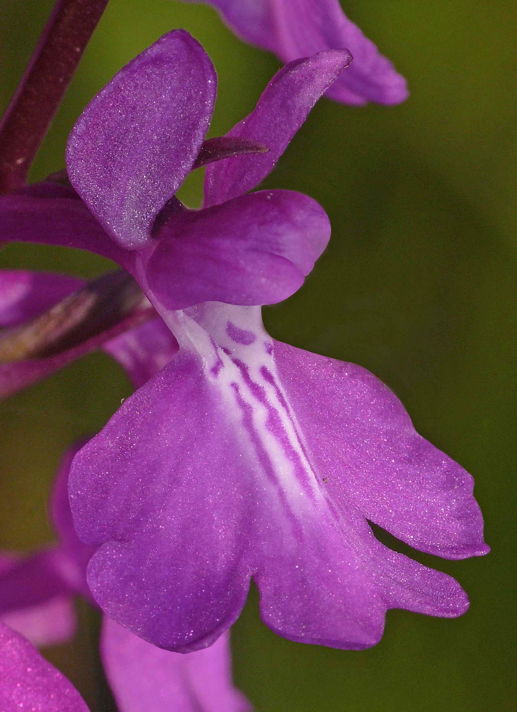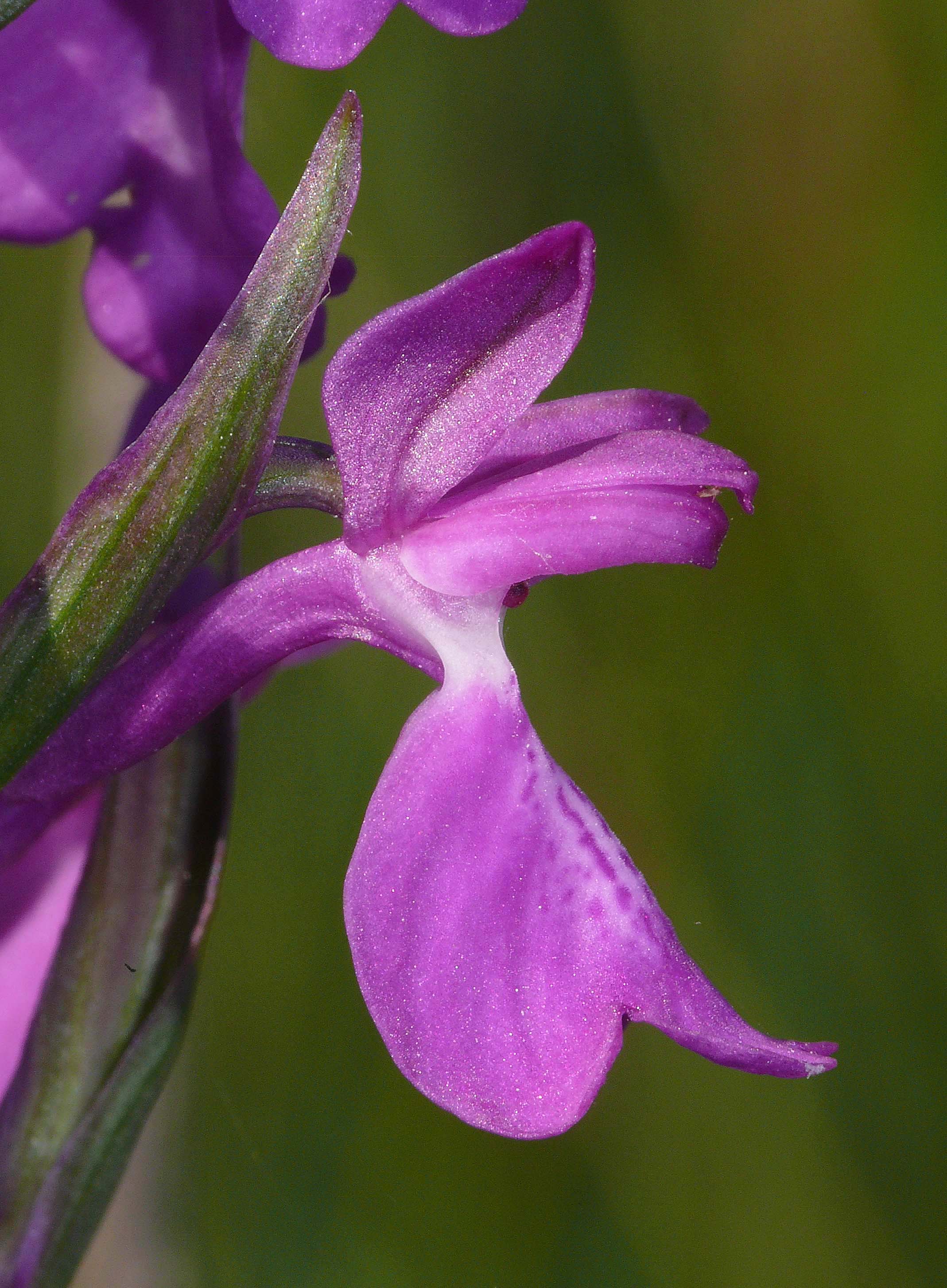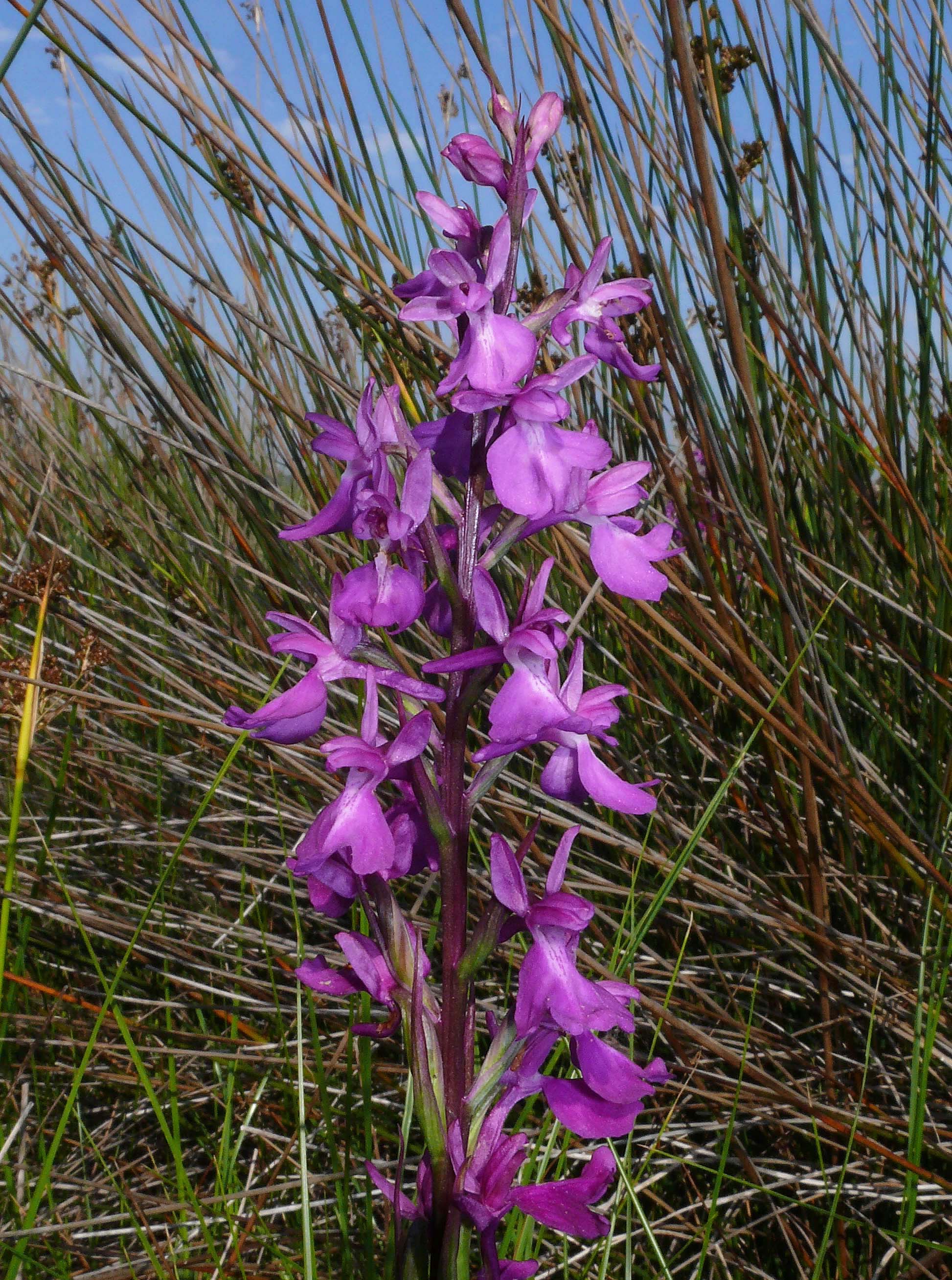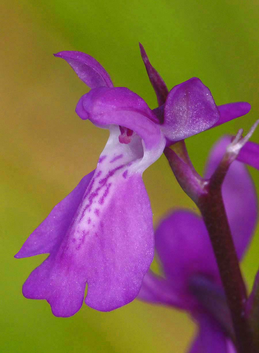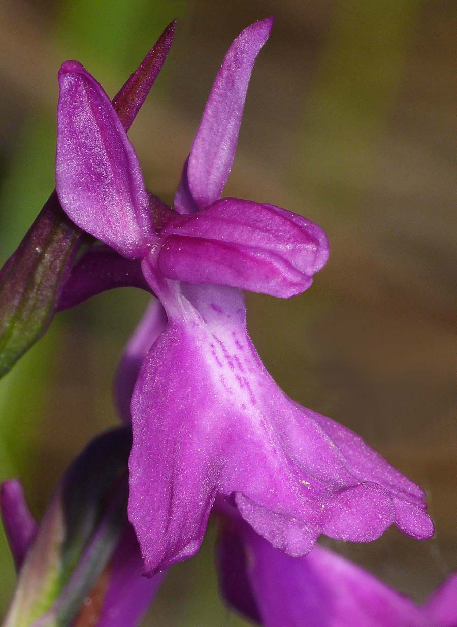 This is a close relative of A. laxiflora and at first sight is often mistaken for that species, particularly as its found in similar damp to wet conditions. Closer inspection however reveals differences and most notably in the shape and pattern of the lip. Whereas A. laxiflora has a plain or lightly spotted white central lip with lateral lobes that are strongly reflexed, A. palustris shows strong purple striation and lateral lobes that are only marginally curved backwards, being better described as flared. It is a tall plant up to around 60cms with a relatively lax inflorescence. Distinguishing this species from the subspecies elegans is less easy and perhaps the most reliable differentiating feature is the spur which in A. palustris is either straight or descendant whilst subsp. elegans is always ascendant and often markedly so. Other less consistent differences are the latters smaller, more pointed sepals, a denser, taller inflorescence and bracts which are usually significantly longer than the ovary. A. palustris has a more widespread distribution throughout most of continental Europe including Scandinavia whereas subsp. elegans has a more easterly range from Croatia through Greece and the Aegean to Bulgaria, Romania, Hungary and Russia. The two taxons have considerable scope for range overlap but despite similar habitat preferences are rarely found growing together. The pictures here are from a seaside sand dune system in the Province of Lecce, southern Italy, dating from the end of April. |