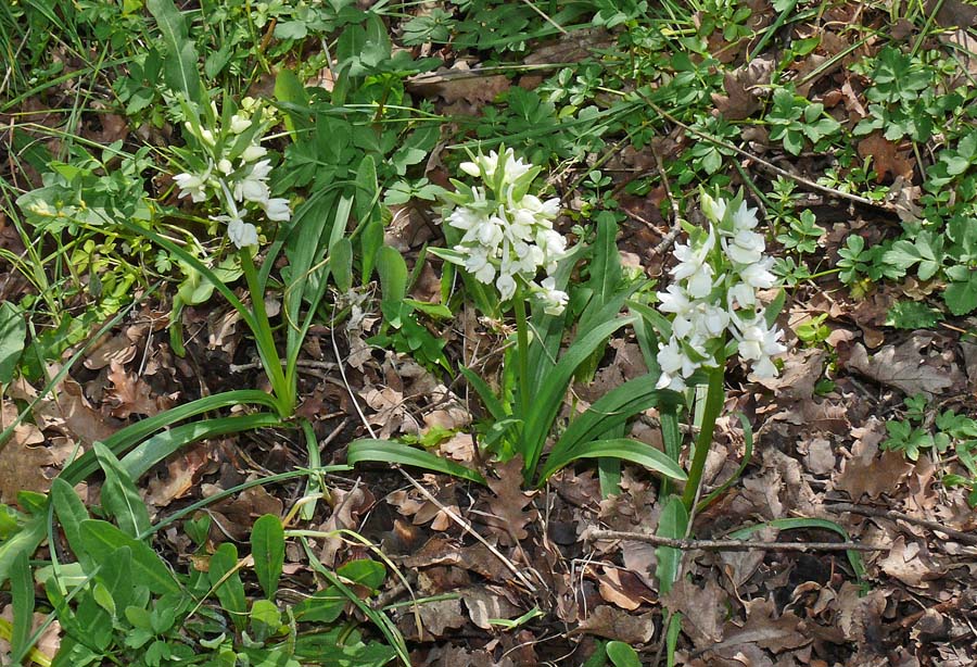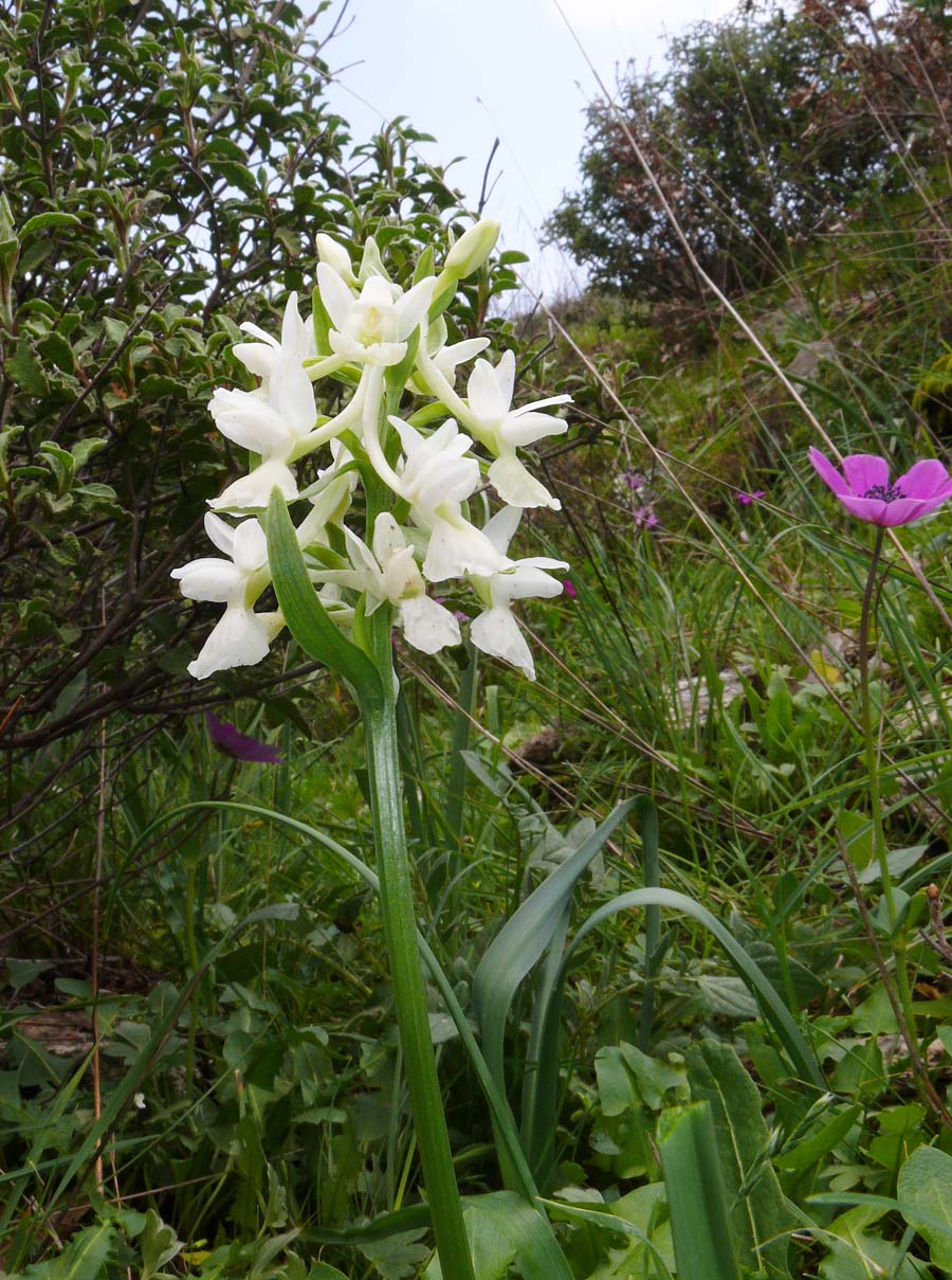 It may be found in many types of habitat but shows a marked preference for woodland, often heavily shaded. Although not exclusively a montane orchid, it appears to prefer higher altitudes, being perfectly happy with mountain existence up to altitudes of 2000m. The very similar D. markusii seems to prefer more heavily acidic conditions and even higher altitudes. Perhaps the one species that may cause cunfusion with this white variety of D. romana is O. provincialis, though this can usually be differentiated by its dark spotted leaves, smaller bracts and red markings on the lip. D. romana occurs in yellow, red and much the rarest, white forms which may all be present within the same population. Intermediates between the colour phases are common. The white form of D. romana is rare but most frequently found as the dominant colour where it occurs and is rarely encountered in mixed colour populations. This does not infer any evolutionary development away from type, rather that white flowers generally experience higher levels of pollination due to their increased conspicuousness to pollinators. The pictures are from Lesbos, Cilento and Samos dating from early April. |