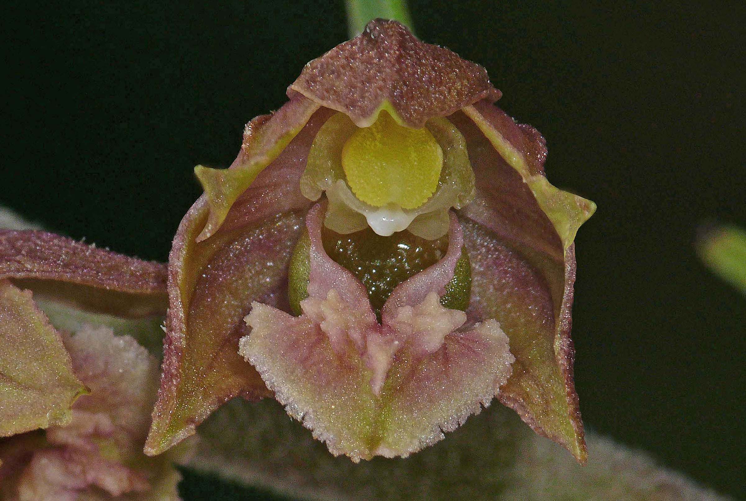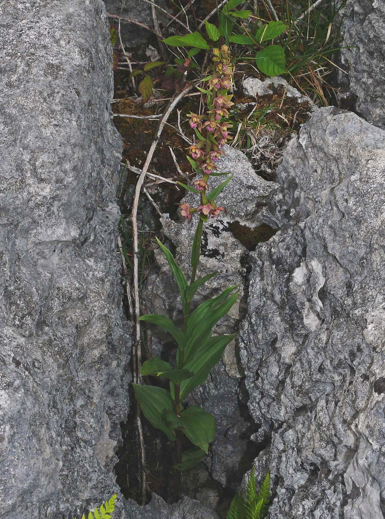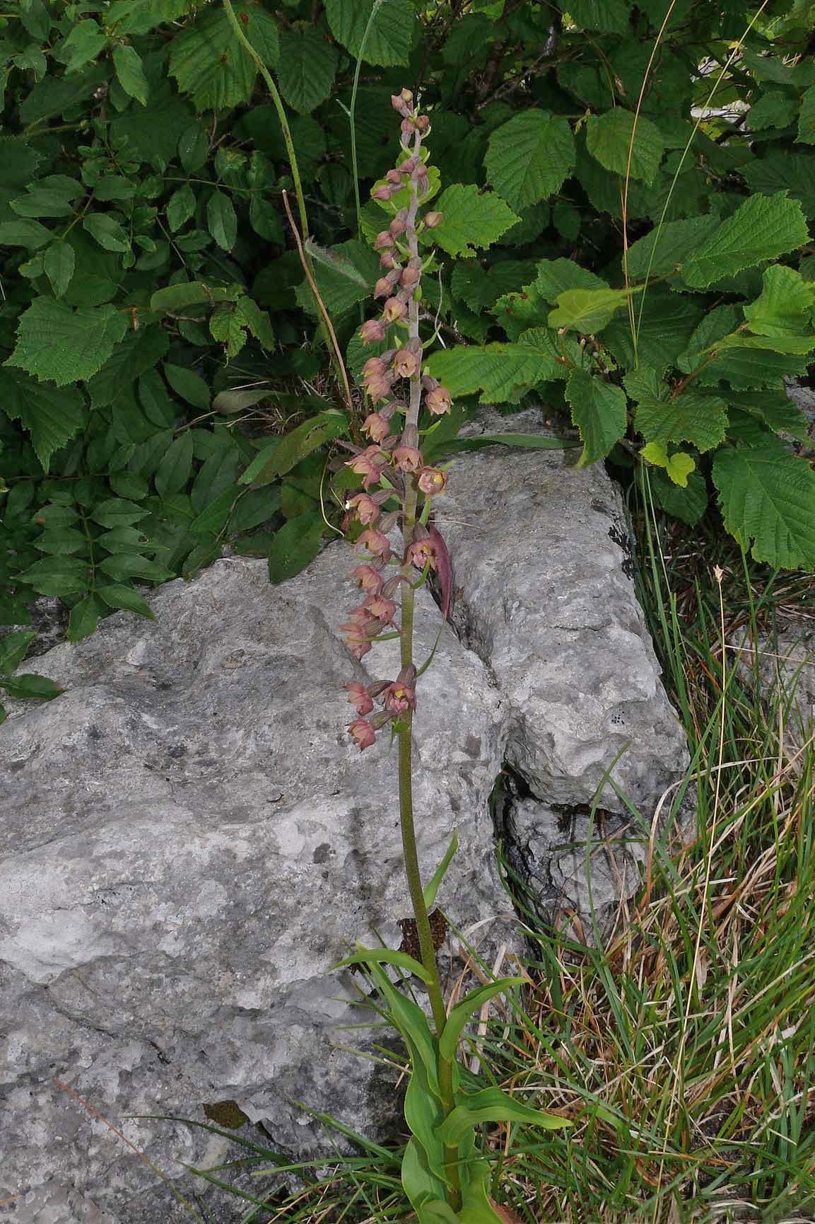 This hybrid was first described as long ago as 1890 by K. Richt and as with the two parent species, Germany was the location of its initial discovery. From that time, the plant has become well known and frequently observed, predominantly in central Europe and most particularly in Germany and Poland. Its formal name is Epipactis x schmalhauseneii . In Britain it was first discovered in the late 1980's in Northumberland but it has subsequently been found growing in small numbers amongst limestone pavement in south east Cumbria. At present in the UK it is still only publicly known from these two areas but it would seem unlikely that it isn't present in other suitable sites. The pictures come from north west England and date from the 20th of July. |
