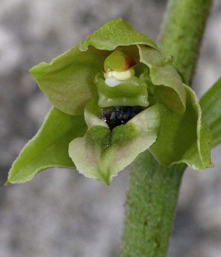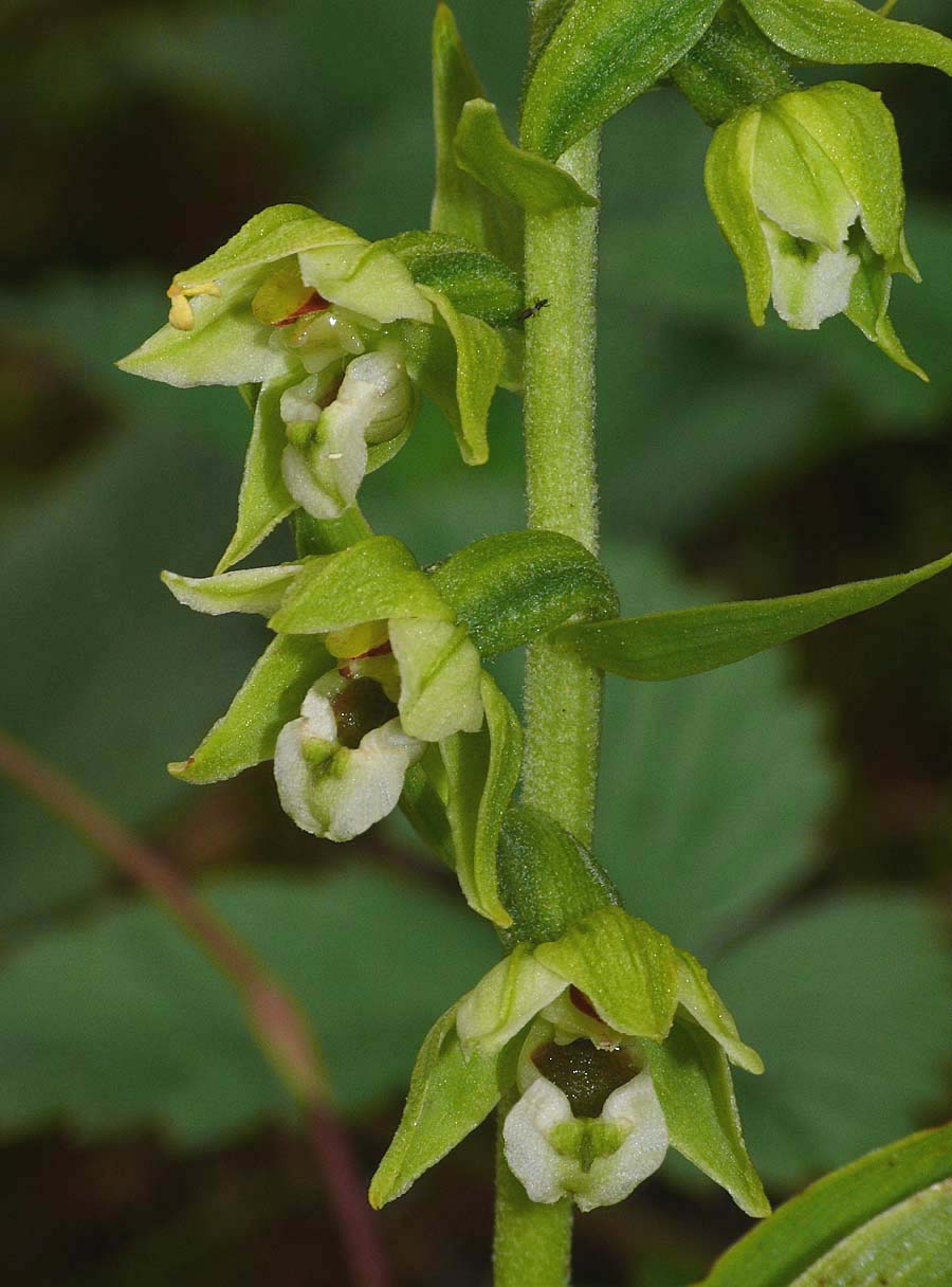 Although morphologically a highly diverse species, there are few recognized varieties and recent molecular studies seem to call even some of these into question. E. helleborine has a huge distribution throughout Europe and Asia and occurs as far east as Siberia and the Himalayas. It can be found as far north as Scandinavia and in the south reaches the Mediterranean and Aegean, although this southerly range is is open to question due to confusion with other related Epipactis species. Well over a century ago it was introduced to the United States where it has spread so dramatically as to now be regarded a nuisance species. This is an orchid that tolerates a wide range of differing climatic and soil conditions and has justifiably acquired a reputation as a species capable of turning up almost anywhere, a characteristic which together with its natural predisposition for variation sees it frequently confused with other species. Viridiflora is a variety that can occur throughout the range of the main species and the examples here were discovered growing on limestone pavement in close association with both E. helleborine and E. atrorubens. Light phases of E. helleborine appear quite commonly but they usually show vestiges of reddish colouration whereas this variety is completely green/white. The pictures come from northern England and Austria, dating from the 8th of August and 10th of July respectively. |