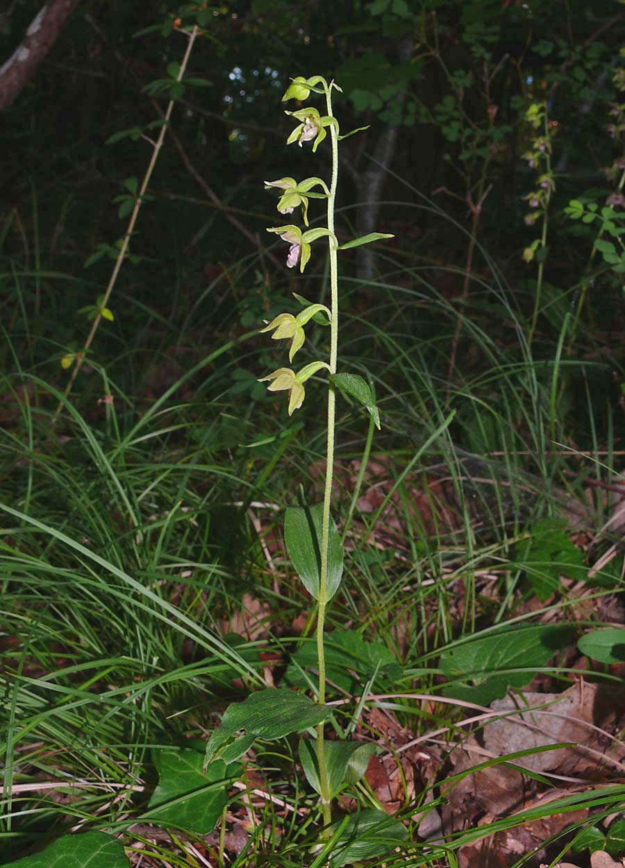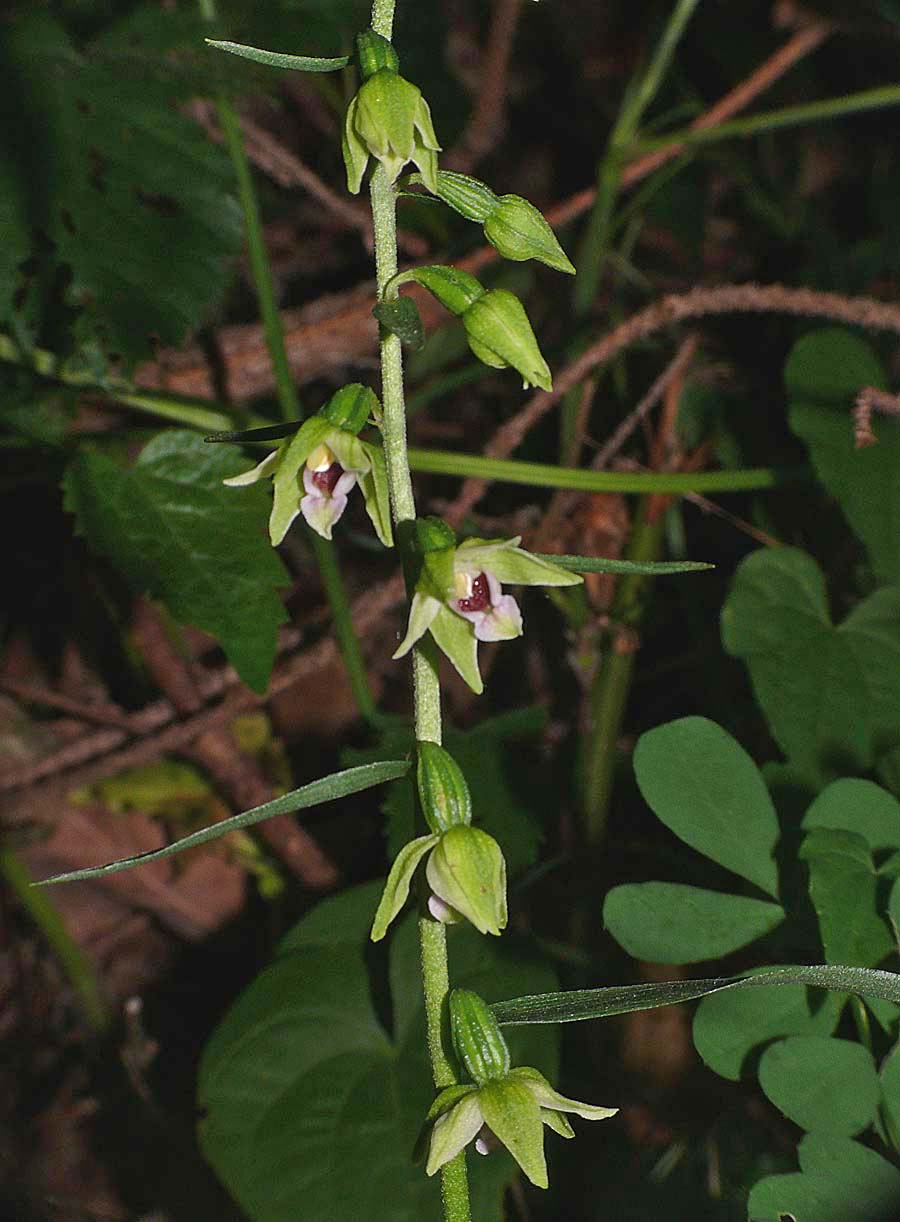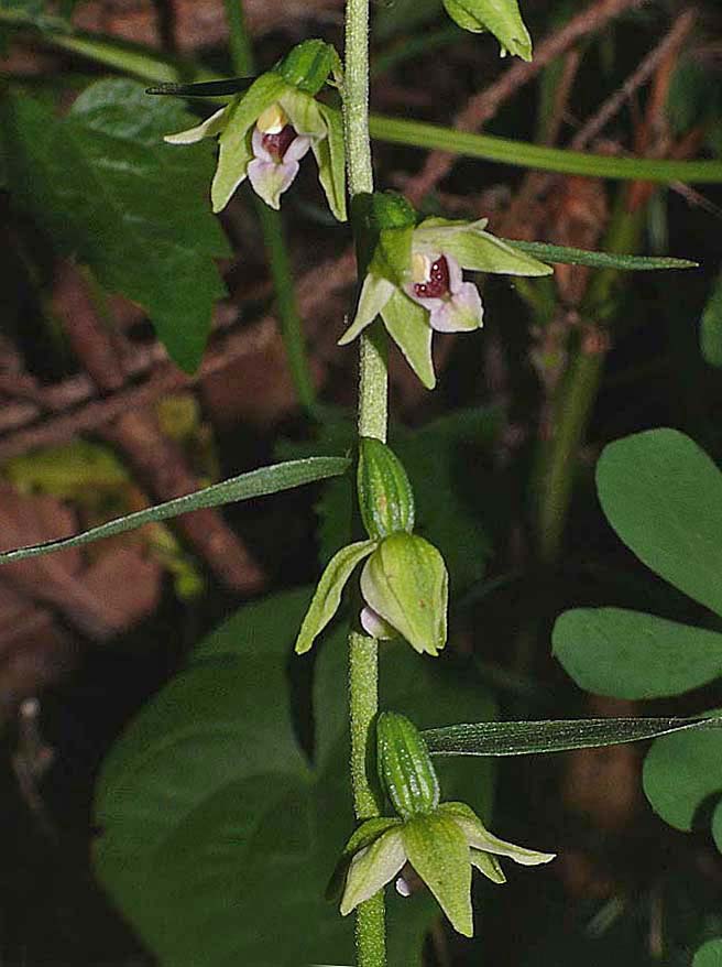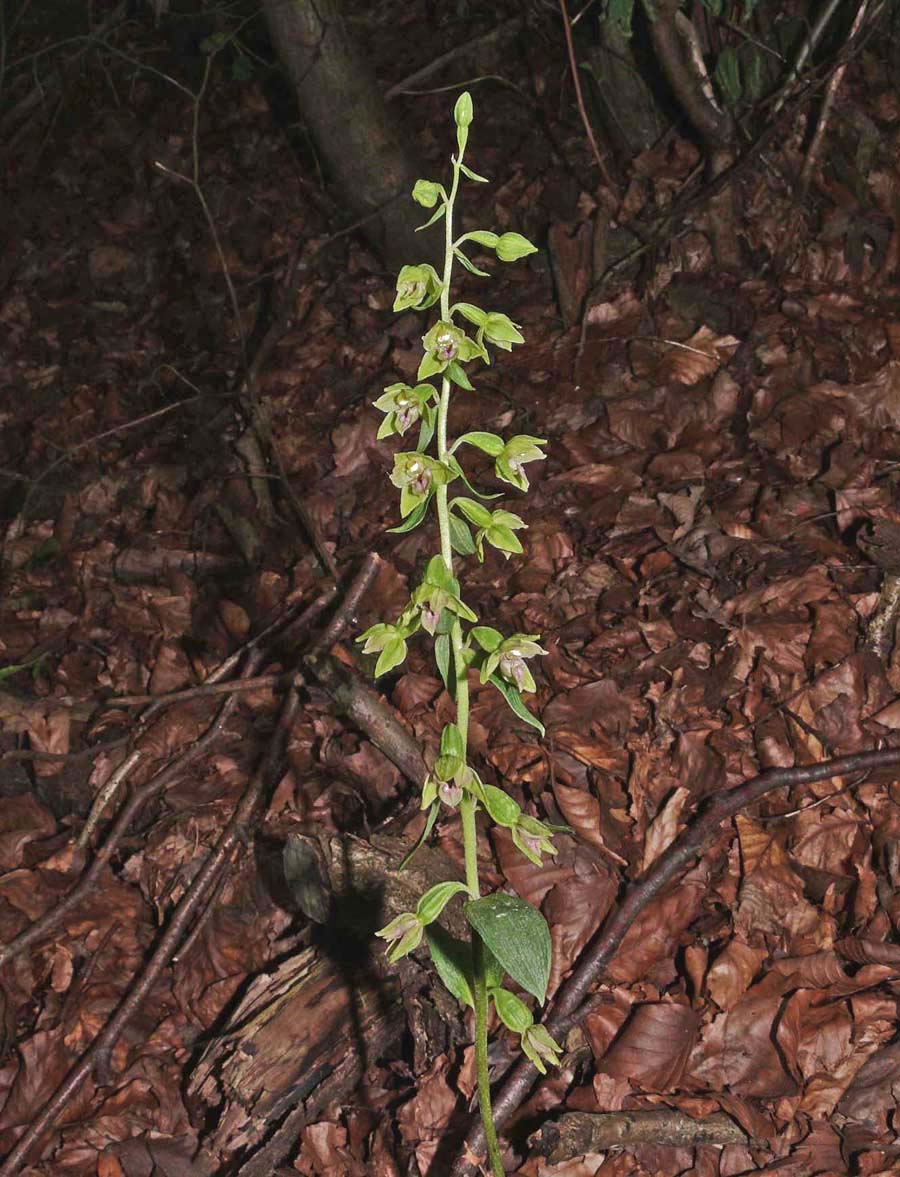 The range of E. leptochila covers much of temperate Europe from England, Germany and Denmark, down to Northern Spain and across to the Balkans and Hungary. It is a rare orchid everywhere but perhaps at its most frequent in England where it inhabits shady sites amongst leaf litter in beech woods. The Chilterns represent its stronghold but it has been recorded from most counties in the southern half of England. It often grows with both E. purpurata and E. helleborine but can be readily distinguished from these species by virtue of the overall light green colouration of the perianth, but most importantly by the dark red hypochile floor and the long, heart shaped, forward pointing epichile. In deep shade E. helleborine can become etiolated and these, more slender, pale specimens can present identification problems. Distinguishing the two should however be straightforward as the leaves of E. helleborine are arranged in a spiral, are broader and more numerous than those of E. leptochila. |