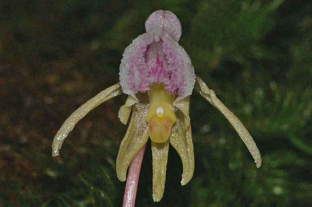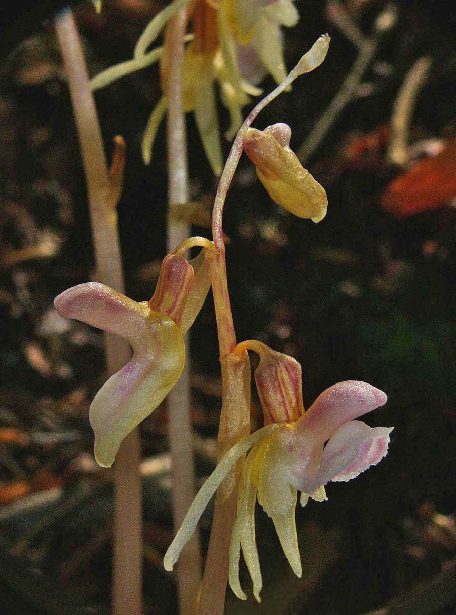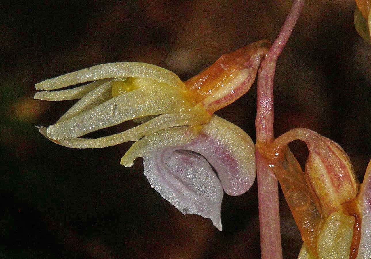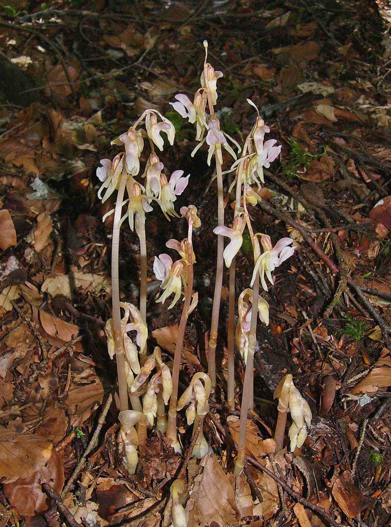 E. aphyllum is a truly saprophytic plant that inhabits cool, shady sites on alkaline or mildly acidic soils, usually amongst deep leaf litter. Its preferred location is generally dense pine or deciduous woodland where its flowers are pollinated by bees, attracted nectar which reputedly smells of fermented banana. Its range is extensive and covers all the temperate zones of Europe and Asia as far as Japan. Although a widespread orchid it is always rare and this together with its low, spindly stature and the darkness of its favoured environment result in an orchid that's invariably difficult to find. It is always a source of great pleasure to successfully locate a colony of this deceptively beautiful and undeniably fascinating species. In Britain E. aphyllum was last recorded from its famous site near Marlow in 1986 and subsequently declared extinct in 1999. A great deal of study and hard work was then rewarded in 2009 when Mark Jannick rediscovered a single plant at a location in Herefordshire. Interestingly and notwithstanding the habitat description above, it was growing on a silty, sandy soil with a significantly high acidity level and no leaf litter. Regrettably it was subsequently re-declared extinct. The Ghost orchid is notorious for its unreliable appearances and it can regularly disappear or flower underground for several years. The illustrations accompanying this text come from the Vercors region of Southern France, dating from the beginning of July. |