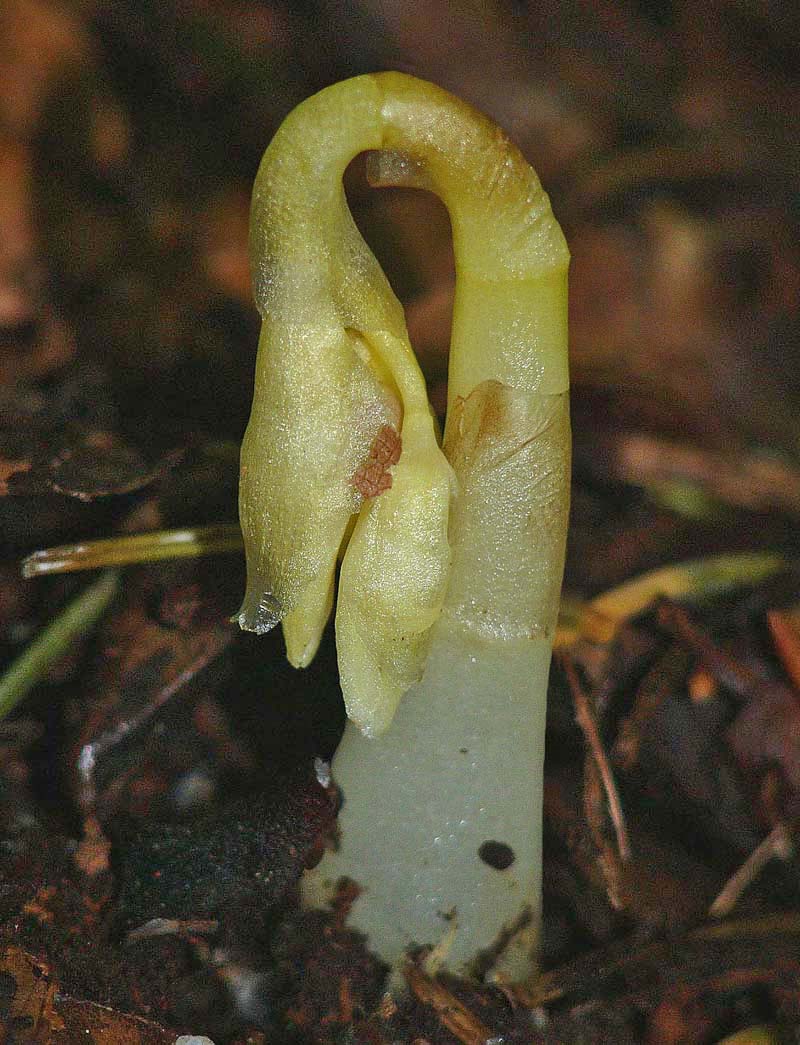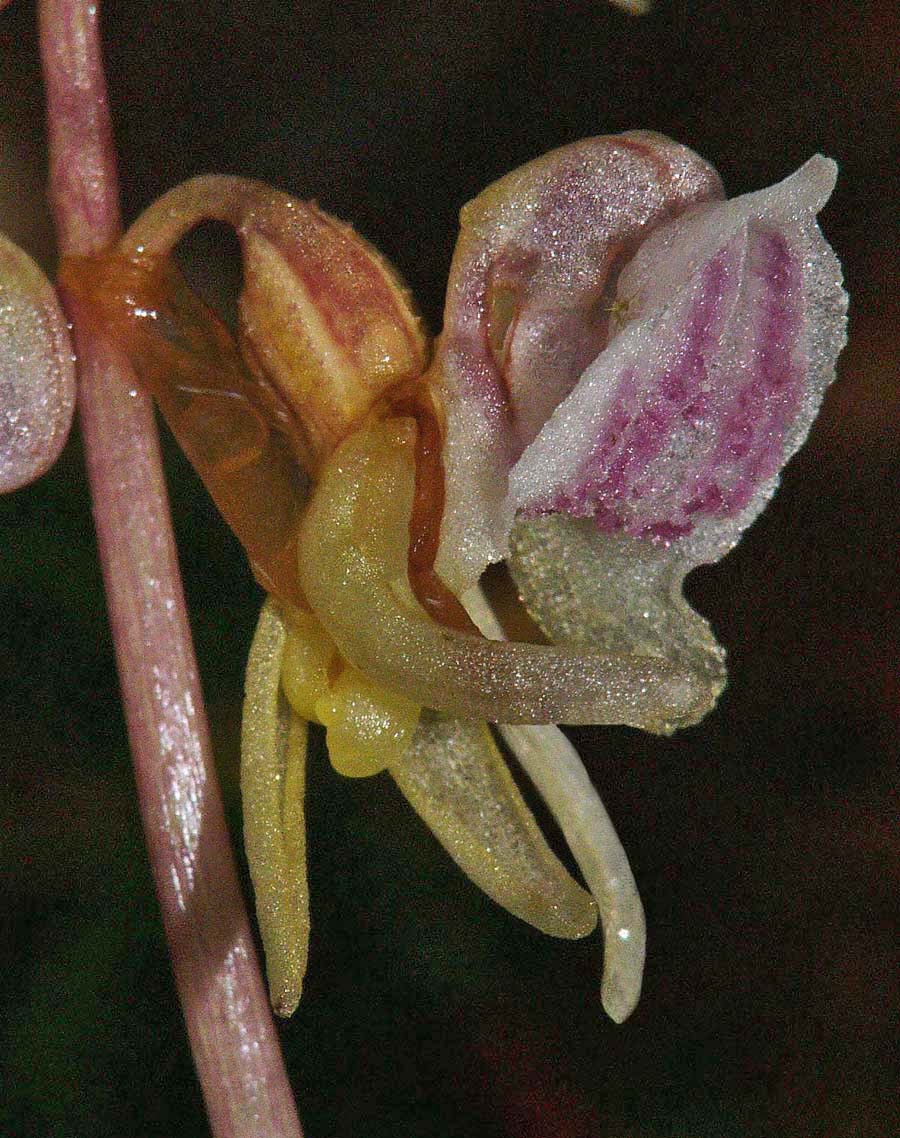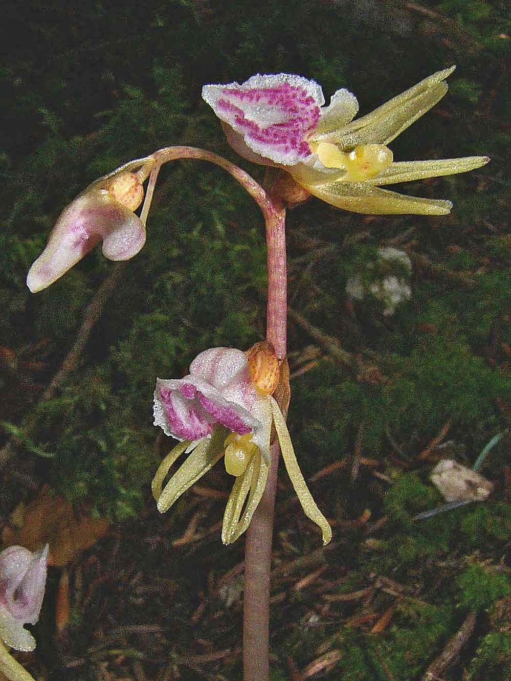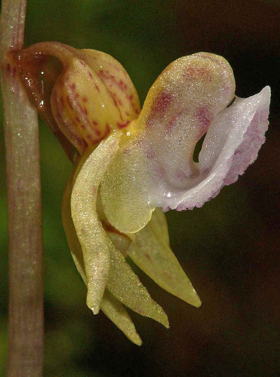 E. aphyllum is a truly saprophytic plant that inhabits cool, shady sites on alkaline or mildly acidic soils, usually amongst deep leaf litter. Its preferred location is generally dense pine or deciduous woodland where its flowers are pollinated by bees, attracted nectar which reputedly smells of fermented banana. Its range is extensive and covers all the temperate zones of Europe and Asia as far as Japan. Although a widespread orchid it is always rare and this together with its low, spindly stature and the darkness of its favoured environment result in an orchid that's invariably difficult to find. It is always a source of great pleasure to successfully locate a colony of this deceptively beautiful and undeniably fascinating species. In Britain E. aphyllum was last recorded from its famous site near Marlow in 1986 and subsequently declared extinct in 1999. A great deal of study and hard work was then rewarded in 2009 when Mark Jannick rediscovered a single plant at a location in Herefordshire. Interestingly and notwithstanding the habitat description above, it was growing on a silty, sandy soil with a significantly high acidity level and no leaf litter. Regrettably it was subsequently re-declared extinct. The Ghost orchid is notorious for its unreliable appearances and it can regularly disappear or flower underground for several years. The illustrations accompanying this text come from the Vercors region of Southern France, dating from the beginning of July. |