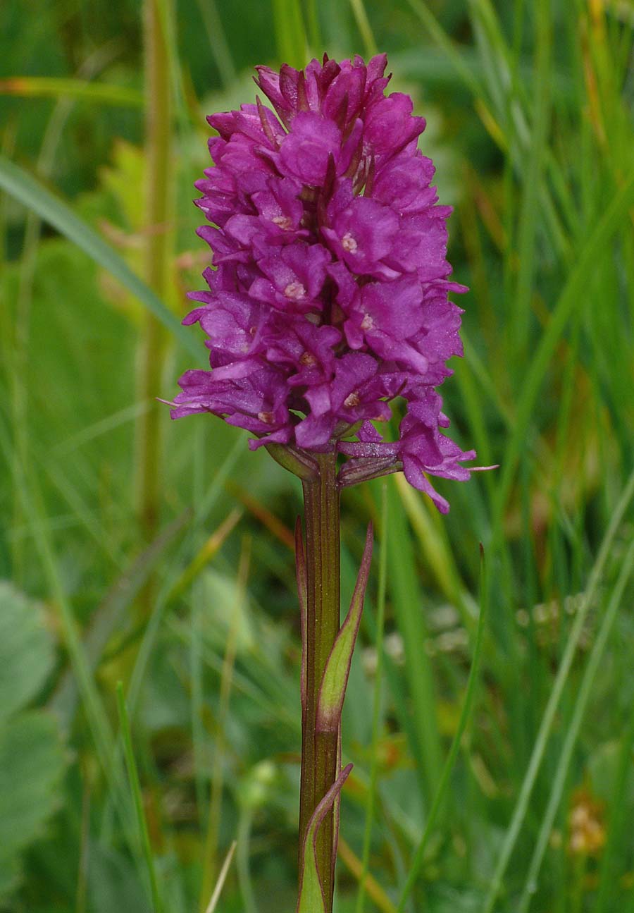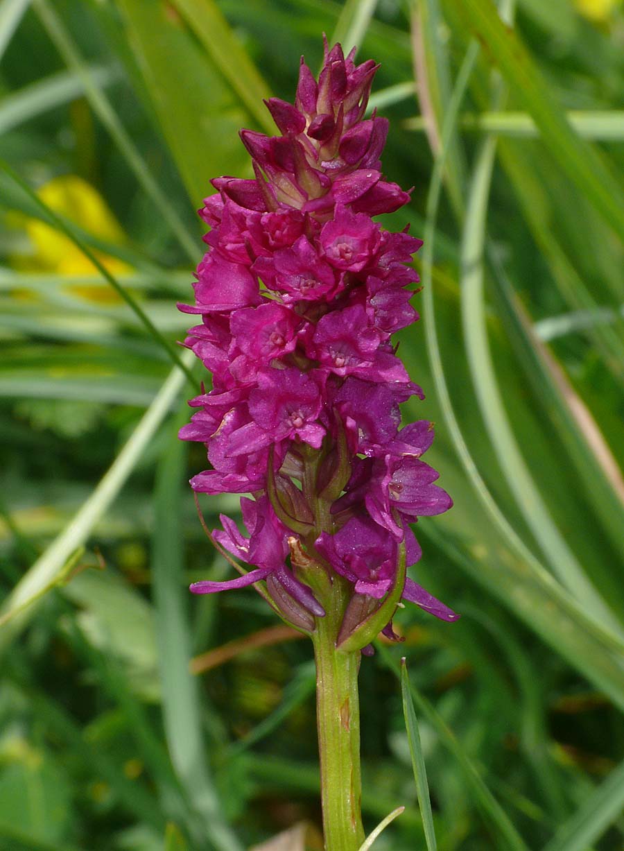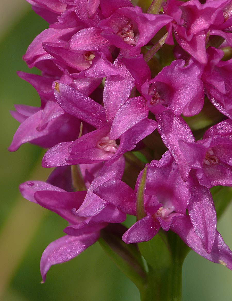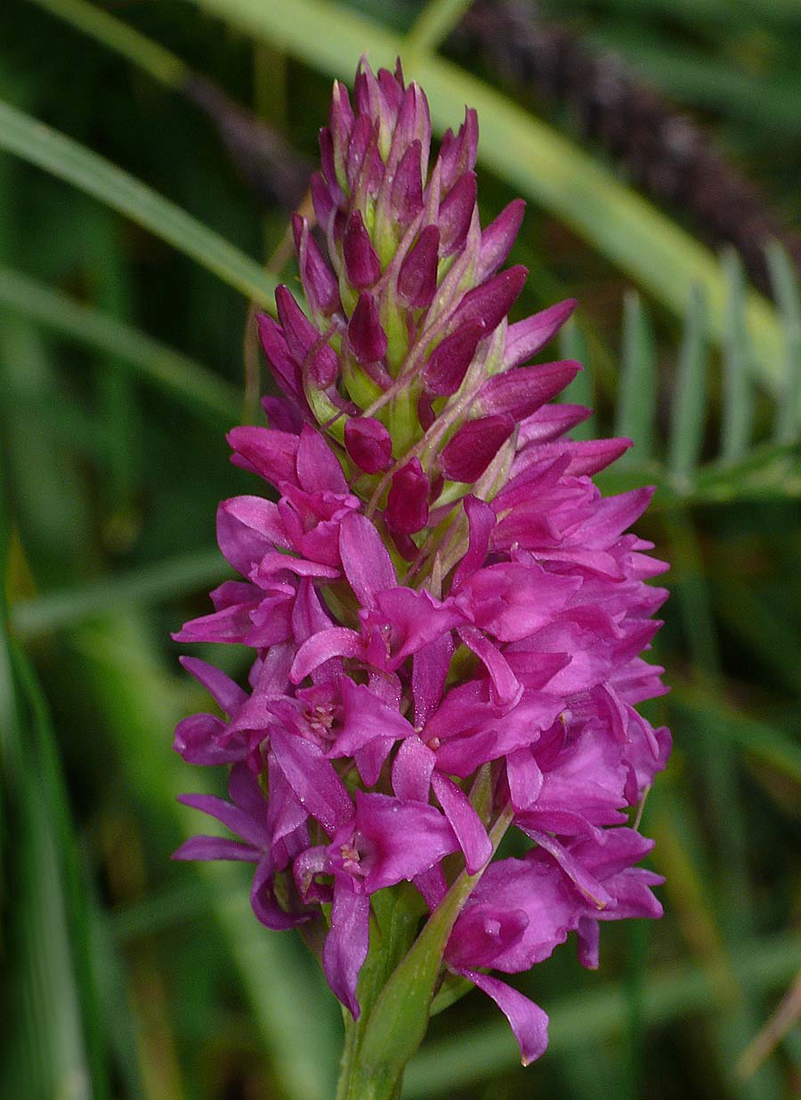The range of Gymnadenia x suaveolens is obviously determined by that of its progenitors, as is its habitat choice, this being calcareous grassland between 1000 and 2500 metres. The hybrid is however found more frequently below the 2000 metre level where plant numbers are higher and pollinating insects more prevalent. As can be seen from the photographs the plant is variable, but almost always of bright magenta colouration and of a size midway between the two parents. In the field the combination of these two characteristics make Gymnadenia x suaveolens highly visible, even in an already colourful alpine meadow. The pictures are all from the Dolomites and date from the first two weeks of July. |