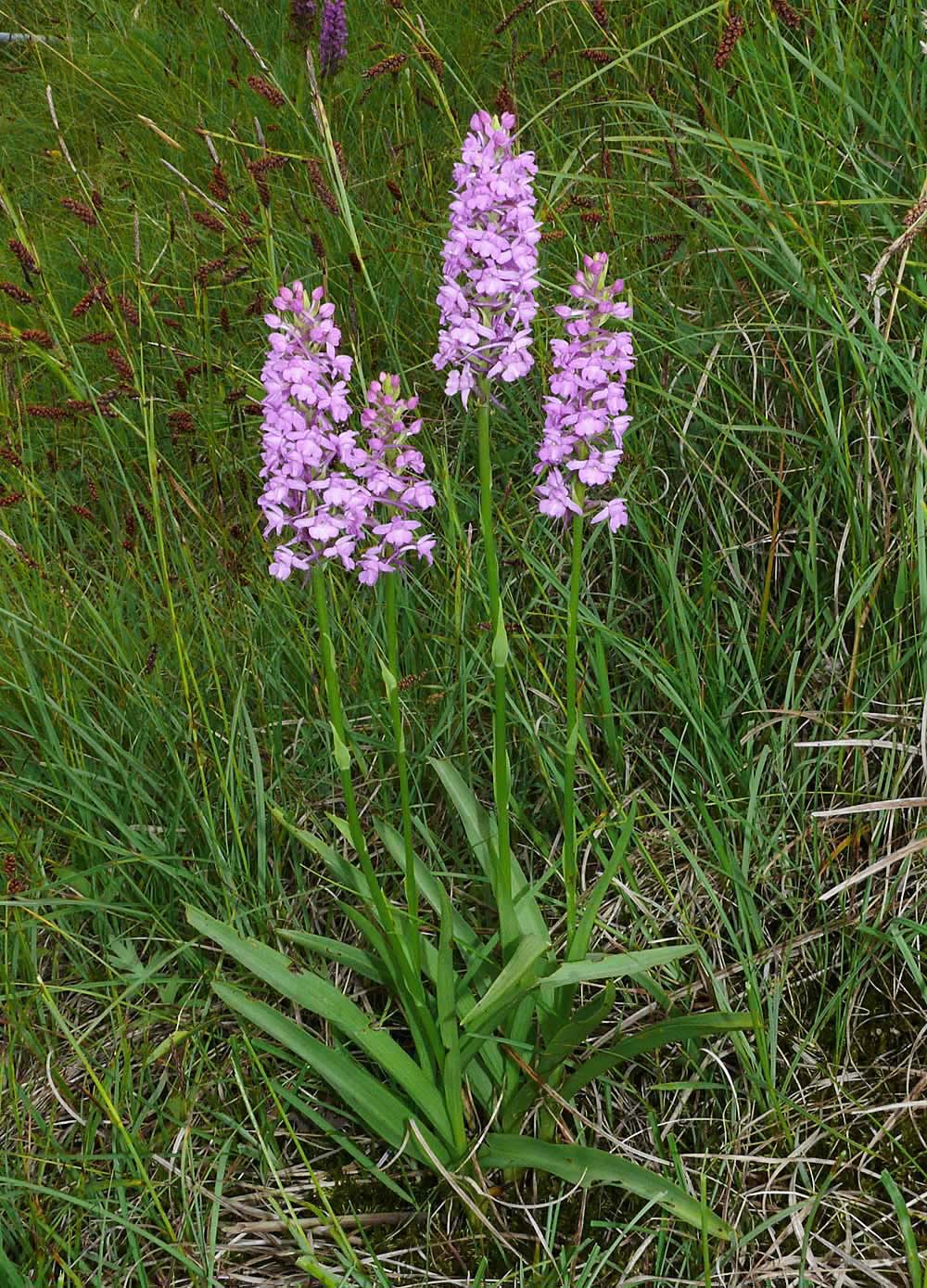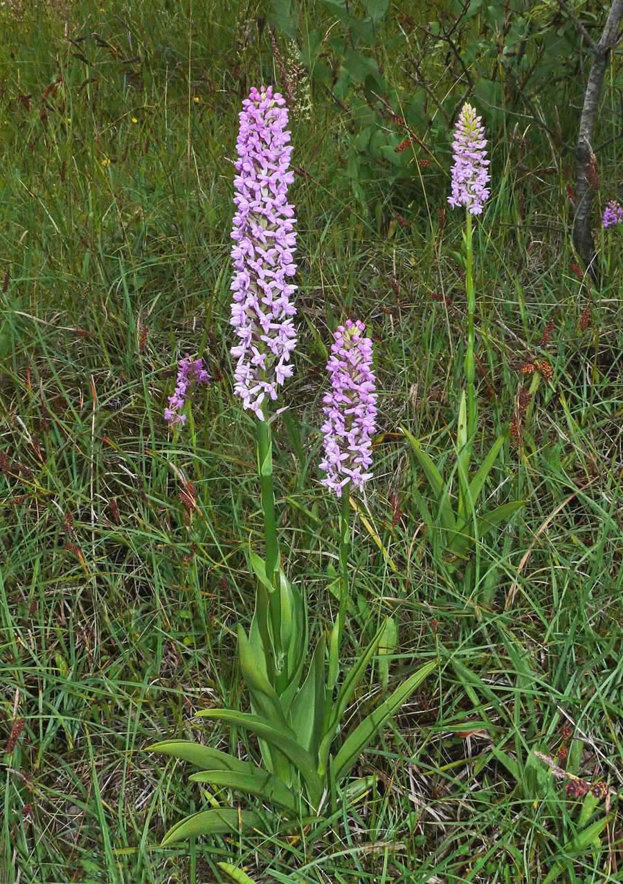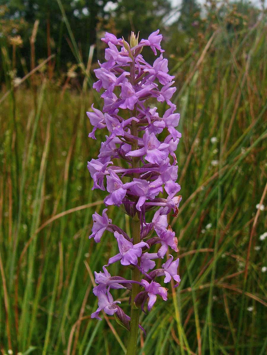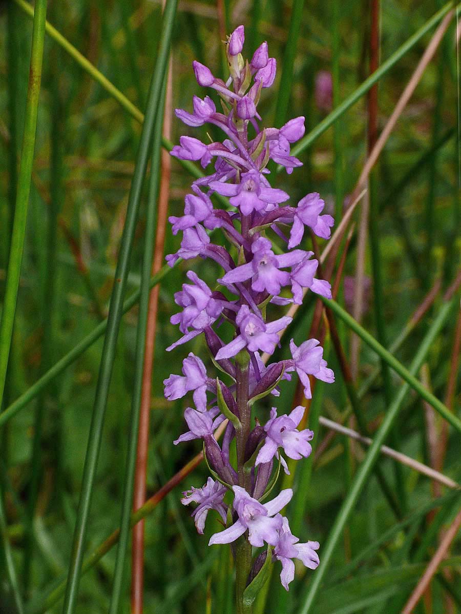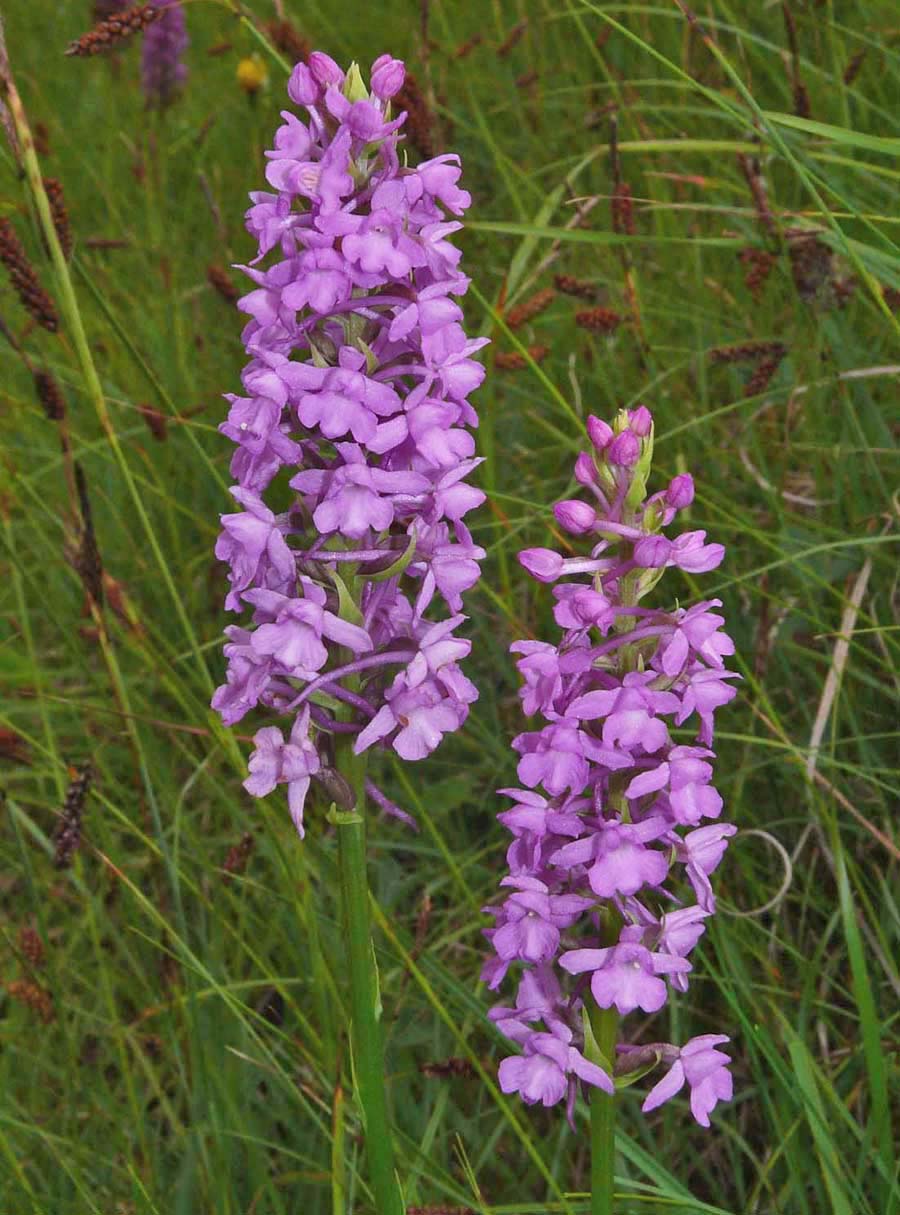Whilst all of these taxons share a family resemblance, G. densiflora shows a particularly close similarity to both G. borealis and G. conopsea. These morphological likenesses would be problematic from an identification point of view, but for the fact that there are few areas of distribution overlap, a situation which it is supposed arises from the differing habitat requirements of the three species. The above mentioned study of UK populations in 2007 discovered that there was little genetic crossover between the species, attributing this to habitat separation and also to slightly different flowering times. G. densiflora can be found throughout much of Europe, where it favours fens, wet flushes or marshy ground on alkaline soils and often in montane conditions. These preferences give rise to its common name, the Marsh Fragrant Orchid. It is however tolerant of lower altitudes and can occasionally be found in drier environments such as sand dunes or even damp chalk grassland. Where this occurs it may come into contact with G. conopsea but in these situations, hybridization is not at all as common as was once thought, with the two species remaining quite distinct. G. densiflora is a robust plant up to a metre high with a long cylindrical inflorescence of up to 150 densely packed individual flowers. The broad, strongly keeled leaves form a sturdy rosette at the base and are easily distinguished from the rather weedy leaves of G. conopsea and G. borealis. The pictures are from Cumberland and Hampshire, UK, dating from July. |