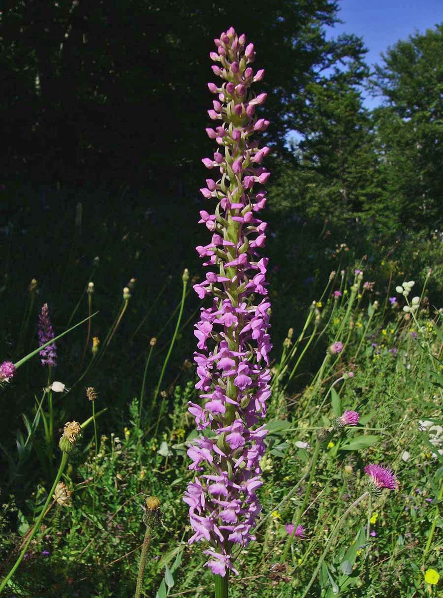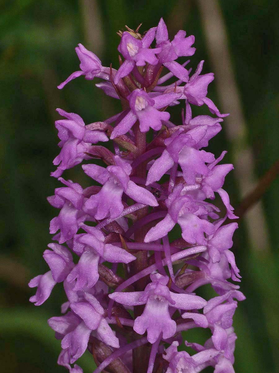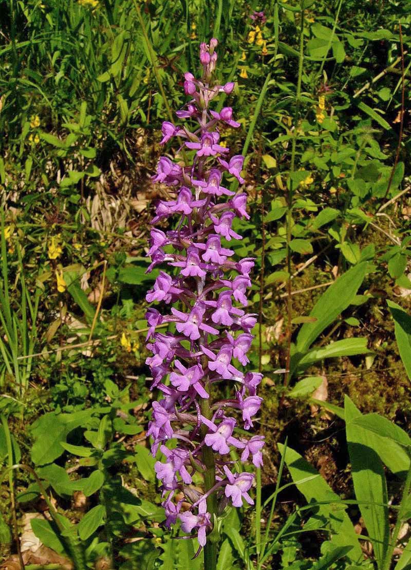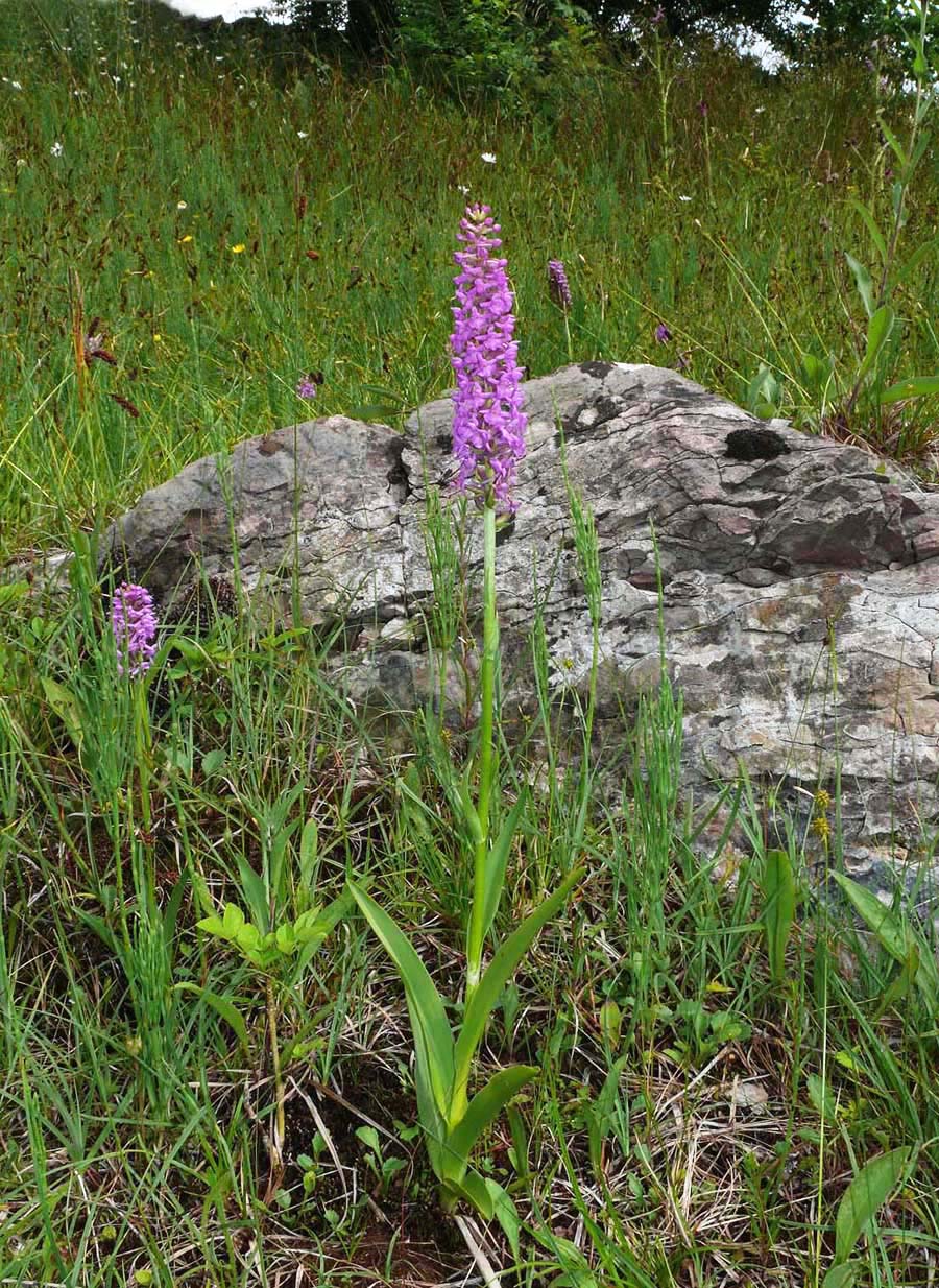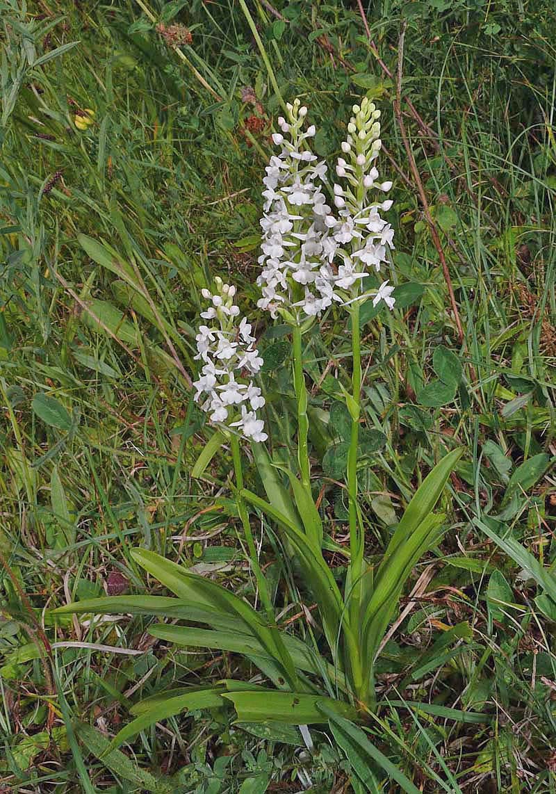 Whilst all of these taxons share a family resemblance, G. densiflora shows a particularly close similarity to both G. borealis and G. conopsea. These morphological likenesses would be problematic from an identification point of view, but for the fact that there are few areas of distribution overlap, a situation which it is supposed arises from the differing habitat requirements of the three species. The above mentioned study of UK populations in 2007 discovered that there was little genetic crossover between the species, attributing this to habitat separation and also to slightly different flowering times. G. densiflora can be found throughout much of Europe, where it favours fens, wet flushes or marshy ground on alkaline soils and often in montane conditions. These preferences give rise to its common name, the Marsh Fragrant Orchid. It is however tolerant of lower altitudes and can occasionally be found in drier environments such as sand dunes or even damp chalk grassland. Where this occurs it may come into contact with G. conopsea but in these situations, hybridization is not at all as common as was once thought, with the two species remaining quite distinct. G. densiflora is a robust plant up to a metre high with a long cylindrical inflorescence of up to 150 densely packed individual flowers. The broad, strongly keeled leaves form a sturdy rosette at the base and are easily distinguished from the rather weedy leaves of G. conopsea and G. borealis. The pictures are from Cumberland and Hampshire, UK, dating from July. |