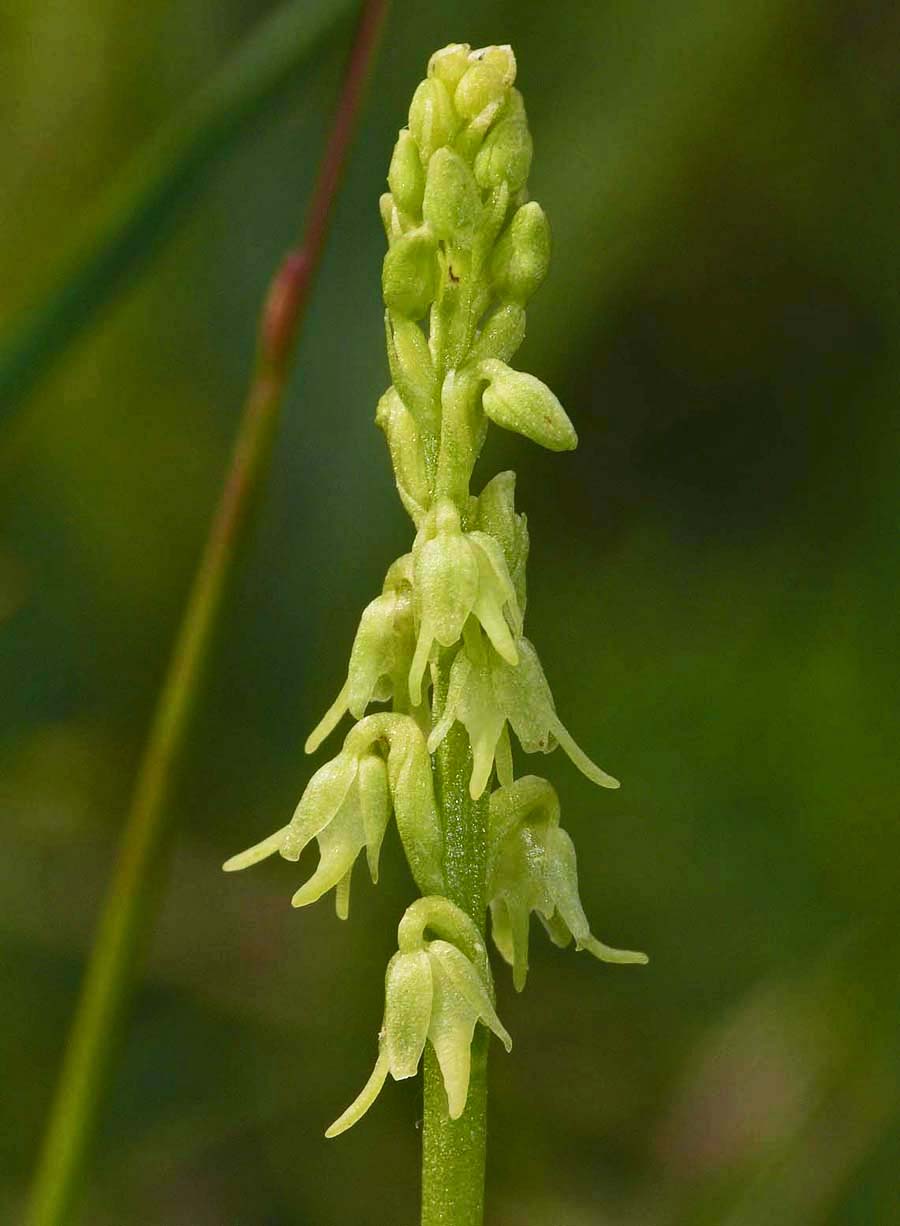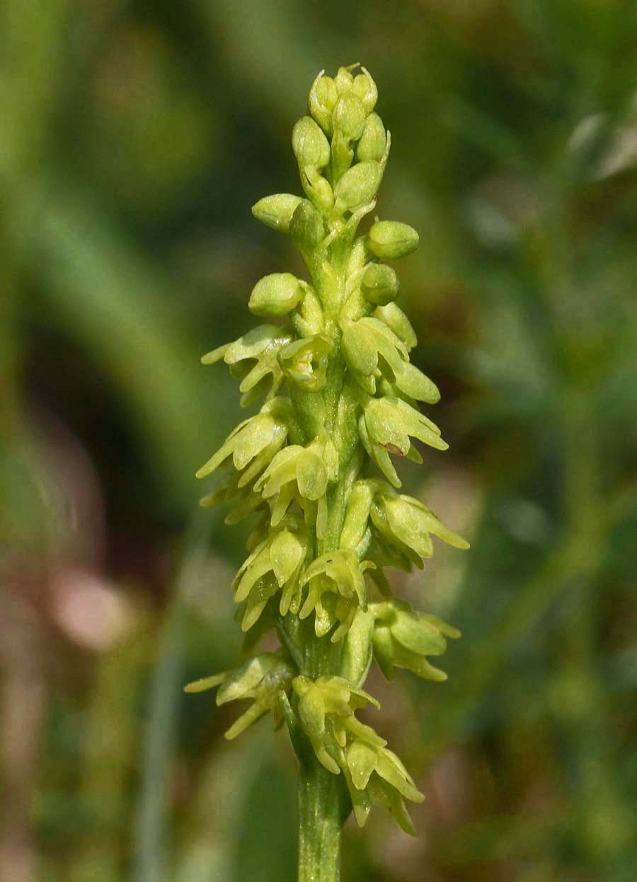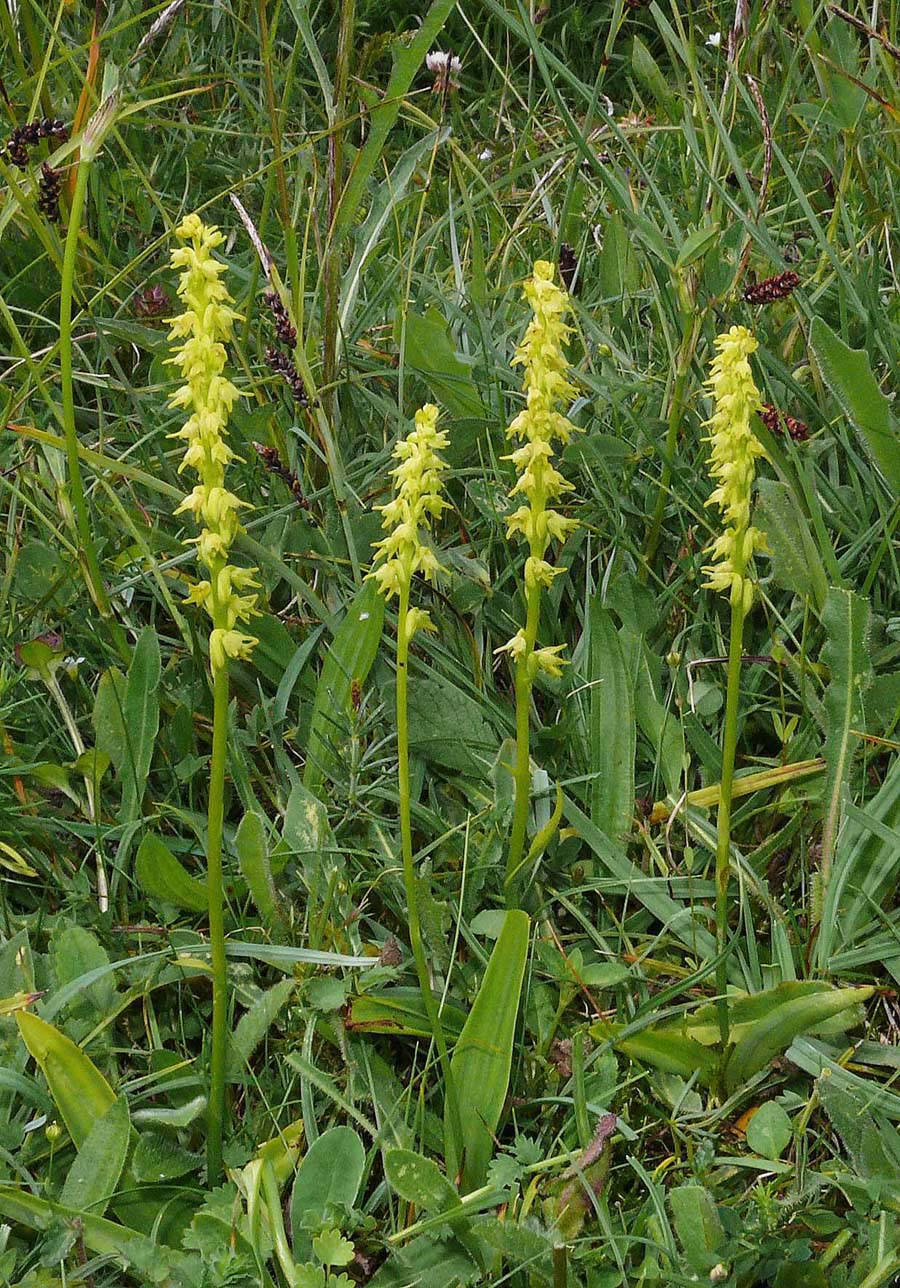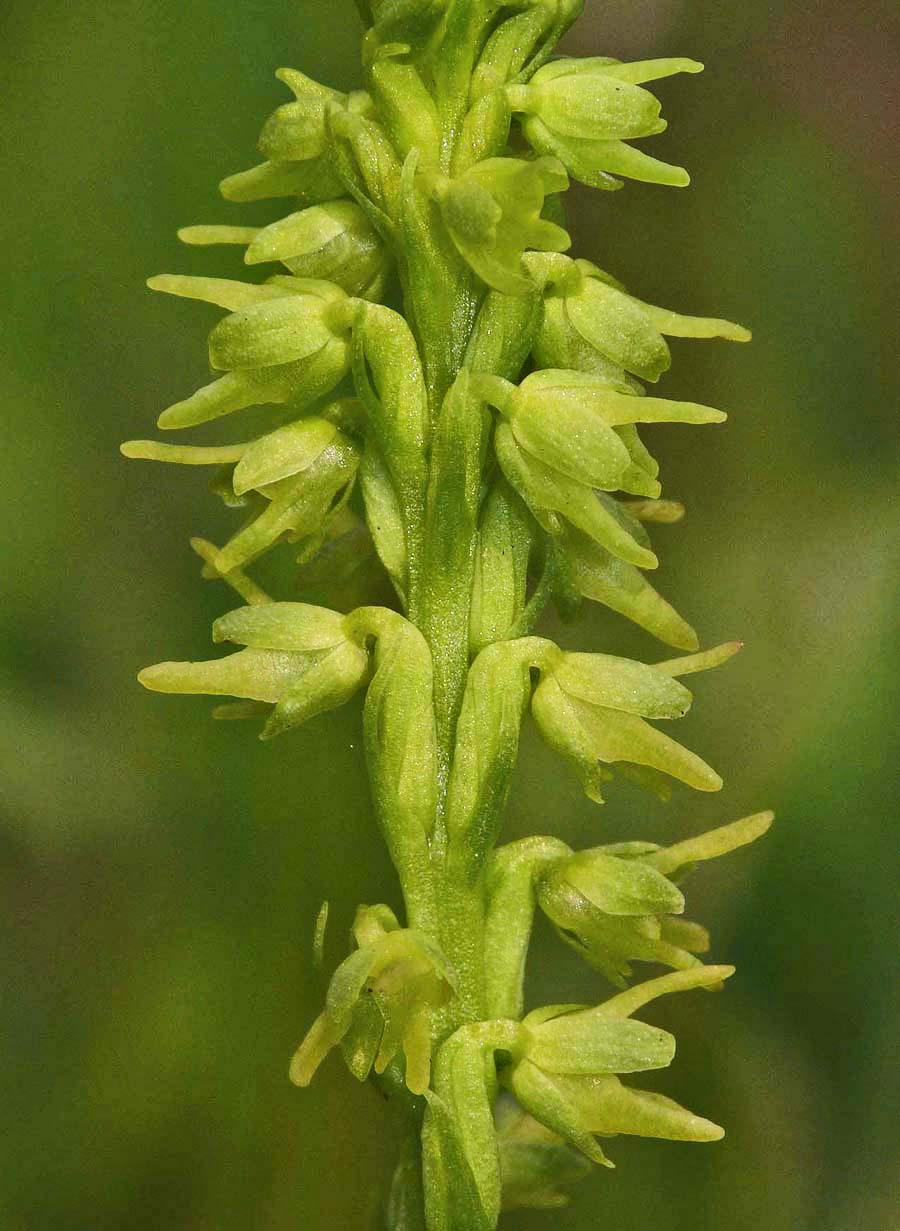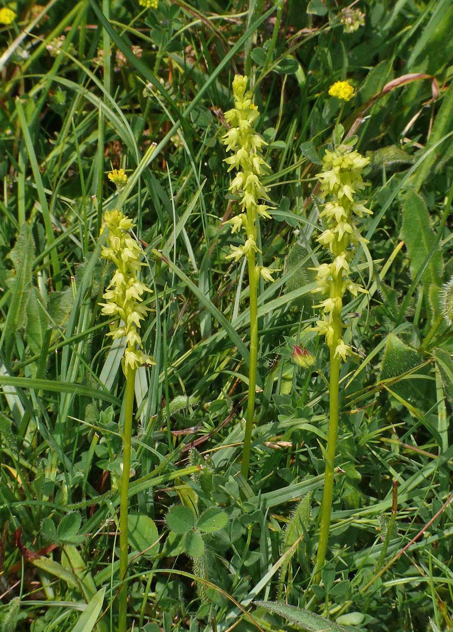 This species is not one of the orchid worlds most striking representatives being both small in stature, plain in colour and without a particularly impressive form, it is however highly attractive to insects and is known to be visited by a wide range of pollinators. Notwithstanding this, seed production is low and propagation is largely by means of vegetative spread. H. monorchis has a distinctive scent which probably accounts for its popularity with insects. Its common name in Britain is the "Musk Orchid" but this is somewhat uncomplimentary as the scent has a characteristic honey fragrance. H. monorchis has a wide distribution throughout temperate Europe and has a similarly wide variety of habitat preferences ranging from dry grassland to fens and moist dune slacks. In the UK it s almost entirely a plant of calcareous meadows, normally where a degree of grazing eliminates rank vegetation with which it cannot compete. It is a small plant which although easily overlooked, generally grows in significant colonies. At first glance it is reminiscent of Liparis loeselii, especially in the manner of its growth and the almost translucent green/yellow colouration which can be so difficult to record accurately in a photograph. The pictures accompanying this page are all from Hampshire (UK) and date from the beginning of July. |