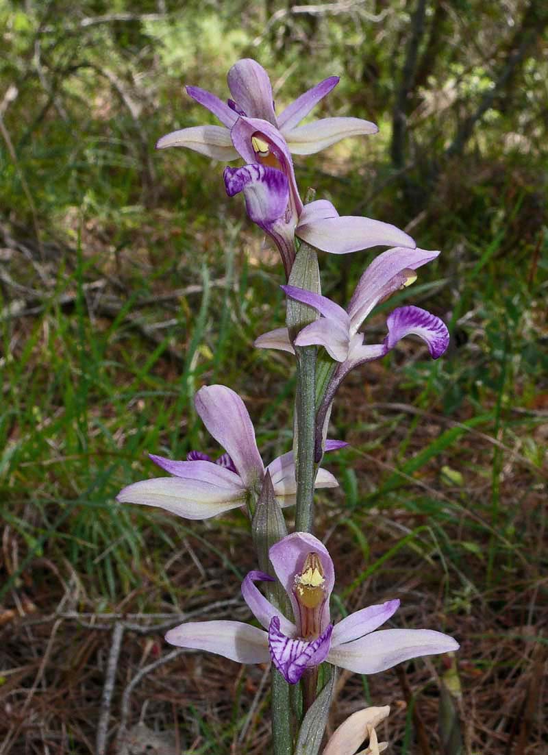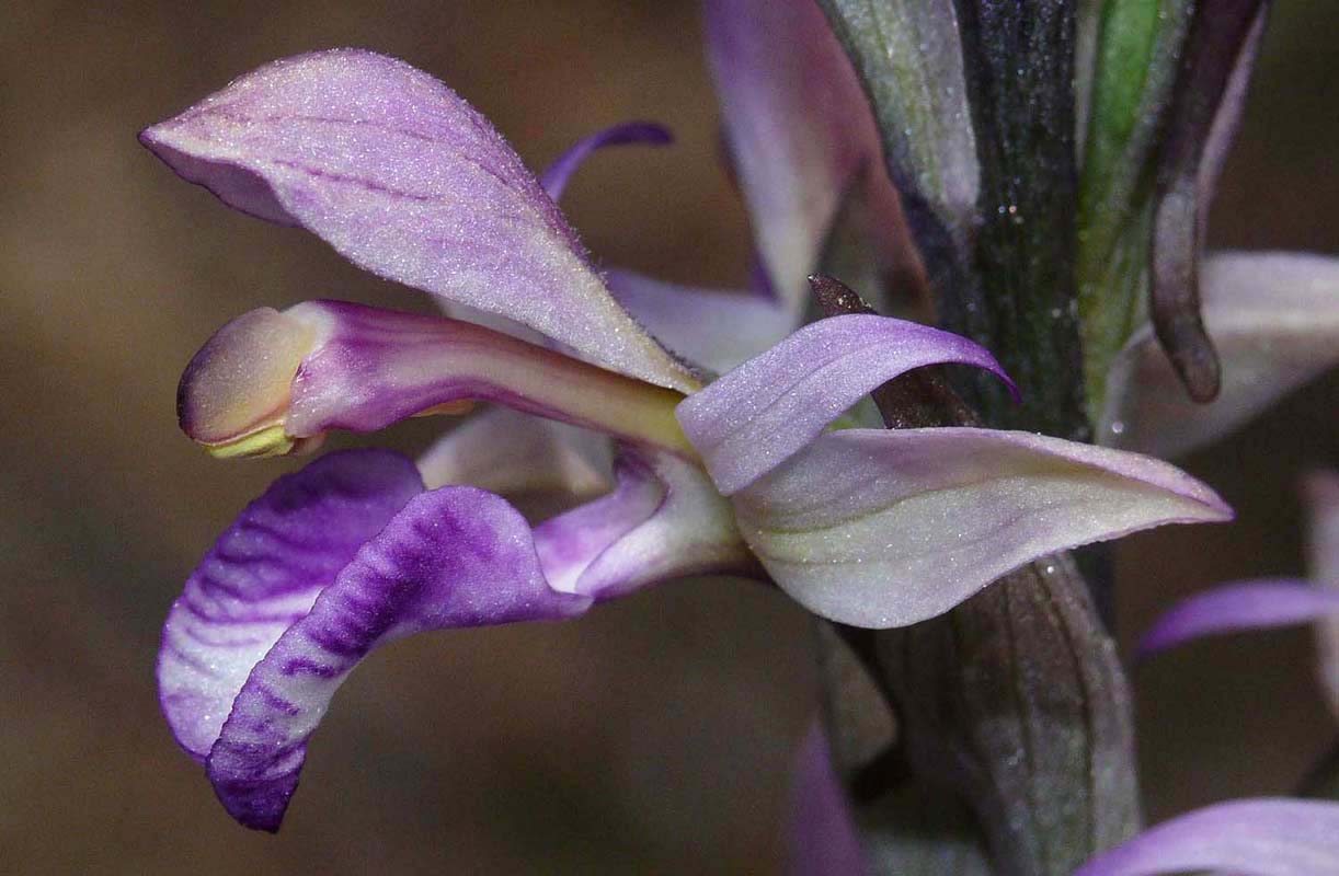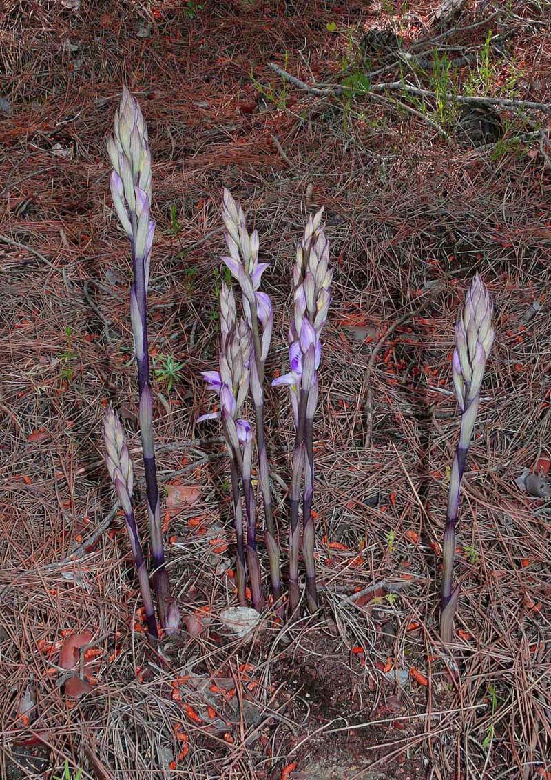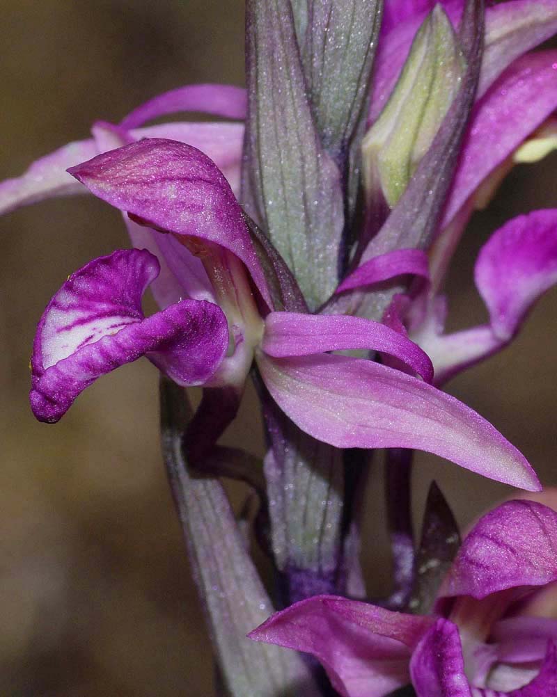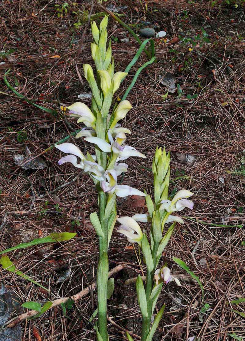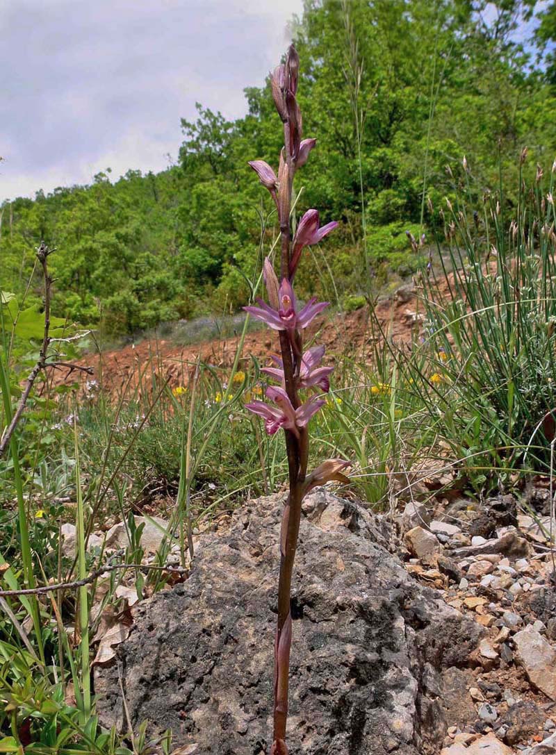 L. abortivum was first described by Swartz from Fontainebleu (France) in 1753 and its name refers to the the small size of the leaves and the manner in which they sheath the stem. Abortivum literally means aborted leaves. This is a curious orchid that still requires study in order to determine its precise biology. Although widely regarded as a wholly saprophytic plant, there are indications that it may (at least in part) be parasitic. Two factors in particular serve to confuse the issue and these are firstly the fact that the stem has been shown to contain measurable levels of chlorophyll and secondly that the plant depends throughout its existence on mycorrhizal fungus. L. abortivum needs little description as it is highly distinctive and impossible to confuse with any other type of orchid. This is a widespread species with a distribution from Belgium in the north, North Africa in the south and at least as far as Russia in the east. It does not occur in Britain and reaches the height of it's abundance in the southern Mediterranean where it is predominantly found on calcareous soils and usually associated with pine forest. This close proximity to living pine trees is another link with possible parasitism but as already mentioned, the physiology is not yet fully understood. The species does have a few described variants but rather as with Anacamptis pyramidalis these are largely colour forms and of no particular evolutionary significance. As can be seen from the illustrations there can be a range of colour forms and all these pictures are from the same colony on the island of Rhodes. They date from the first week of April. |