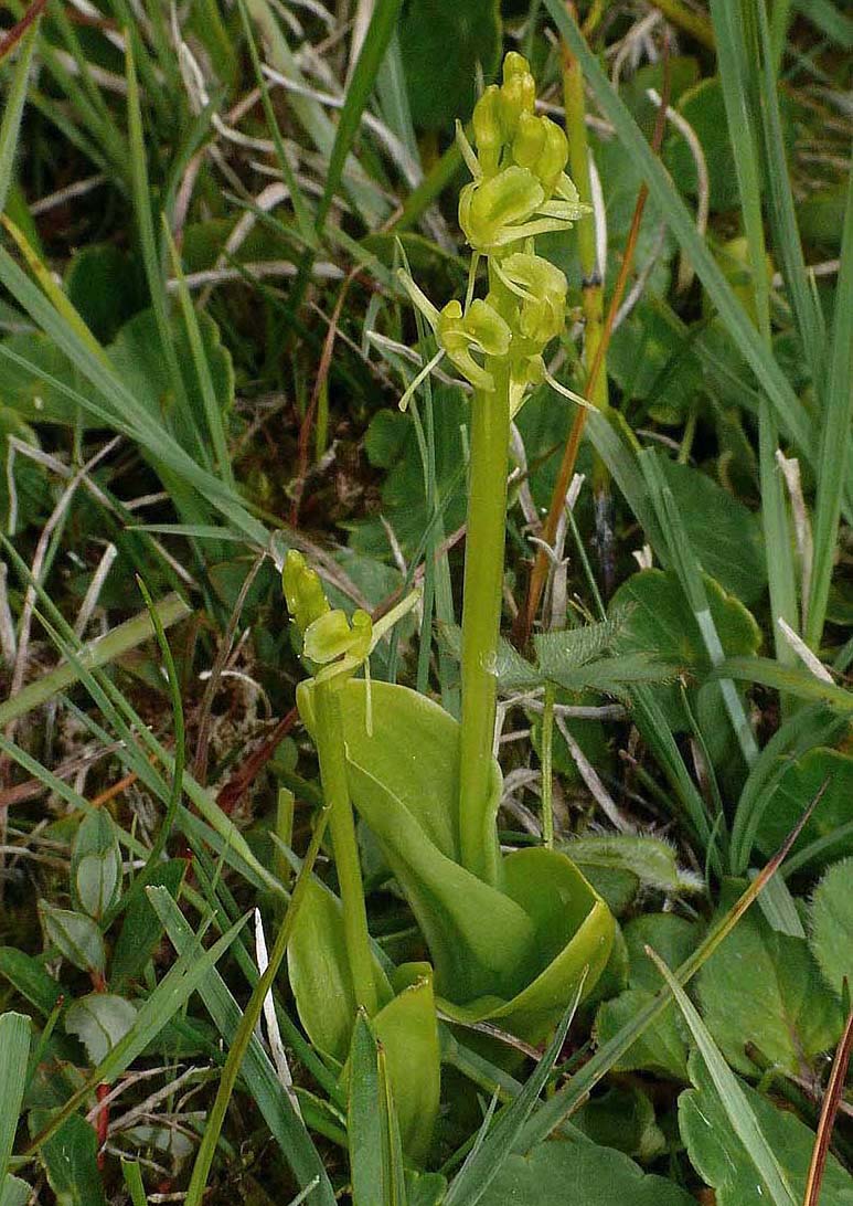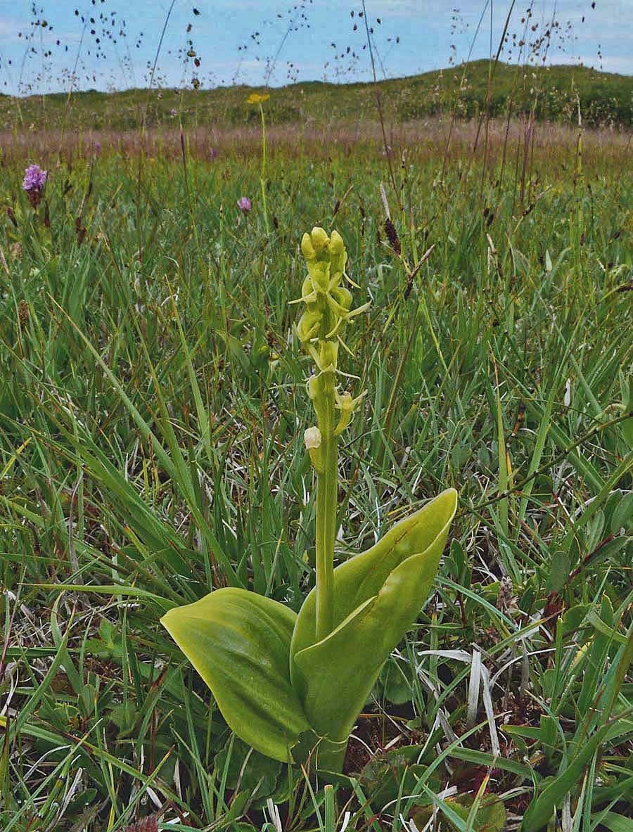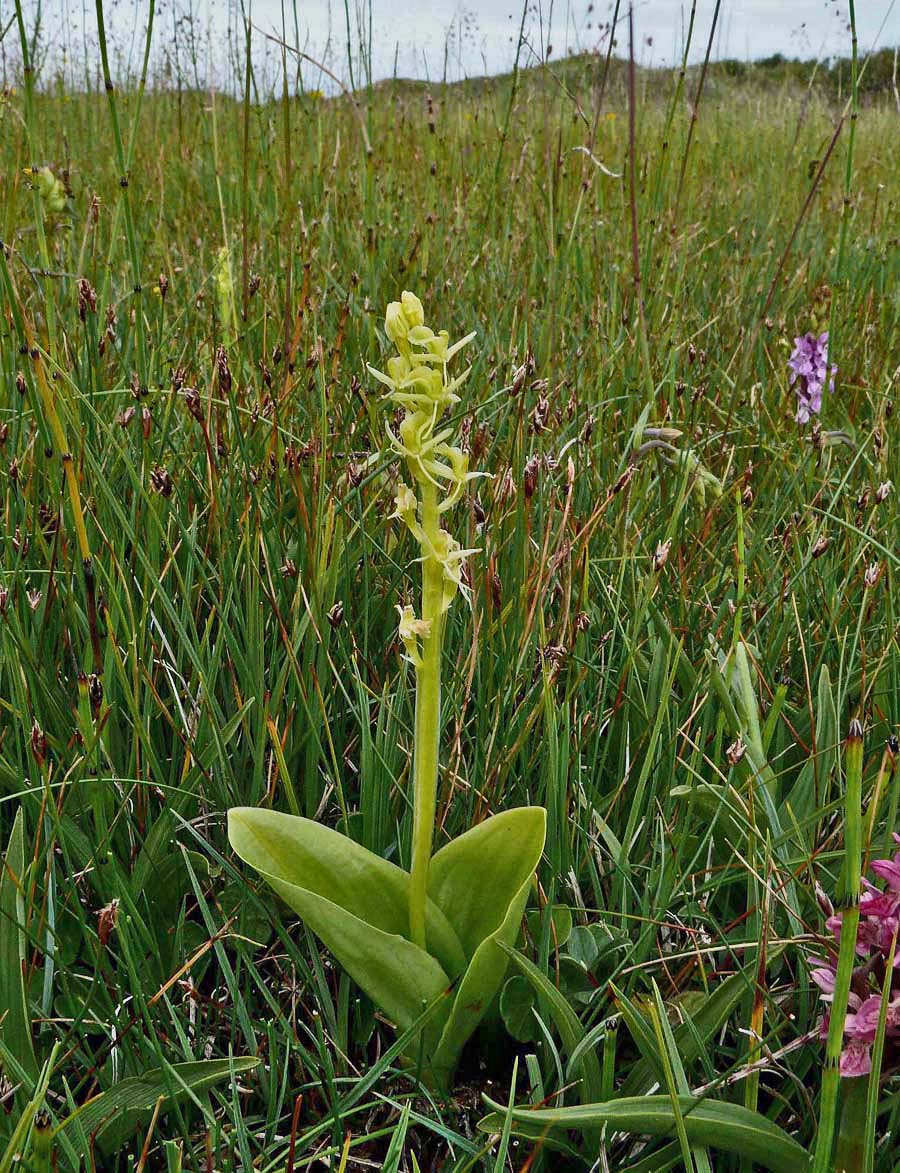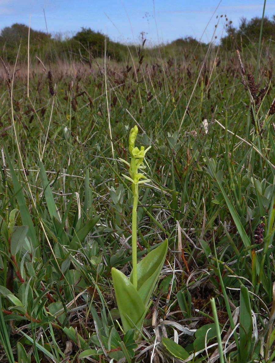 J. Loesel, a 17th century German professor of medicine. This is an increasingly rare species throughout its range and many believe that the continuing pressures on its habitat are driving this orchid inexorably into extinction. In Britain the population of L. loeselii has contracted into two small areas, one in Wales and the other in East Anglia. In the rest of Europe it is widespread but nowhere at all common and drainage together with the general lowering of water tables, sees the species declining in numbers across the continent. L. loeselii is an orchid of fens and wet dune slacks on alkaline to neutral substrates but although it needs a high water table, it will not tolerate any lengthy immersion and is always to be found well to the edge of any standing water. As can be seen from the pictures, the plants at this site in Wales are actually growing in the damp grassland alongside dune slacks rather than amongst the mosses within it. The key to the species survival (and consequently the reason for its disappearance) is a constant supply of moisture to its root tubers. Due to its almost translucent green colouration it is not an easy orchid to find but when one does, it will not be mistaken for any other. When not in flower, the variant ovata (depicted here) strongly resembles a small Neottia ovata . This variety is found only in Wales and northern France. These pictures date from the first week of June. |