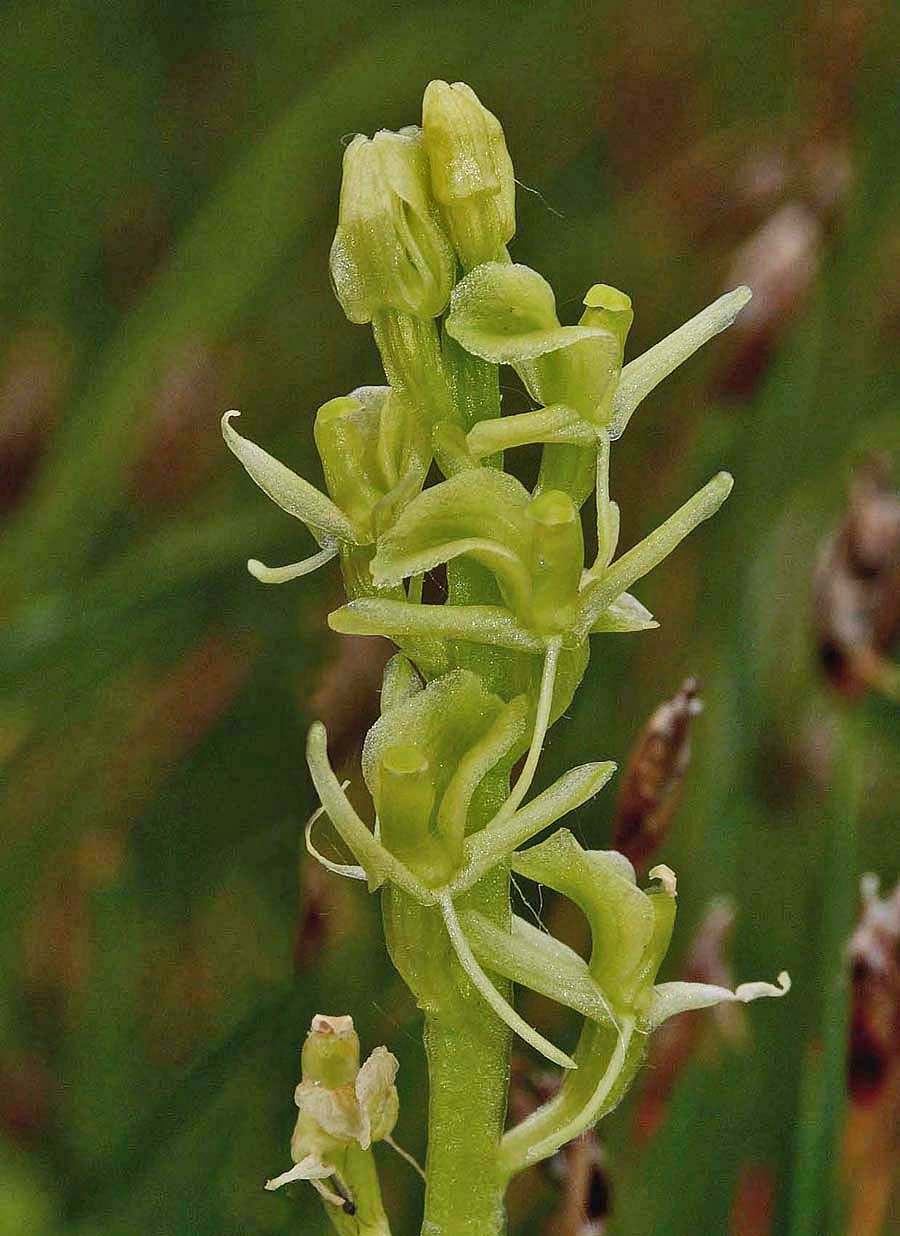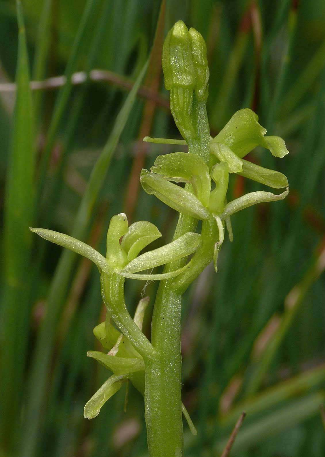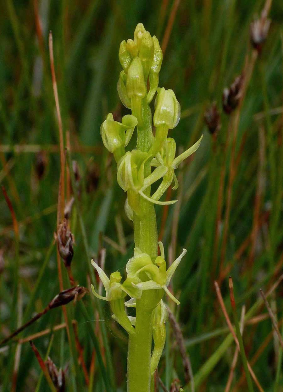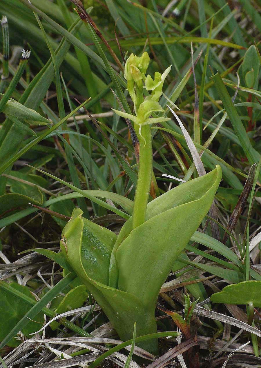 J. Loesel, a 17th century German professor of medicine. This is an increasingly rare species throughout its range and many believe that the continuing pressures on its habitat are driving this orchid inexorably into extinction. In Britain the population of L. loeselii has contracted into two small areas, one in Wales and the other in East Anglia. In the rest of Europe it is widespread but nowhere at all common and drainage together with the general lowering of water tables, sees the species declining in numbers across the continent. L. loeselii is an orchid of fens and wet dune slacks on alkaline to neutral substrates but although it needs a high water table, it will not tolerate any lengthy immersion and is always to be found well to the edge of any standing water. As can be seen from the pictures, the plants at this site in Wales are actually growing in the damp grassland alongside dune slacks rather than amongst the mosses within it. The key to the species survival (and consequently the reason for its disappearance) is a constant supply of moisture to its root tubers. Due to its almost translucent green colouration it is not an easy orchid to find but when one does, it will not be mistaken for any other. When not in flower, the variant ovata (depicted here) strongly resembles a small Neottia ovata . This variety is found only in Wales and northern France. These pictures date from the first week of June. |