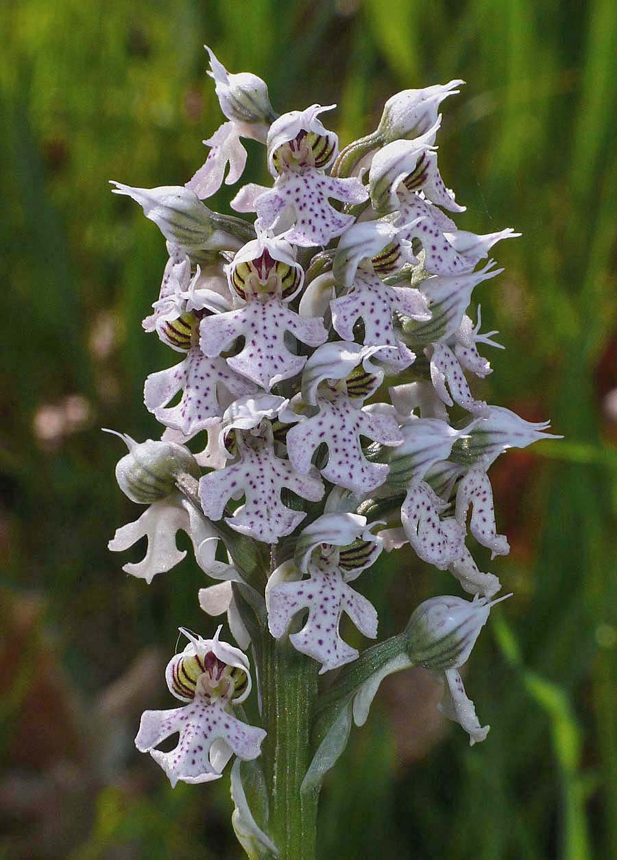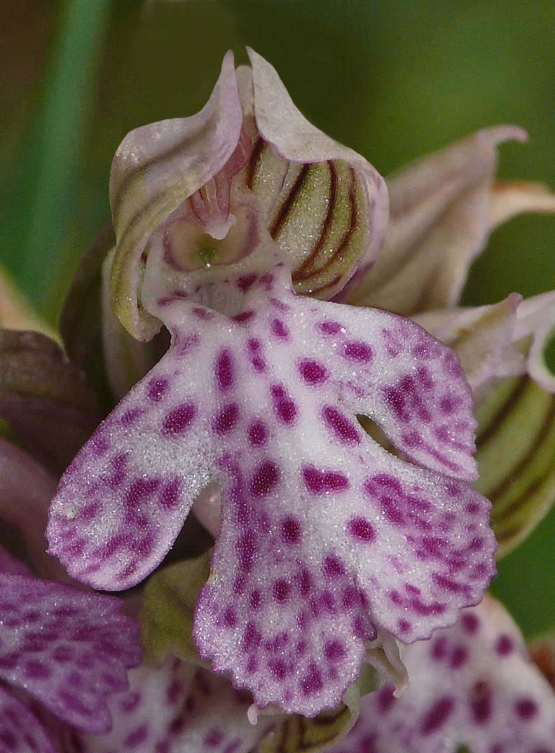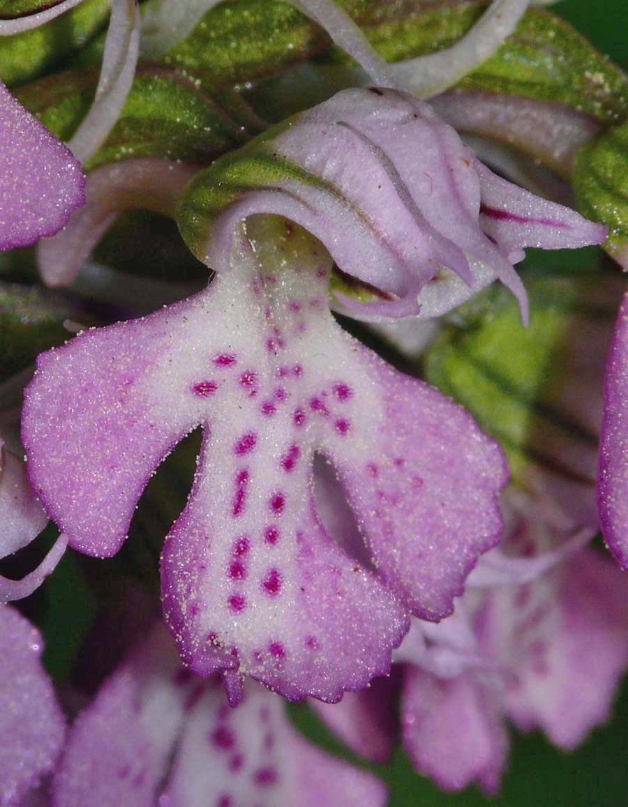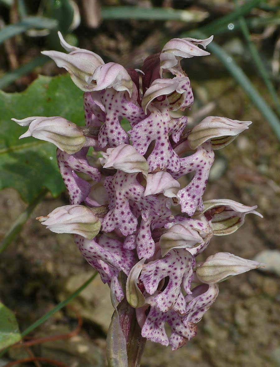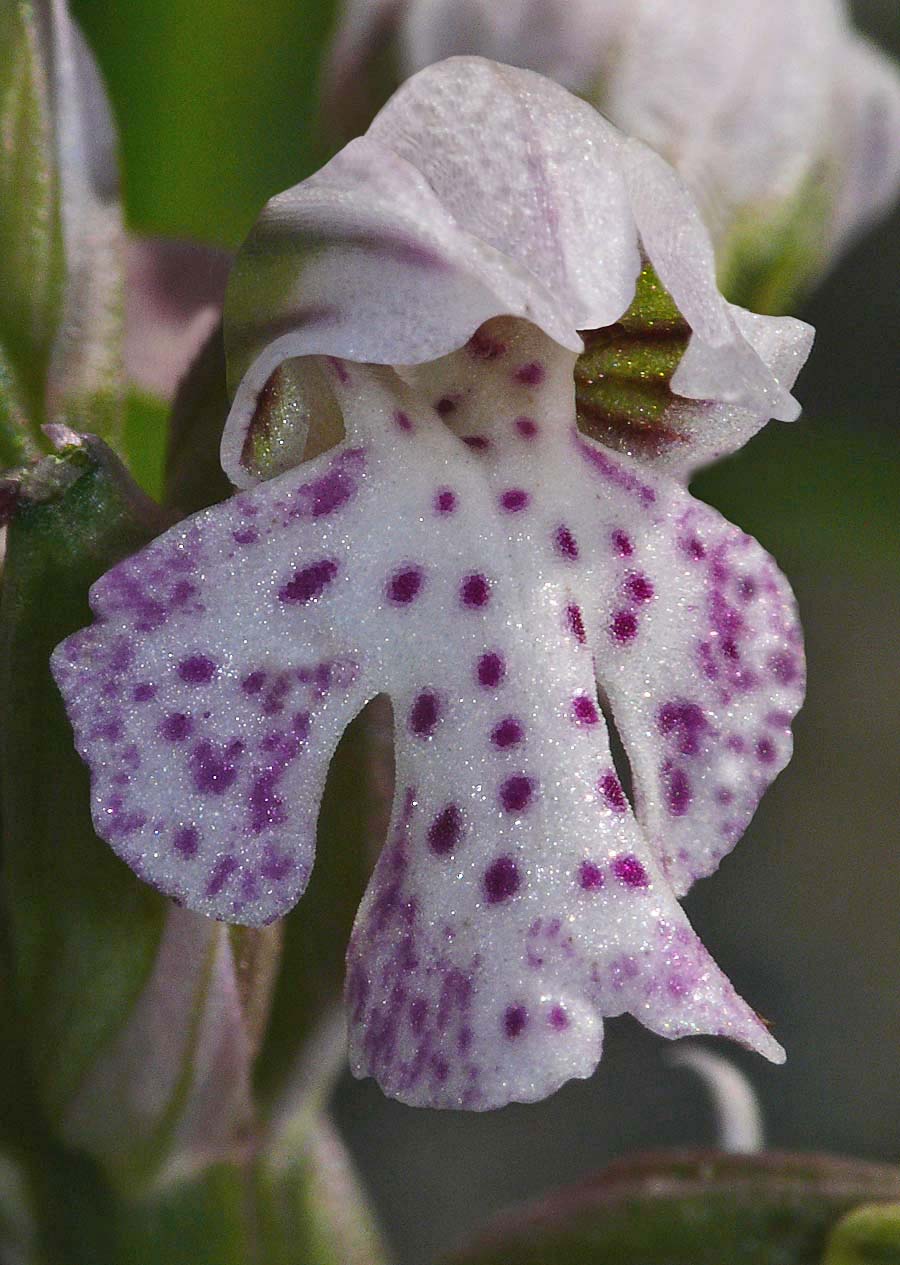 This is a very familiar Mediterranean orchid whose name refers to the milky colour of its flowers. It was first described by Poiret from Algeria in 1798 and originally grouped with the Neotinea genus before then being reclassified as an Orchis. Subsequent studies across the O. tridentata group eventually resulted in all its members, including O. lactea, being returned to the Neotinea stable. N. lactea is a widespread orchid ranging throughout the Mediterranean and at its most frequent around the Aegean. Its distribution is not however fully understood due to confusion with N. tridentata, N. conica and N. commutata. There is currently a movement seeking to separate the N. lactea growing in southern Corsica and proposing its reclassification as the long forgotten Orchis corsica, now referred to as N. lactea subsp. corsica (see pictures 10 and 11). These pink flushed plants do not however seem to represent any evolutionary significance. There are two significant features which differentiate N. lactea from the others :- 1. it has an elongated inflorescence that usually (but by no means always) carries numerous tightly packed flowers. N. commutata and N. conica have a conical shaped inflorescence and N. tridentata is flat topped with a longer stem. 2. The lip has a geniculated profile and strongly recurved margins creating the impression of a body builder throwing his chest forward and shoulders back (see 4). The other species all have flat profiled lips with edges that are either straight or curved forward. A less reliable feature of N. lactea is the colouration of the inner hood which is generally greener and more boldly lined. As can be seen from the illustrations, lip markings and colouration can vary widely from pure white to an almost solid dark pink, the typical flower is however white/pale pink with darker spots or striation. The photographs come from Crete, Sardinia and Sicily and were all taken during the first two weeks of April. |