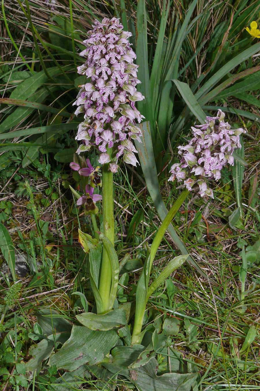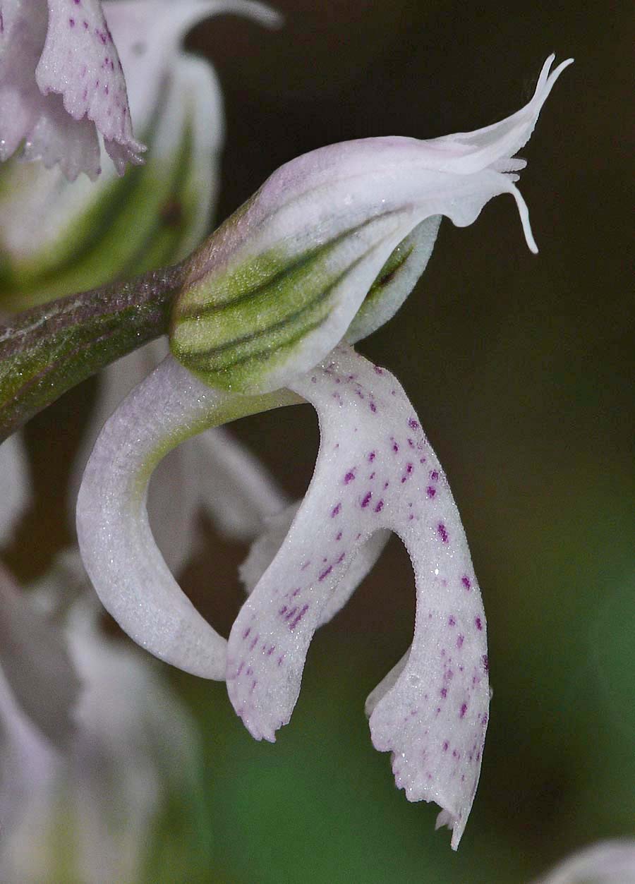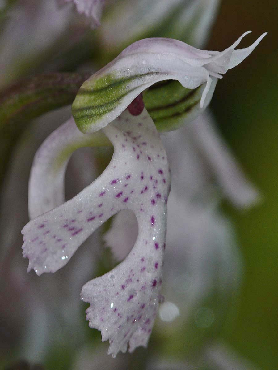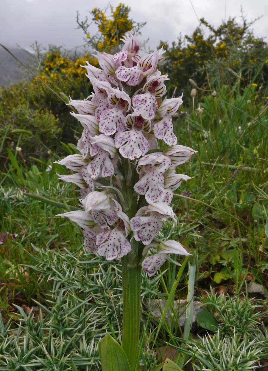 This is a very familiar Mediterranean orchid whose name refers to the milky colour of its flowers. It was first described by Poiret from Algeria in 1798 and originally grouped with the Neotinea genus before then being reclassified as an Orchis. Subsequent studies across the O. tridentata group eventually resulted in all its members, including O. lactea, being returned to the Neotinea stable. N. lactea is a widespread orchid ranging throughout the Mediterranean and at its most frequent around the Aegean. Its distribution is not however fully understood due to confusion with N. tridentata, N. conica and N. commutata. There is currently a movement seeking to separate the N. lactea growing in southern Corsica and proposing its reclassification as the long forgotten Orchis corsica, now referred to as N. lactea subsp. corsica (see pictures 10 and 11). These pink flushed plants do not however seem to represent any evolutionary significance. There are two significant features which differentiate N. lactea from the others :- 1. it has an elongated inflorescence that usually (but by no means always) carries numerous tightly packed flowers. N. commutata and N. conica have a conical shaped inflorescence and N. tridentata is flat topped with a longer stem. 2. The lip has a geniculated profile and strongly recurved margins creating the impression of a body builder throwing his chest forward and shoulders back (see 4). The other species all have flat profiled lips with edges that are either straight or curved forward. A less reliable feature of N. lactea is the colouration of the inner hood which is generally greener and more boldly lined. As can be seen from the illustrations, lip markings and colouration can vary widely from pure white to an almost solid dark pink, the typical flower is however white/pale pink with darker spots or striation. The photographs come from Crete, Sardinia and Sicily and were all taken during the first two weeks of April. |