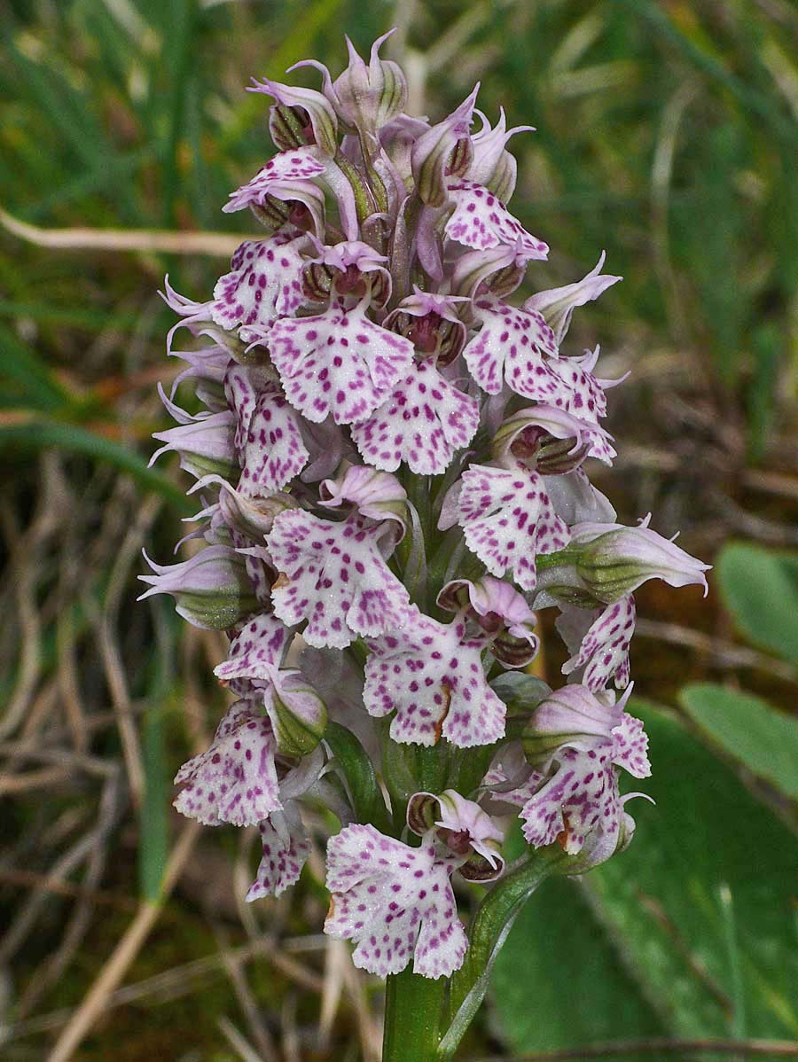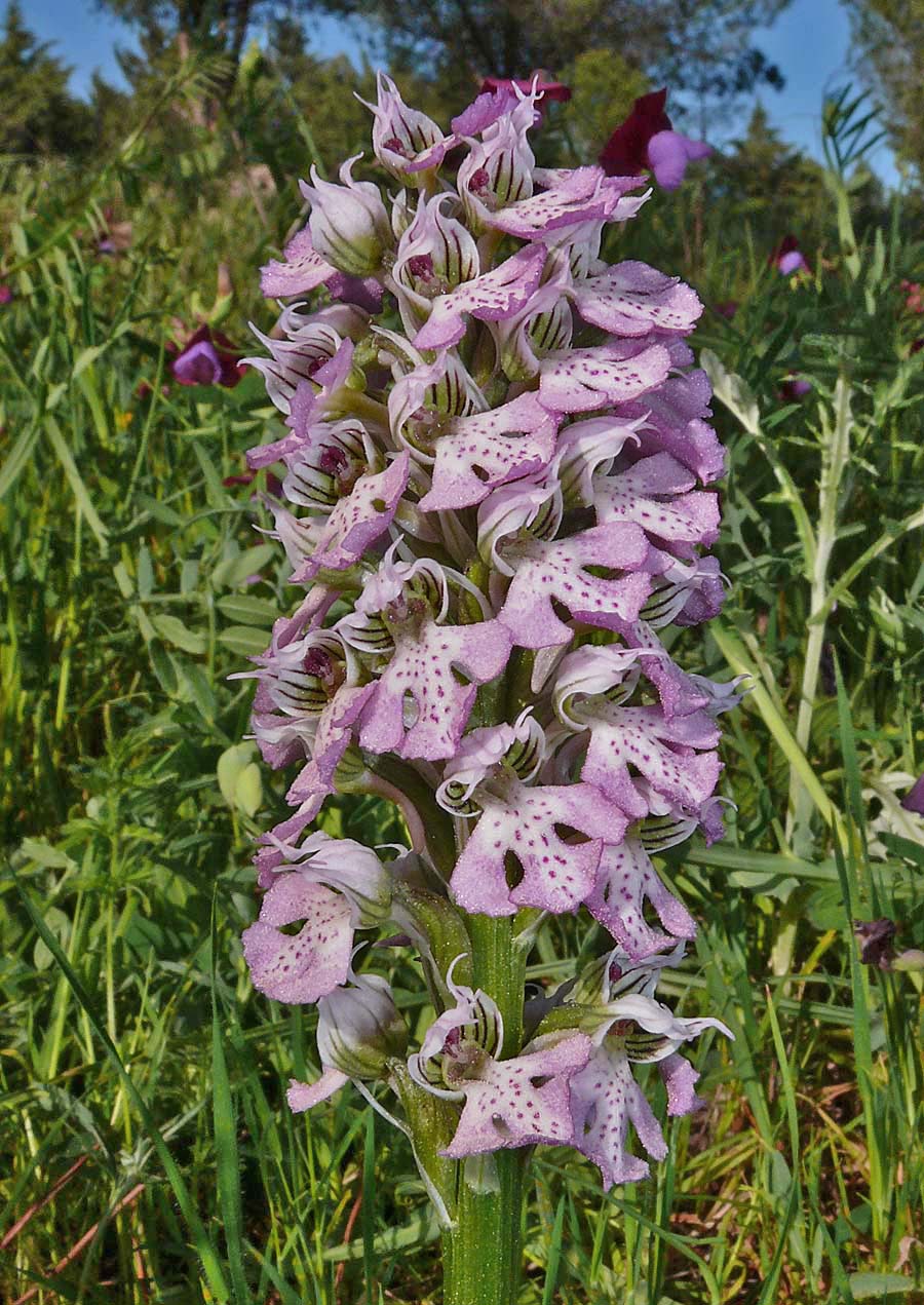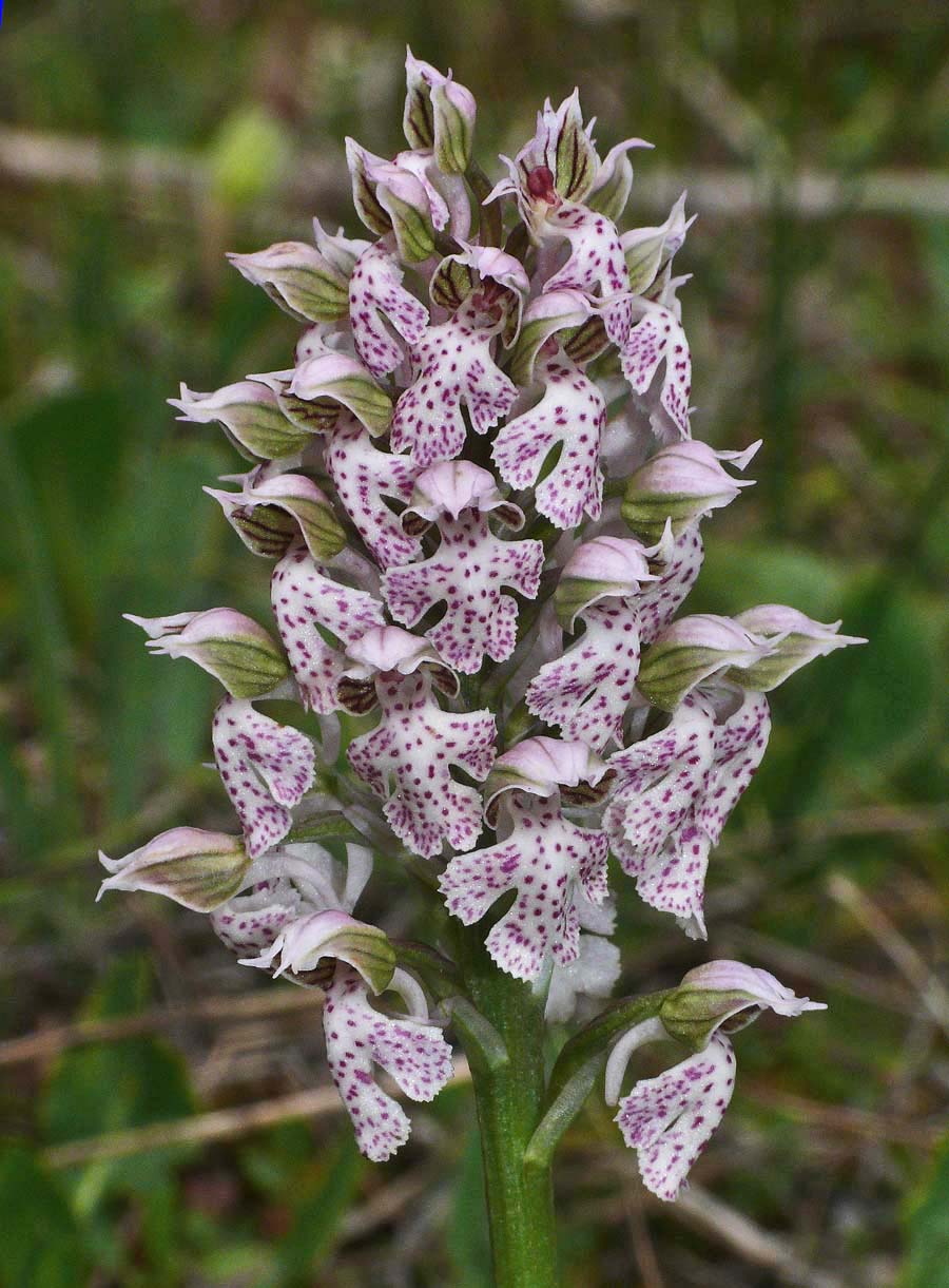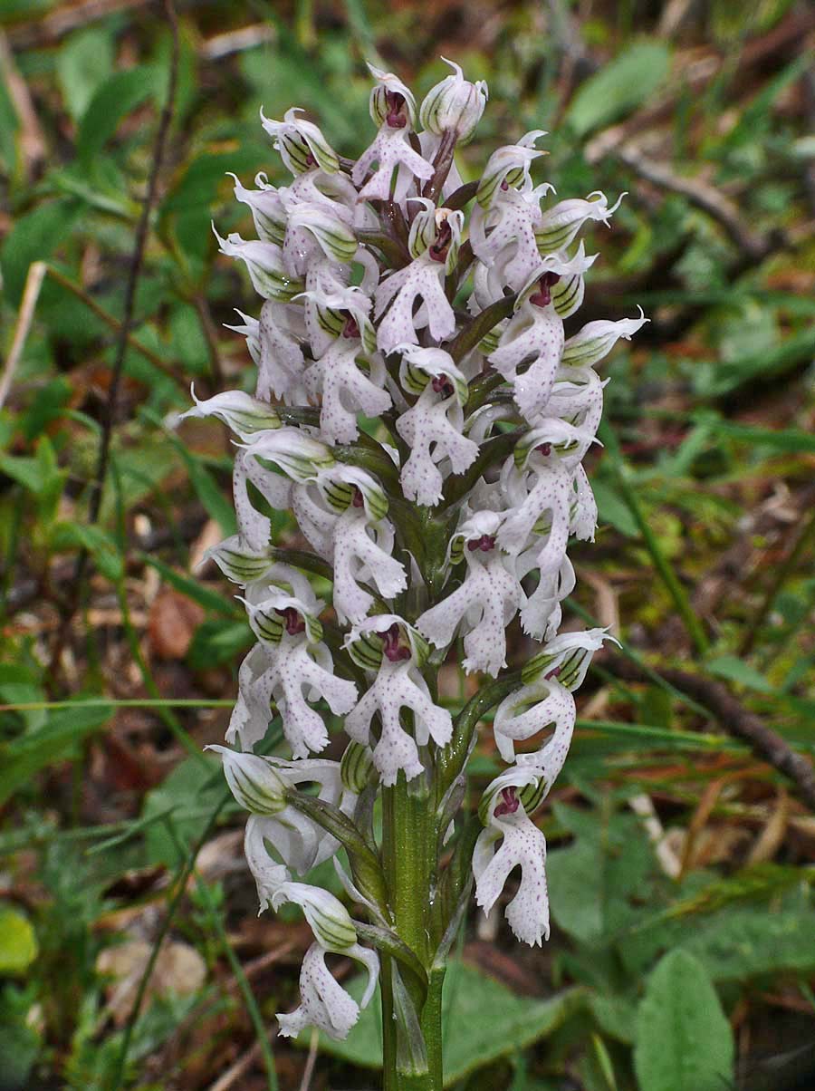 This is a very familiar Mediterranean orchid whose name refers to the milky colour of its flowers. It was first described by Poiret from Algeria in 1798 and originally grouped with the Neotinea genus before then being reclassified as an Orchis. Subsequent studies across the O. tridentata group eventually resulted in all its members, including O. lactea, being returned to the Neotinea stable. N. lactea is a widespread orchid ranging throughout the Mediterranean and at its most frequent around the Aegean. Its distribution is not however fully understood due to confusion with N. tridentata, N. conica and N. commutata. There is currently a movement seeking to separate the N. lactea growing in southern Corsica and proposing its reclassification as the long forgotten Orchis corsica, now referred to as N. lactea subsp. corsica (see pictures 10 and 11). These pink flushed plants do not however seem to represent any evolutionary significance. There are two significant features which differentiate N. lactea from the others :- 1. it has an elongated inflorescence that usually (but by no means always) carries numerous tightly packed flowers. N. commutata and N. conica have a conical shaped inflorescence and N. tridentata is flat topped with a longer stem. 2. The lip has a geniculated profile and strongly recurved margins creating the impression of a body builder throwing his chest forward and shoulders back (see 4). The other species all have flat profiled lips with edges that are either straight or curved forward. A less reliable feature of N. lactea is the colouration of the inner hood which is generally greener and more boldly lined. As can be seen from the illustrations, lip markings and colouration can vary widely from pure white to an almost solid dark pink, the typical flower is however white/pale pink with darker spots or striation. The photographs come from Crete, Sardinia and Sicily and were all taken during the first two weeks of April. |