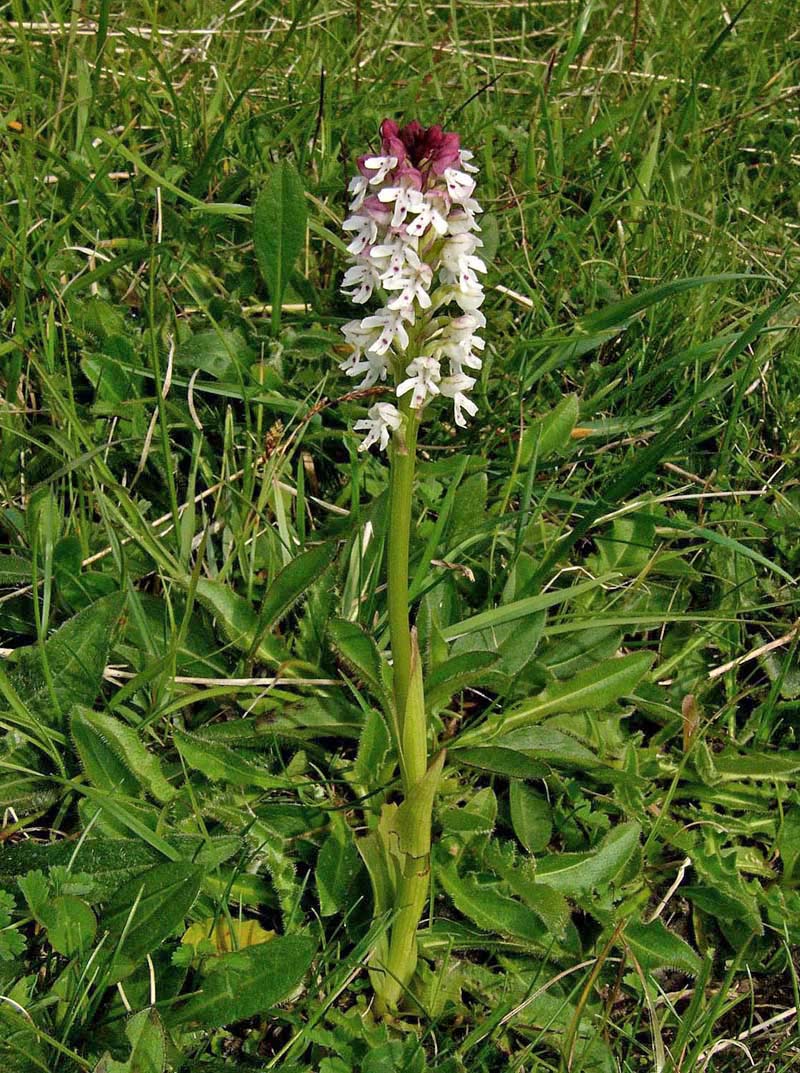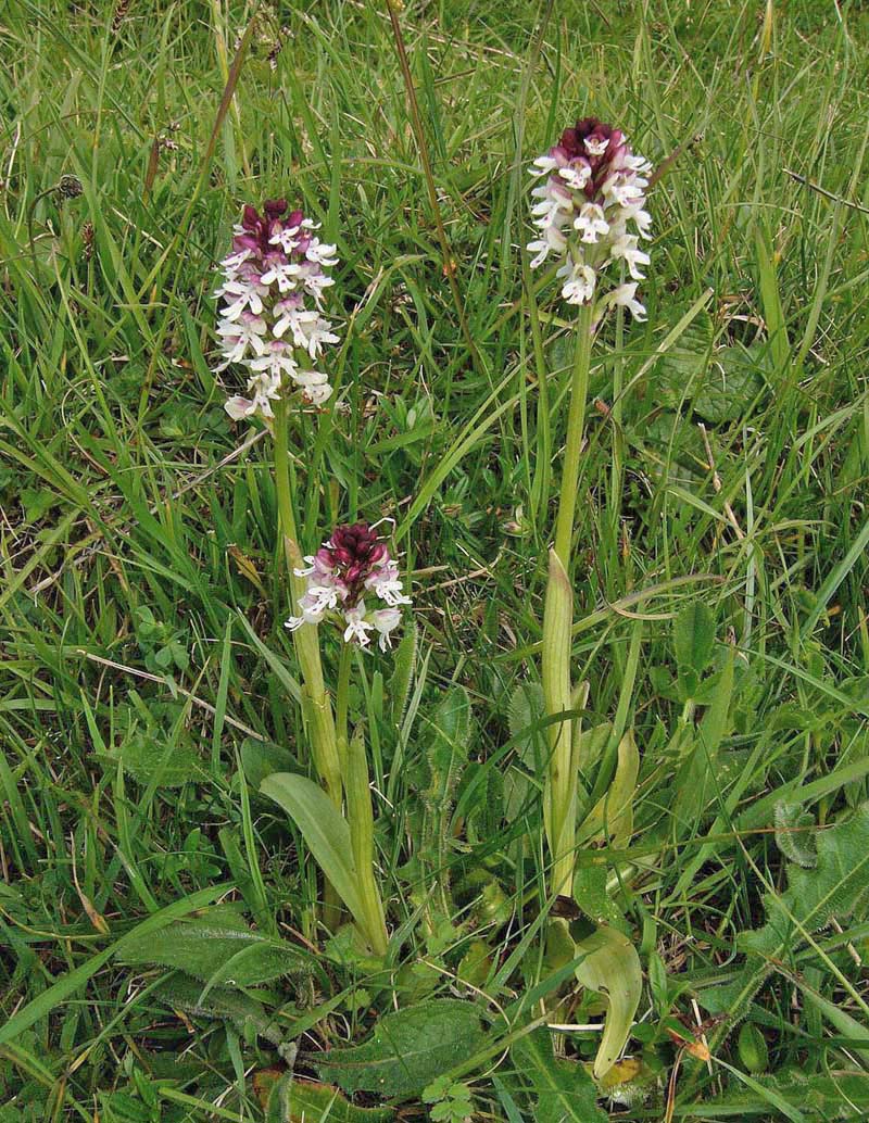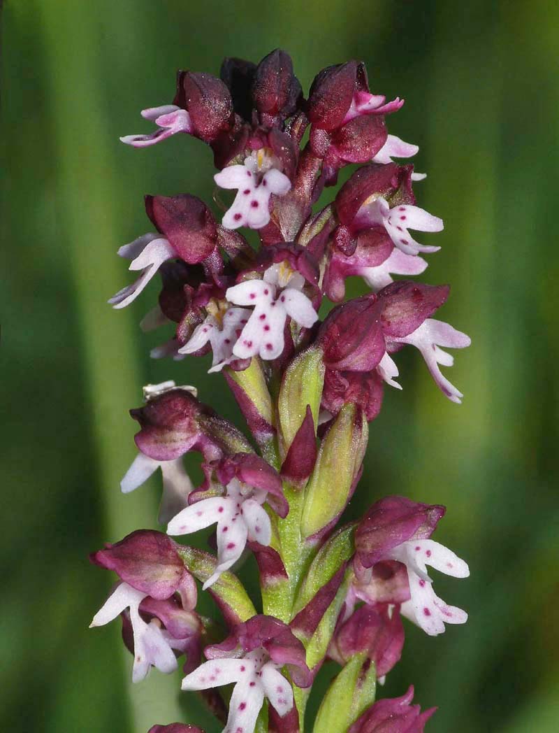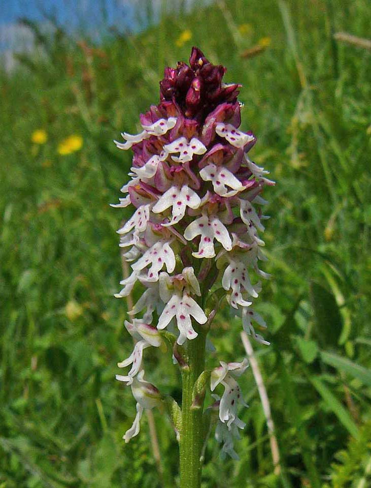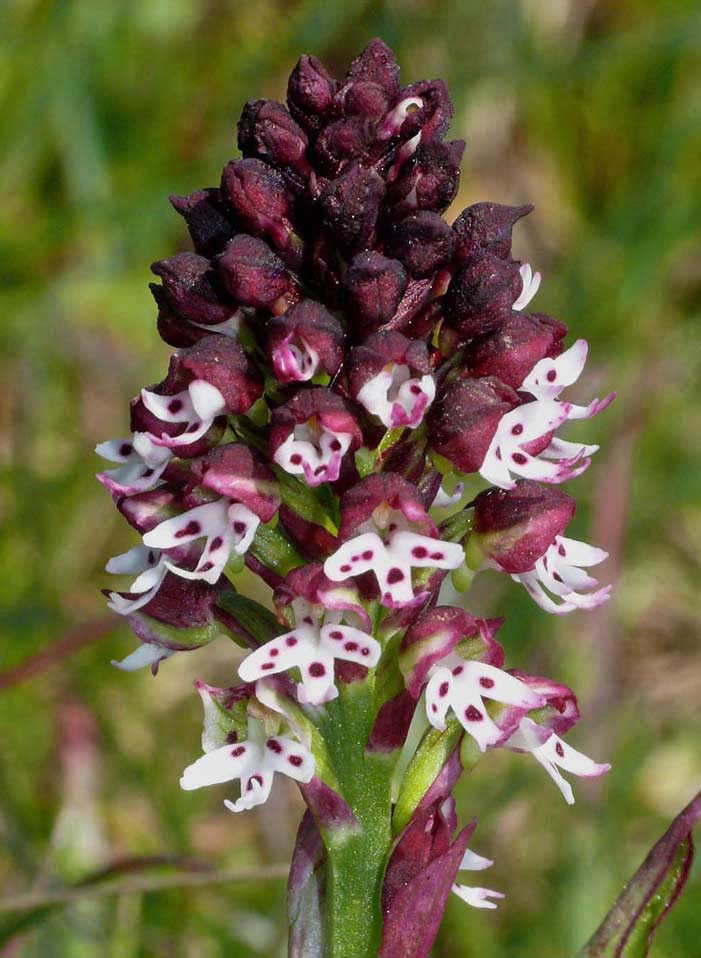 This beautiful little orchid was first described from Sweden in 1753 and its name refers to the dark red colouration of the unopened flowers which produces the scorched effect giving rise to its common name of the Burnt-Tip Orchid. N. ustulata is an isolated species that has always been the subject of debate as to its true generic home. It started its formally described existence as Neotinia ustulata and was then reclassified as an Orchis where it remained for many years until research indicated both it and its fellow O. tridentata group members should more correctly be placed back in the Neotinia stable. It was always puzzling that despite often growing in its thousands with other species of Orchis, O. ustulata was never found to have hybridized with any species other than O. tridentata. This is a widespread orchid with a range that takes it from the Faroe Islands and Sweden in the north, down to the Mediterranean and eastwards all the way to western Siberia. It's usually at its most common in montane areas where it prefers a position in full sun on alkaline soils, usually short grass and alpine pastures. In Britain it's found only in England and predominantly in the south east where unfortunately it is declining in both sites and overall numbers. In England N. ustulata appears in May but elsewhere and given the range of eco-zones it covers, it can be as early as April and as late as August. It is now known to have at least two successive waves of flowering and these later flowering plants are thought to be a separate sub-species, provisionally named aestivalis. |