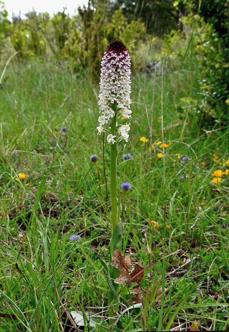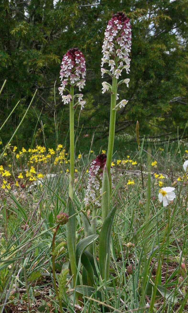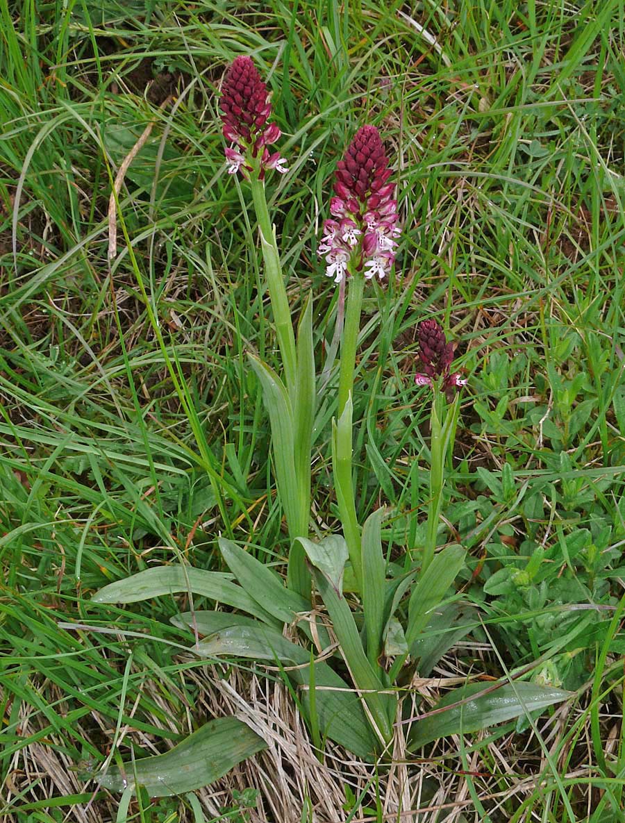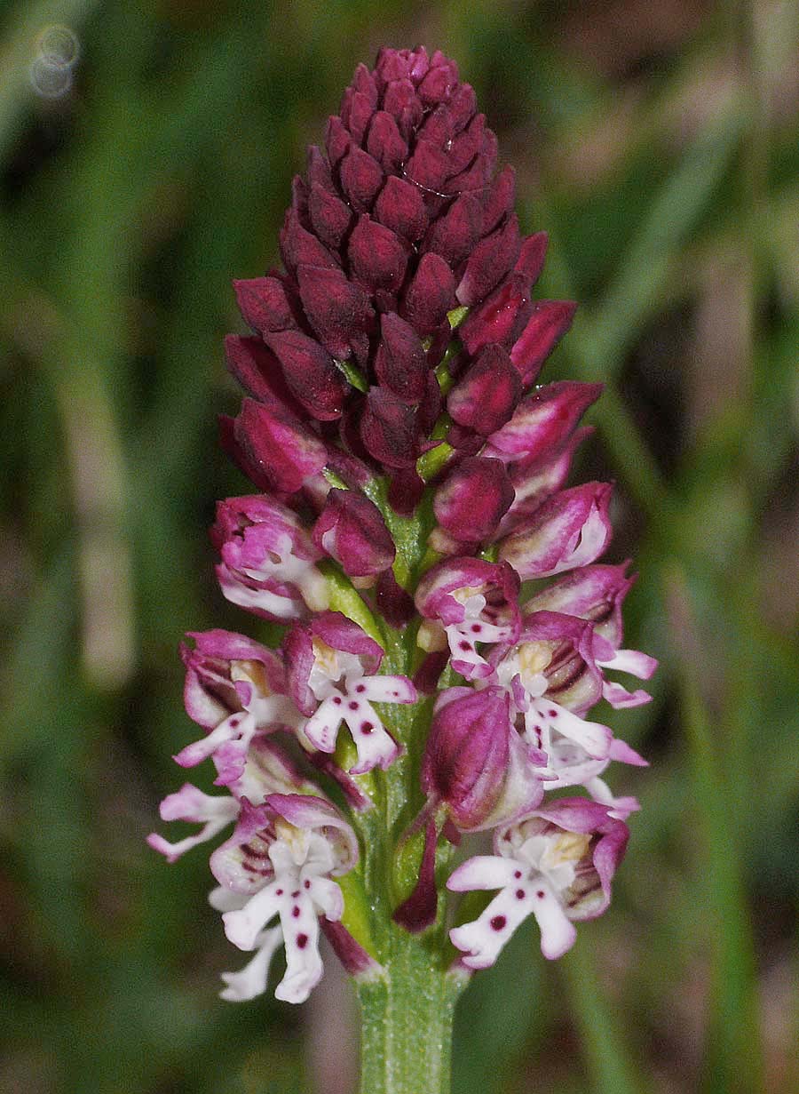 This beautiful little orchid was first described from Sweden in 1753 and its name refers to the dark red colouration of the unopened flowers which produces the scorched effect giving rise to its common name of the Burnt-Tip Orchid. N. ustulata is an isolated species that has always been the subject of debate as to its true generic home. It started its formally described existence as Neotinia ustulata and was then reclassified as an Orchis where it remained for many years until research indicated both it and its fellow O. tridentata group members should more correctly be placed back in the Neotinia stable. It was always puzzling that despite often growing in its thousands with other species of Orchis, O. ustulata was never found to have hybridized with any species other than O. tridentata. This is a widespread orchid with a range that takes it from the Faroe Islands and Sweden in the north, down to the Mediterranean and eastwards all the way to western Siberia. It's usually at its most common in montane areas where it prefers a position in full sun on alkaline soils, usually short grass and alpine pastures. In Britain it's found only in England and predominantly in the south east where unfortunately it is declining in both sites and overall numbers. In England N. ustulata appears in May but elsewhere and given the range of eco-zones it covers, it can be as early as April and as late as August. It is now known to have at least two successive waves of flowering and these later flowering plants are thought to be a separate sub-species, provisionally named aestivalis. |