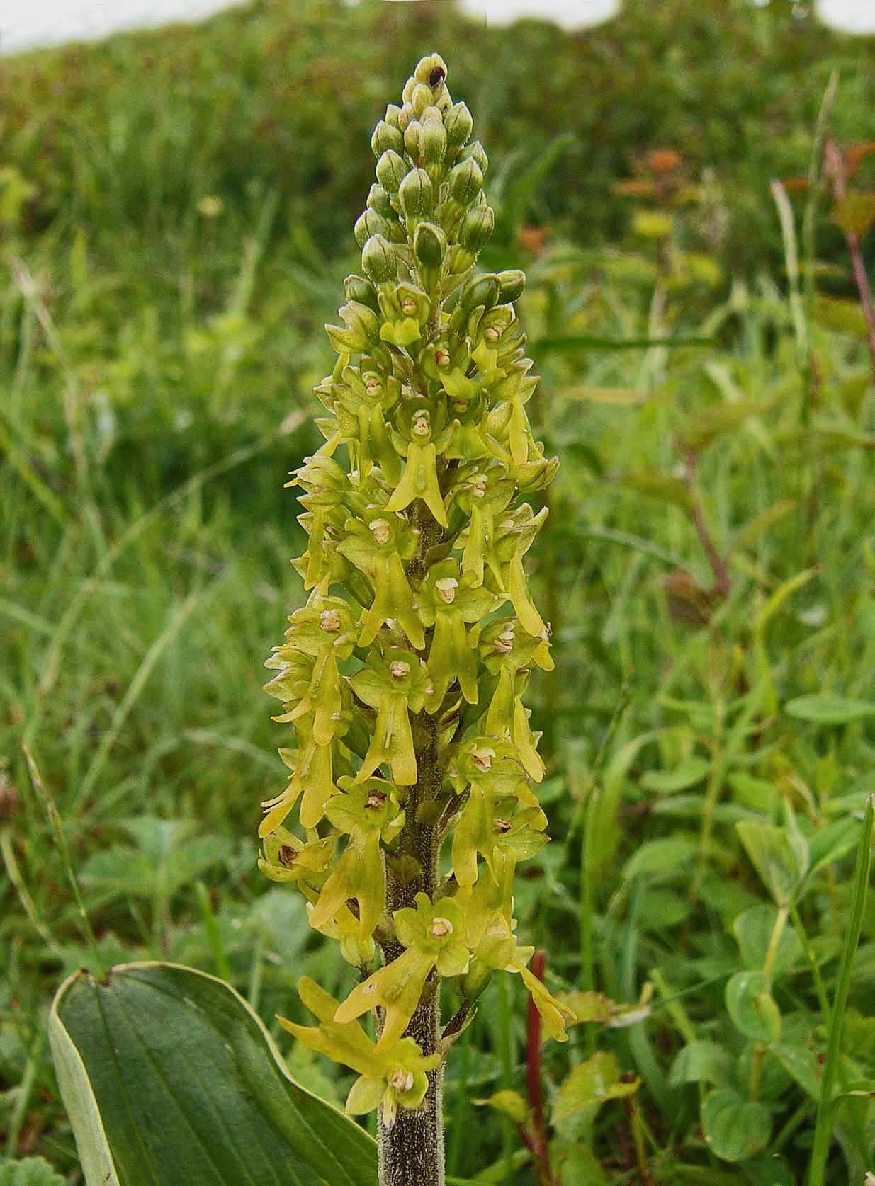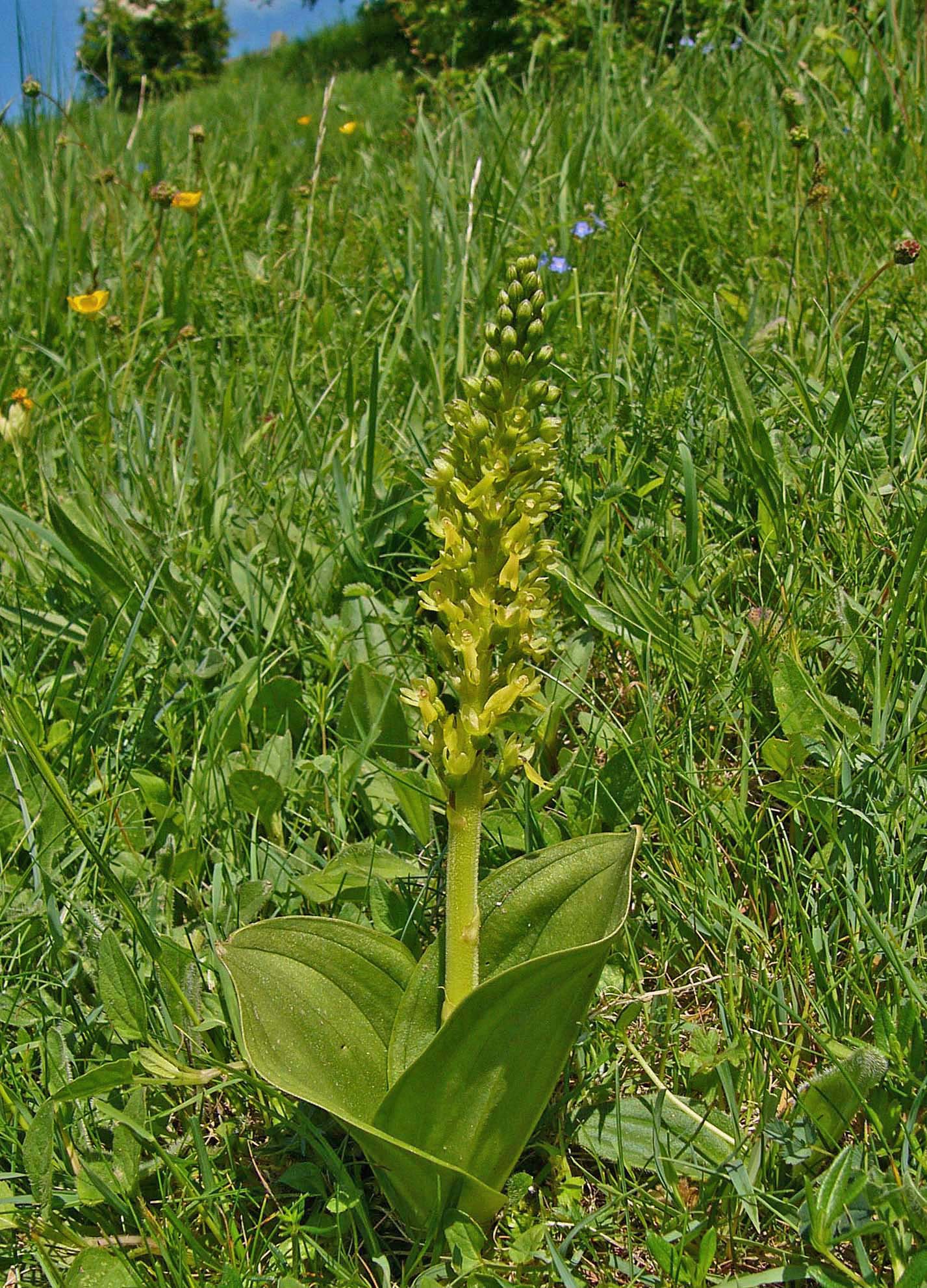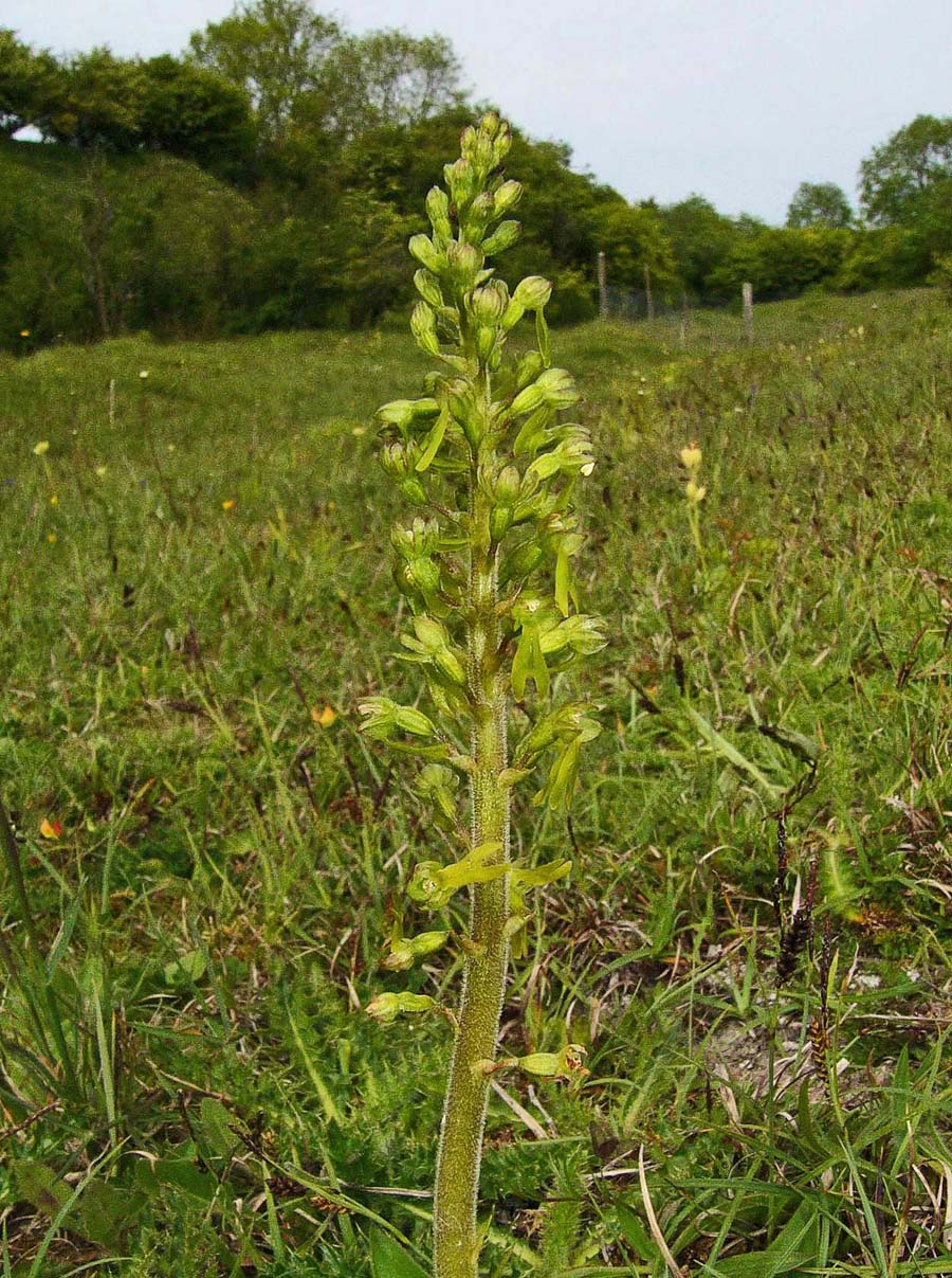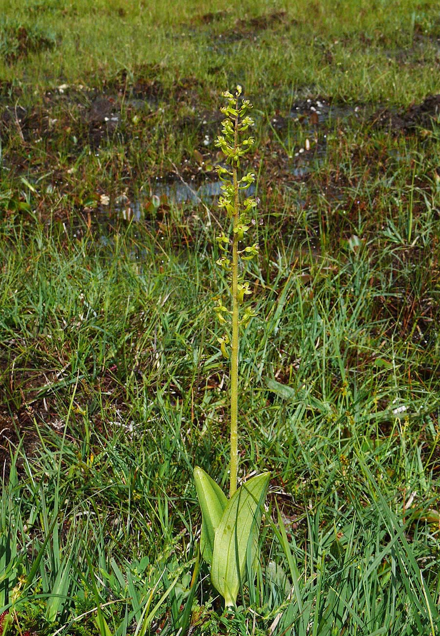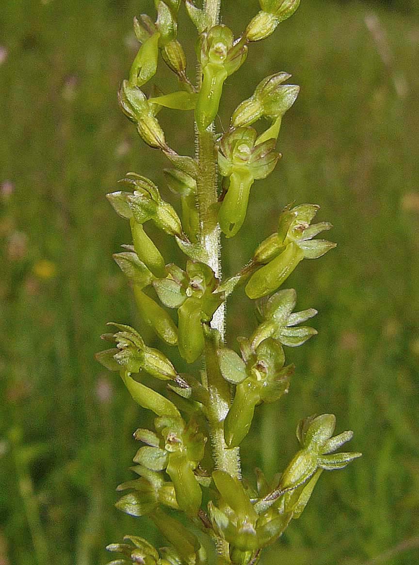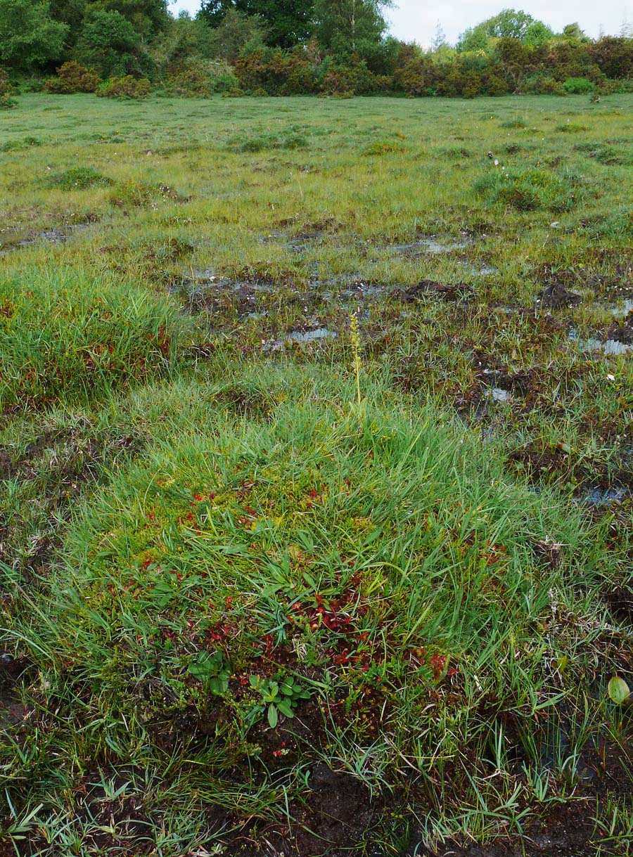 This is arguably the most familiar and widespread orchid in temperate Europe, though extremely rare in the Mediterranean zones. It is a species well suited to 21st century existence in that it tolerates a wide range of conditions and possesses a pollination system that allows a huge variety of insects to trigger its reproductive mechanisms. N. ovata, as with its smaller but close relative N. cordata produces copious nectar and insects following this bountiful trail immediately activate a sensitive internal apparatus which fires off a droplet of liquid that sets hard on the visiting insects head. There are few orchids which can really be described as common, but in as far as this circumstance exists, N. ovata is a common orchid and one which can be found growing in a huge range of conditions, with the exception of the most strongly acidic substrates. Full sun or heavy shade, damp or dry soils and even high altitude seem to be a matter of insignificance to this hardy species, though as mentioned earlier it draws a line at the excessively high Spring temperatures of the Mediterranean. Another reason for this species success is its ability to survive and flower for more than twenty years without the presence of mycorrhiza. This is an orchid which although somewhat unprepossessing in appearance, is truly robust and likely to survive where other species capitulate to modern agricultural and population pressures. An example of the adaptability of this species can be seen in the final two photos which depict a plant growing in an acidic bog in the New Forest of southern England.  |