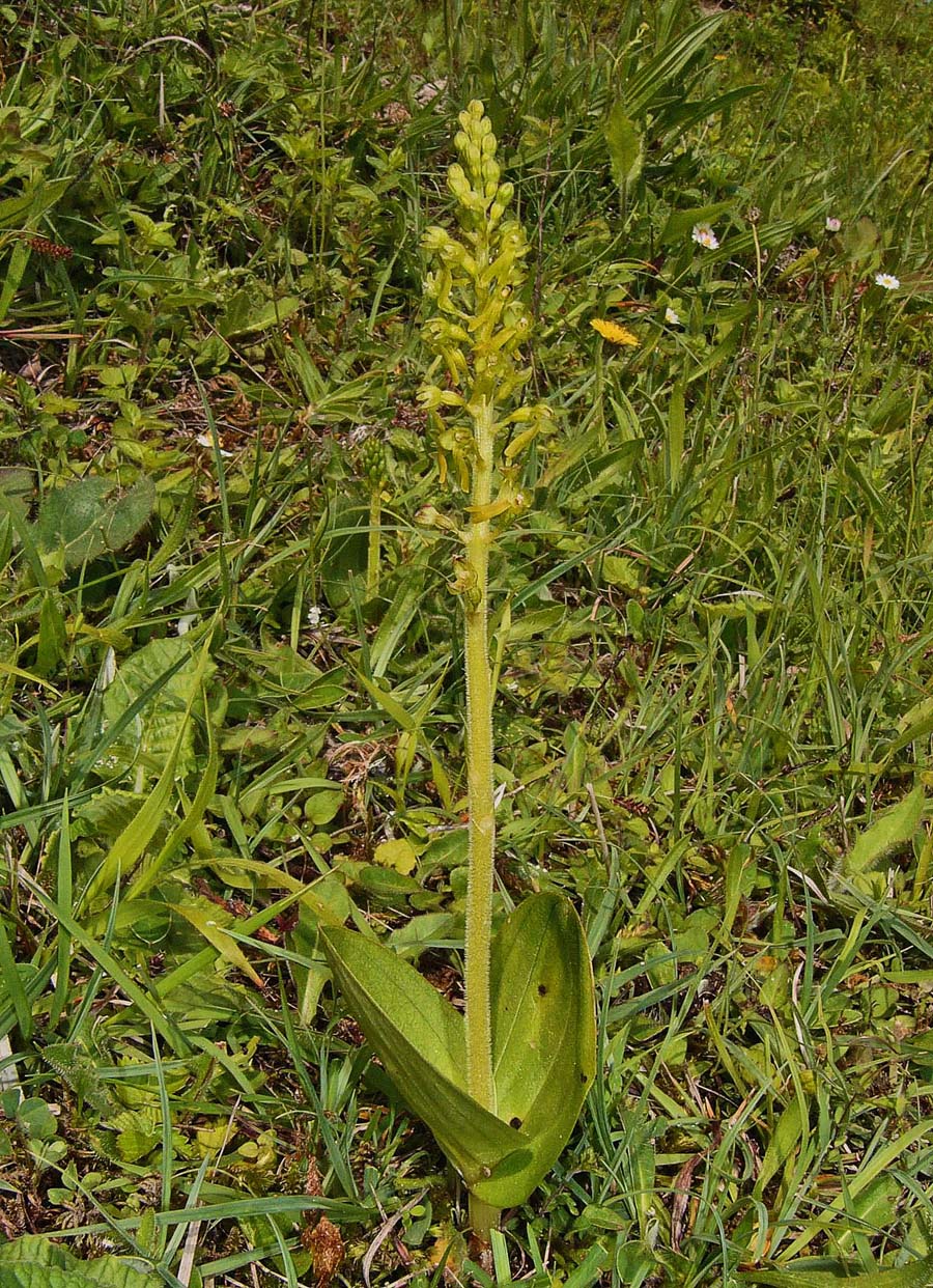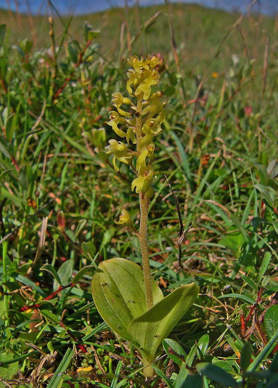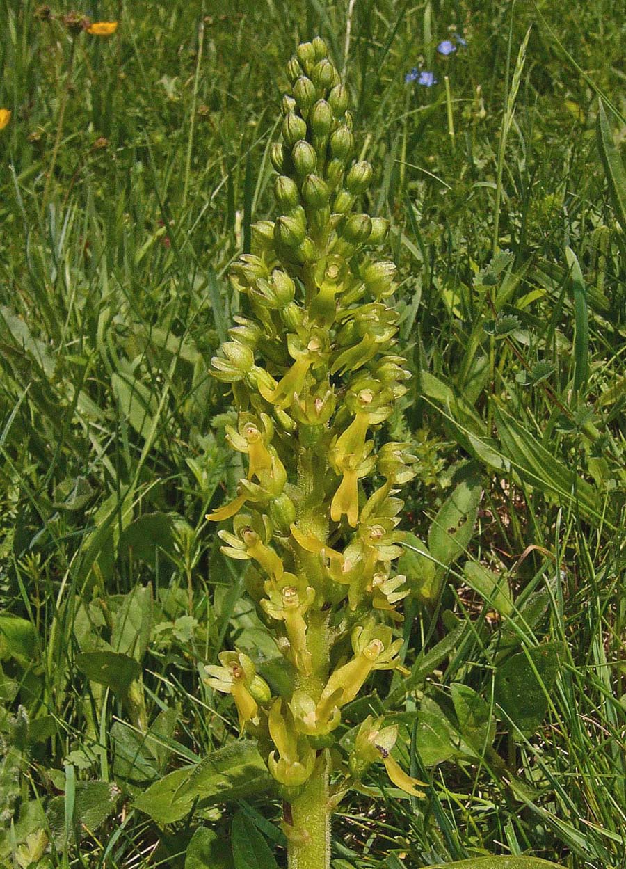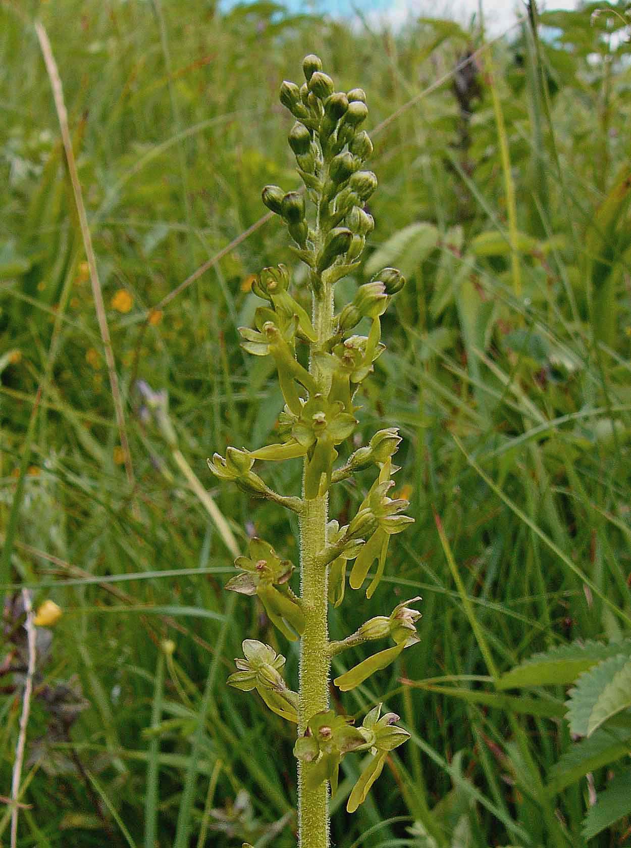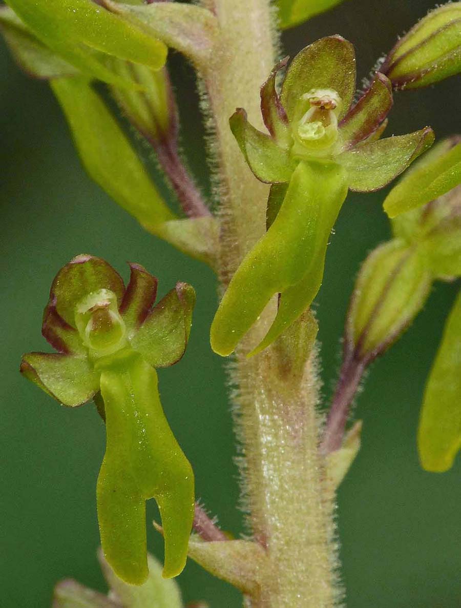 This is arguably the most familiar and widespread orchid in temperate Europe, though extremely rare in the Mediterranean zones. It is a species well suited to 21st century existence in that it tolerates a wide range of conditions and possesses a pollination system that allows a huge variety of insects to trigger its reproductive mechanisms. N. ovata, as with its smaller but close relative N. cordata produces copious nectar and insects following this bountiful trail immediately activate a sensitive internal apparatus which fires off a droplet of liquid that sets hard on the visiting insects head. There are few orchids which can really be described as common, but in as far as this circumstance exists, N. ovata is a common orchid and one which can be found growing in a huge range of conditions, with the exception of the most strongly acidic substrates. Full sun or heavy shade, damp or dry soils and even high altitude seem to be a matter of insignificance to this hardy species, though as mentioned earlier it draws a line at the excessively high Spring temperatures of the Mediterranean. Another reason for this species success is its ability to survive and flower for more than twenty years without the presence of mycorrhiza. This is an orchid which although somewhat unprepossessing in appearance, is truly robust and likely to survive where other species capitulate to modern agricultural and population pressures. An example of the adaptability of this species can be seen in the final two photos which depict a plant growing in an acidic bog in the New Forest of southern England.  |