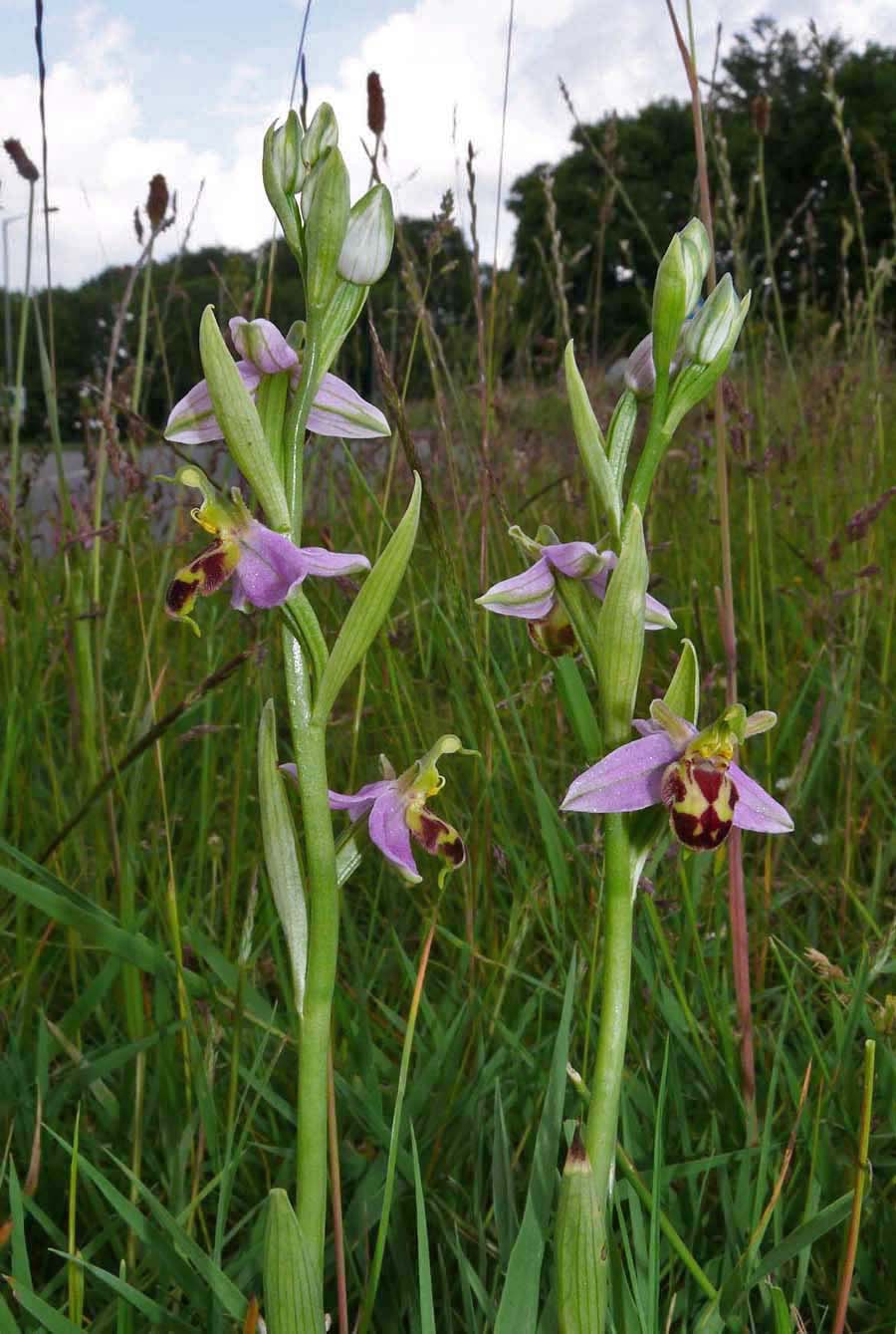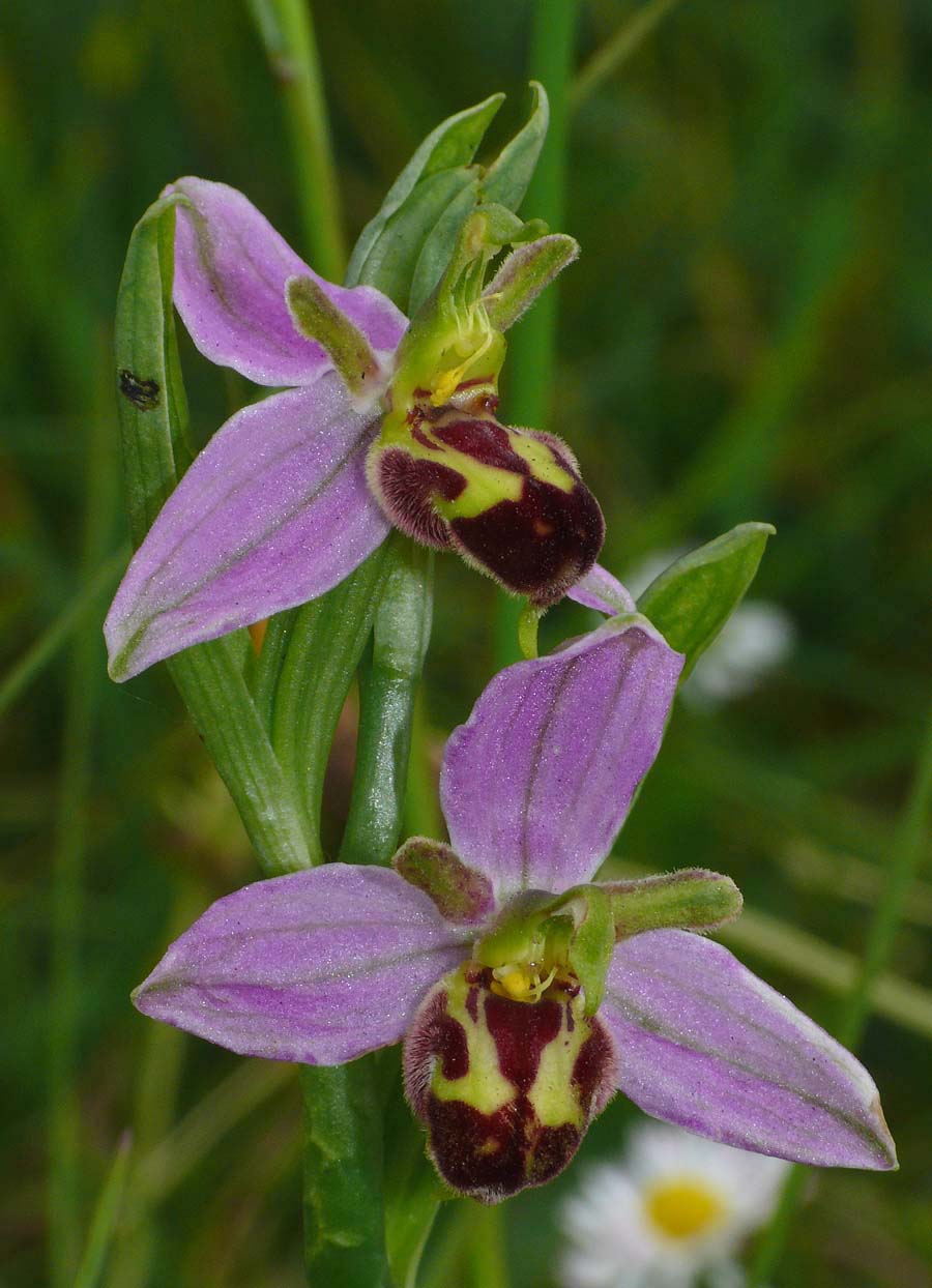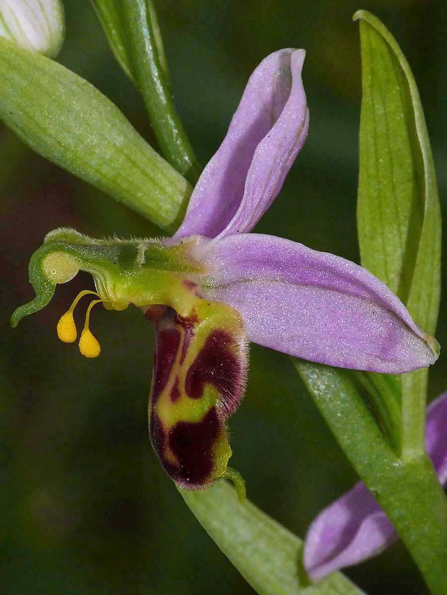 It is a widespread orchid distributed across temperate and Mediterranean Europe as far east as the Caucasus. In its favoured locations it can be abundant and its choice of habitat is wide, ranging from the driest chalk grassland/garrigue to wet, even swampy conditions. It prefers a full sun position but will tolerate even significant shade. Sepal colouration is normally pale pink but white is not uncommon and in the Balkans, white can be dominant, with pink a real rarity. O. apifera is largely self pollinating and this autogamy seems responsible for the frequent appearance of variant plants, some of which, although not of evolutionary significance, occur on a sufficiently regular basis to have acquired formal varietal status. O. apifera var. belgarum was first discovered by Messrs Jenkinson and Laurence on a chalky roadside verge near Winchester, England and was subsequently described by D. M. Turner Ettlinger in 1998. Its name literally means "of the Belgae", this being a Celtic tribe who in Roman times lived in the vicinity of Venta Belgarum, now better known as Winchester. This variety is uncommon but although formerly thought to be restricted to this Southern area of chalk downland in Hampshire, is now known from several other locations in England and Wales. It is however extremely rare outside the UK and known from only a handful of sites in Europe. It differs from type in several significant ways :- 1. the labellum markings are yellower, more extensive and often somewhat disintegrated. 2. the basal field is absent with an incomplete necklace. 3. the lip is longer and more pointed at the tip 4. the shoulders are hairy 5. the lateral lobes are less well developed and not forward pointing. |