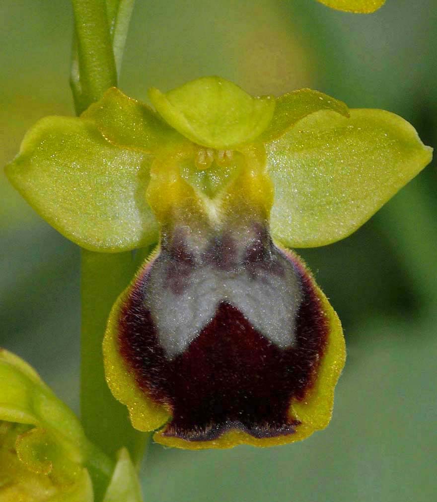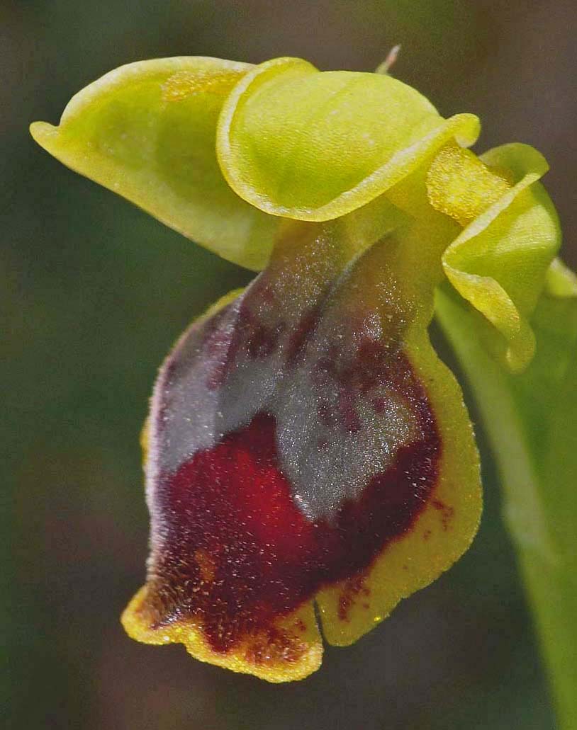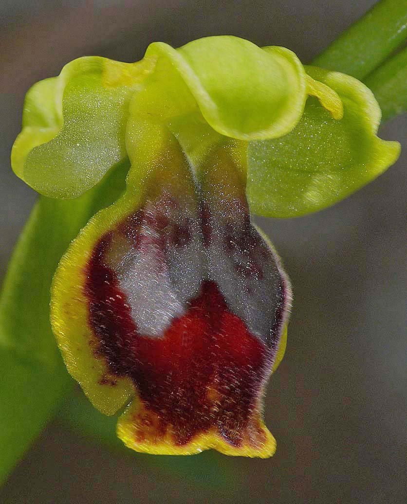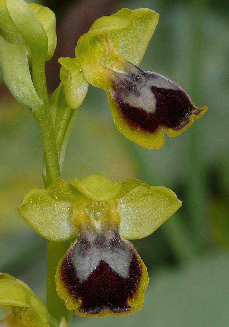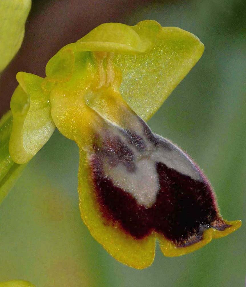 In its typical form it is a relatively straightforward plant to identify although as with other members of the O. subfusca group, natural variation and genetic interference can often complicate identification. The first four photographs depict examples that exhibit all the characteristic features of the species and are therefore most representative. Sicily is an island on which the O. subfusca and O. lutea groups are very well represented, but it's perhaps the very similar O. numida and O. flammeola that present the greatest difficulties. O. archimedea has significantly less open sinuses than either of these species and the dark, hairy area of the central lobe tends to spread into the lateral lobes with only minimal orange dilution at the perimeter. Unlike O. numida, it is a large flowered species with a relatively flat lip and a speculum that is always light grey and often with a distinctive milky appearance. The base of the speculum is usually marbled and the tip normally finished with a well defined, contrasting omega. As already mentioned, Sicily is rich in Pseudophrys including no less than seven of the "yellow" Ophrys and this has contributed to the creation of significant intermediate populations which complicate identification. It is also the source of considerable disagreement amongst experts as to the true number of taxa represented on the island. The pictures are all from central Sicily and date from the third week of April. |