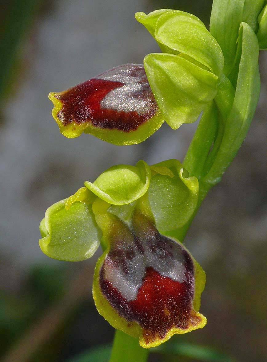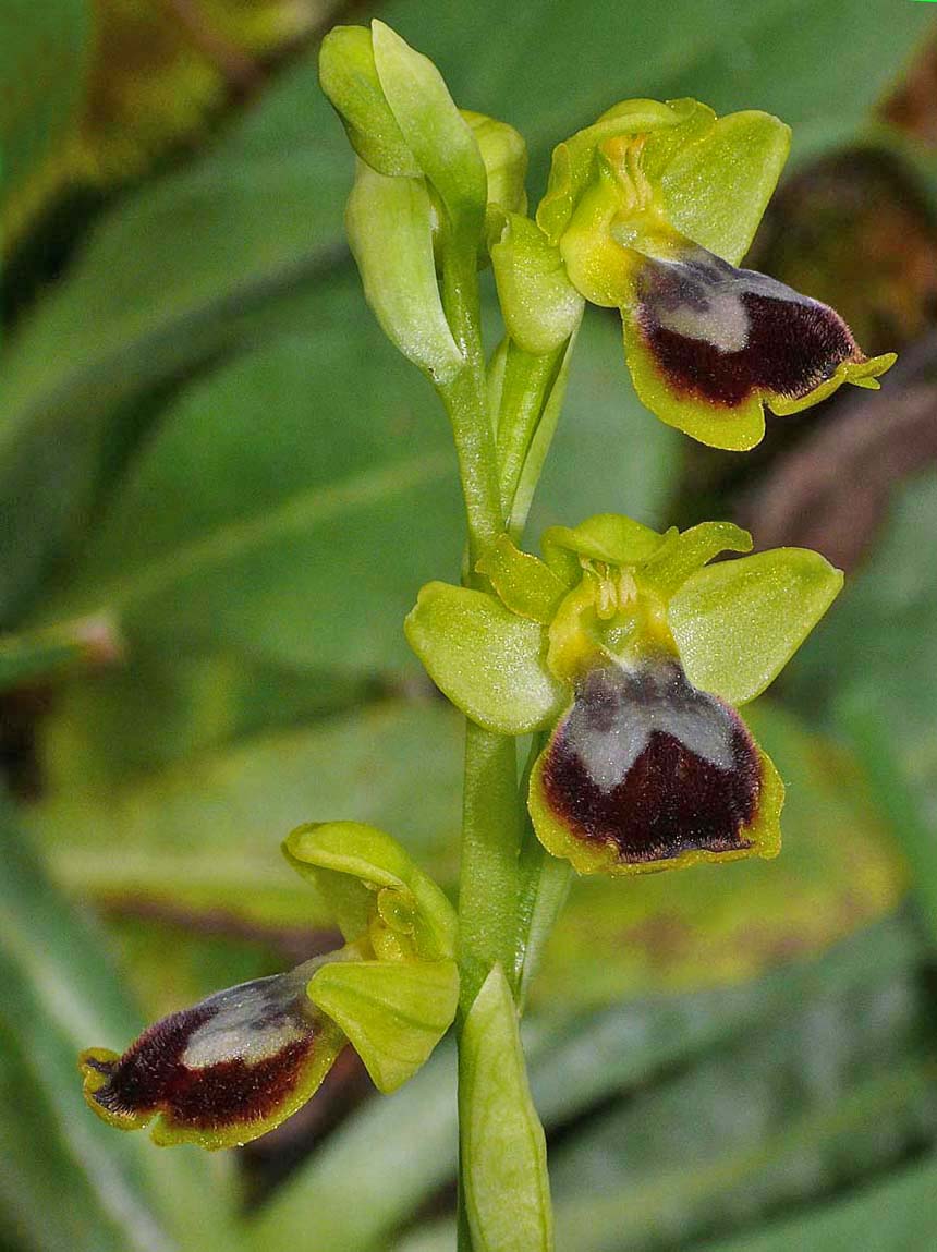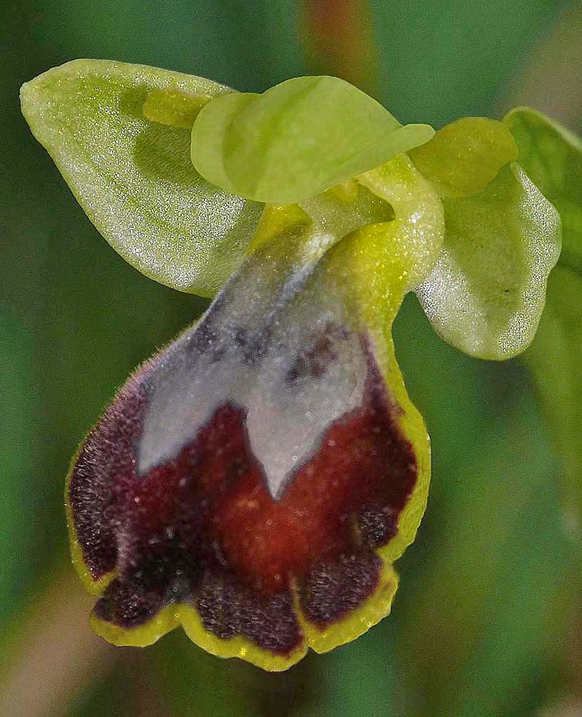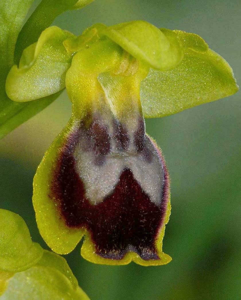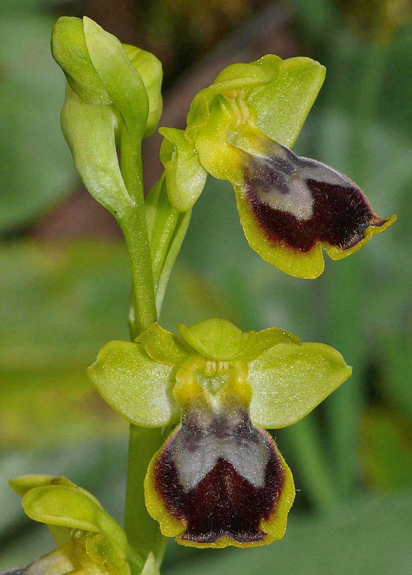 In its typical form it is a relatively straightforward plant to identify although as with other members of the O. subfusca group, natural variation and genetic interference can often complicate identification. The first four photographs depict examples that exhibit all the characteristic features of the species and are therefore most representative. Sicily is an island on which the O. subfusca and O. lutea groups are very well represented, but it's perhaps the very similar O. numida and O. flammeola that present the greatest difficulties. O. archimedea has significantly less open sinuses than either of these species and the dark, hairy area of the central lobe tends to spread into the lateral lobes with only minimal orange dilution at the perimeter. Unlike O. numida, it is a large flowered species with a relatively flat lip and a speculum that is always light grey and often with a distinctive milky appearance. The base of the speculum is usually marbled and the tip normally finished with a well defined, contrasting omega. As already mentioned, Sicily is rich in Pseudophrys including no less than seven of the "yellow" Ophrys and this has contributed to the creation of significant intermediate populations which complicate identification. It is also the source of considerable disagreement amongst experts as to the true number of taxa represented on the island. The pictures are all from central Sicily and date from the third week of April. |