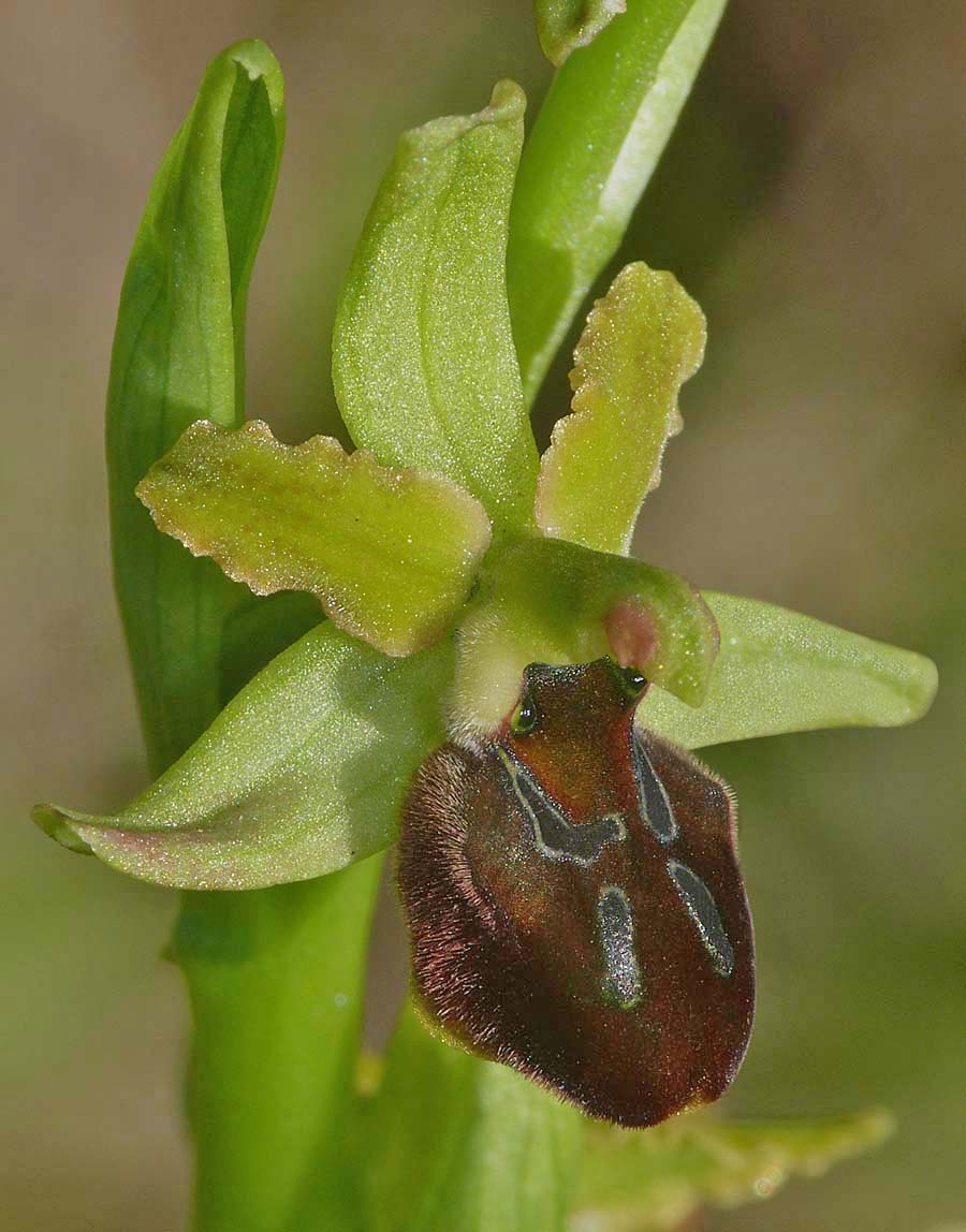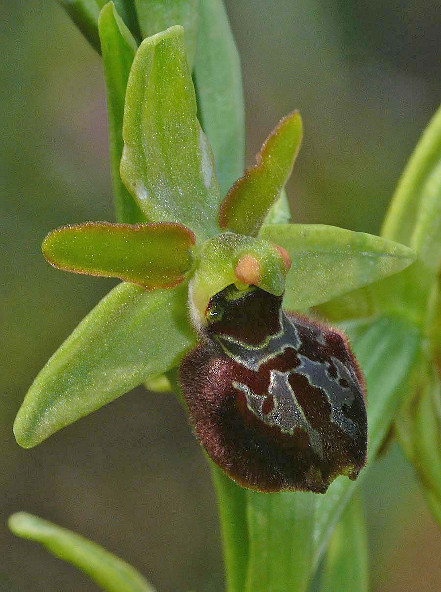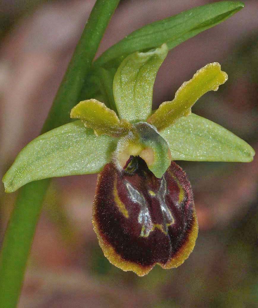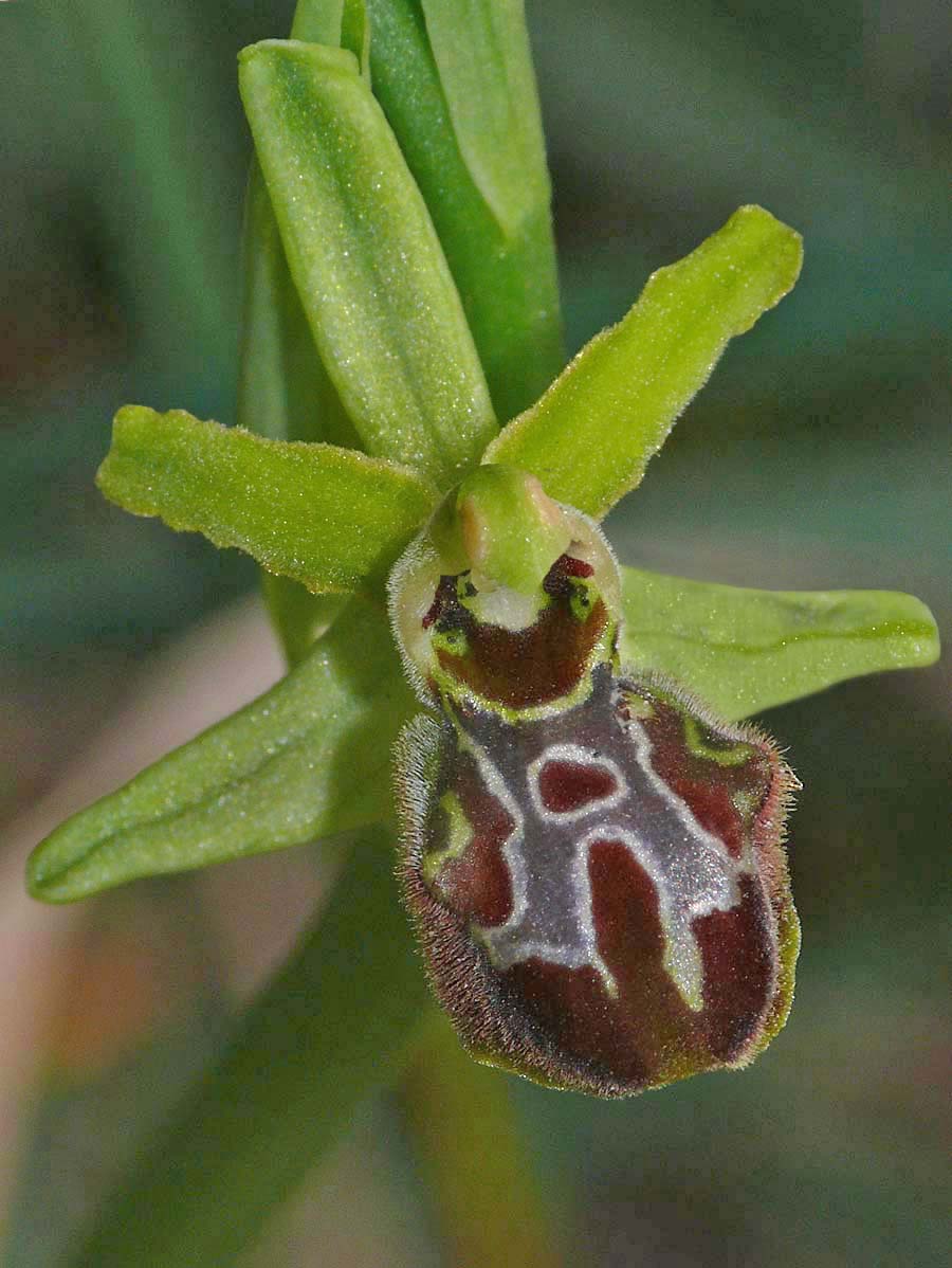 This Ophrys is an Italian endemic ranging from La Spezia in the north to the Latium region south of Rome. As its name suggests O. argentaria is at its most frequent in the Grosetto area of southern Tuscany and it's here that its range overlaps with several other closely related species. There are three other Ophrys taxons that may be found in flower concurrently with O. argentaria between March and early May, O. classica, O. tarquinia and O. sphegodes. All these species have individual distinguishing features but years of introgression have created intermediate populations that defy accurate identification. The following characteristics are typical of O. argentaria but as can be seen from the photographs, it is a variable species which as mentioned above has recieved significant gene interference. 1. Most importantly it is the smallest flowered of the four species. 2. The specular pattern is usually complex, often extensive and fragmented with extensions, marbling and ocelli. 3. Basal swellings are normally small or absent. 3; It tends to be a shorter plant, spindlier than the other species and with a laxer inflorescence, frequently containing fewer than six individual flowers. O. argentaria is a localized orchid but can grow in large numbers in its favoured locations and although generally associated with alkaline soils, can tolerate slightly acidic or sandy conditions. All the photographs come from Tuscany, between Sienna and Monte Argentaria, dating from the first week of April.  |