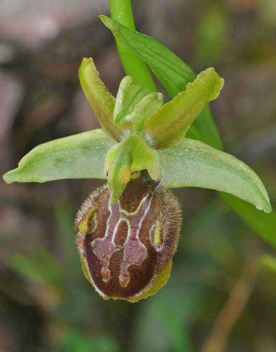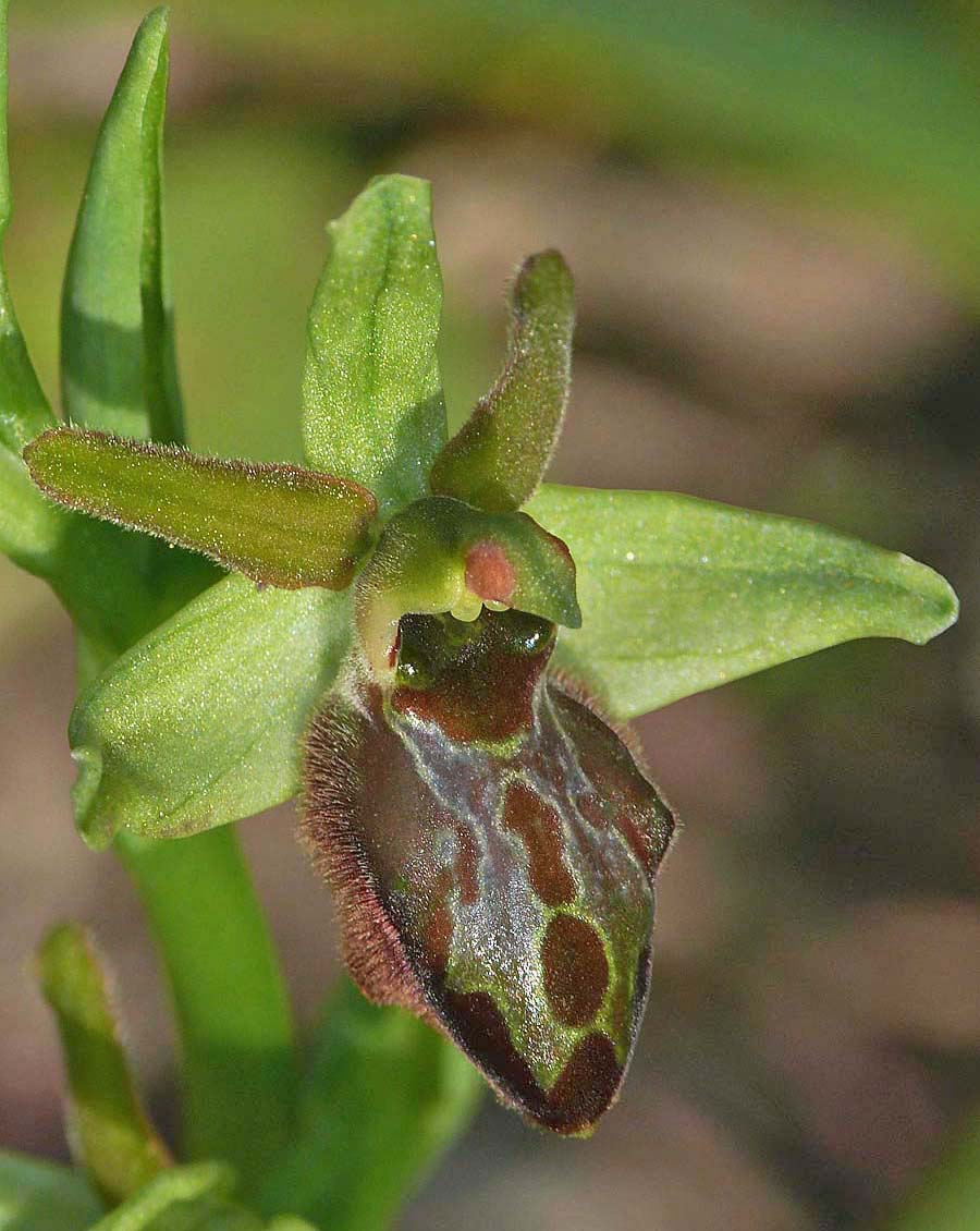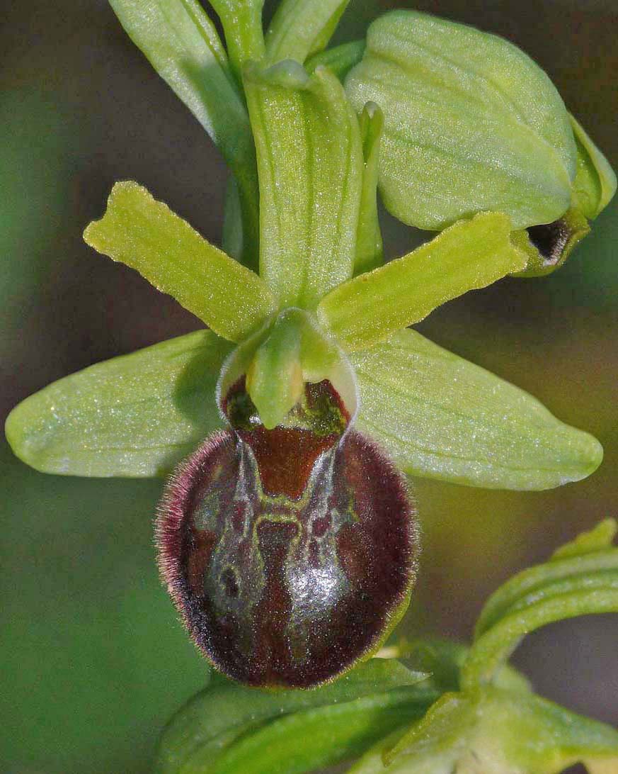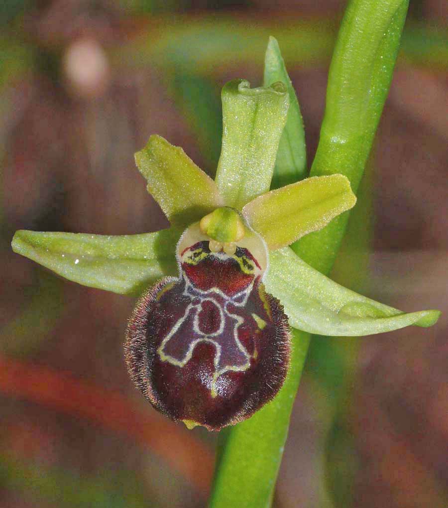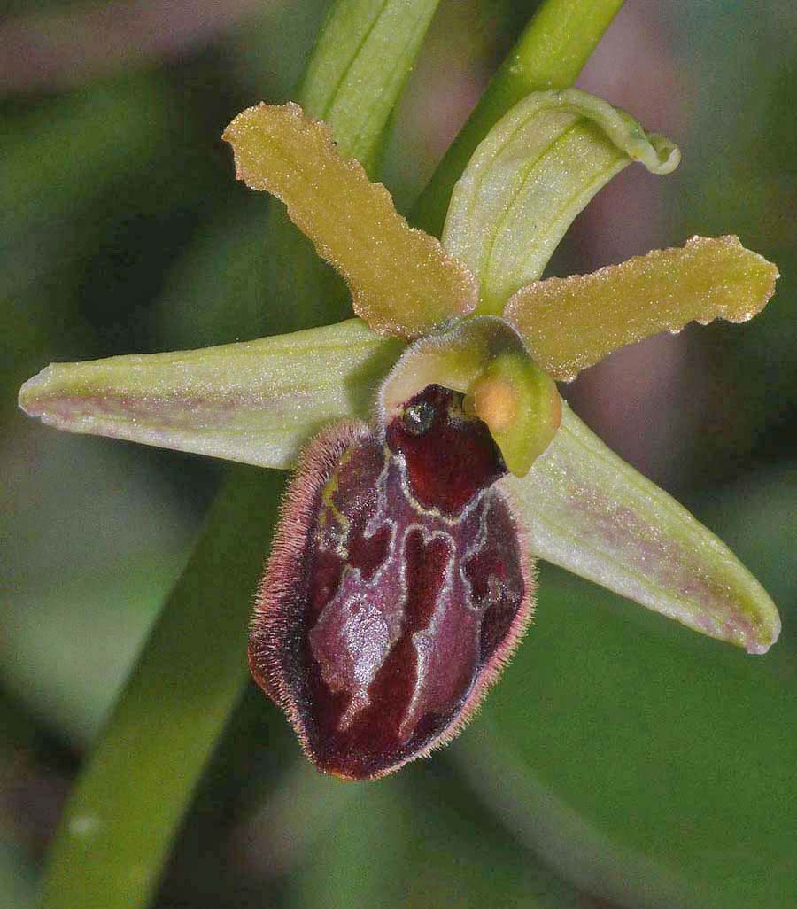 This Ophrys is an Italian endemic ranging from La Spezia in the north to the Latium region south of Rome. As its name suggests O. argentaria is at its most frequent in the Grosetto area of southern Tuscany and it's here that its range overlaps with several other closely related species. There are three other Ophrys taxons that may be found in flower concurrently with O. argentaria between March and early May, O. classica, O. tarquinia and O. sphegodes. All these species have individual distinguishing features but years of introgression have created intermediate populations that defy accurate identification. The following characteristics are typical of O. argentaria but as can be seen from the photographs, it is a variable species which as mentioned above has recieved significant gene interference. 1. Most importantly it is the smallest flowered of the four species. 2. The specular pattern is usually complex, often extensive and fragmented with extensions, marbling and ocelli. 3. Basal swellings are normally small or absent. 3; It tends to be a shorter plant, spindlier than the other species and with a laxer inflorescence, frequently containing fewer than six individual flowers. O. argentaria is a localized orchid but can grow in large numbers in its favoured locations and although generally associated with alkaline soils, can tolerate slightly acidic or sandy conditions. All the photographs come from Tuscany, between Sienna and Monte Argentaria, dating from the first week of April.  |