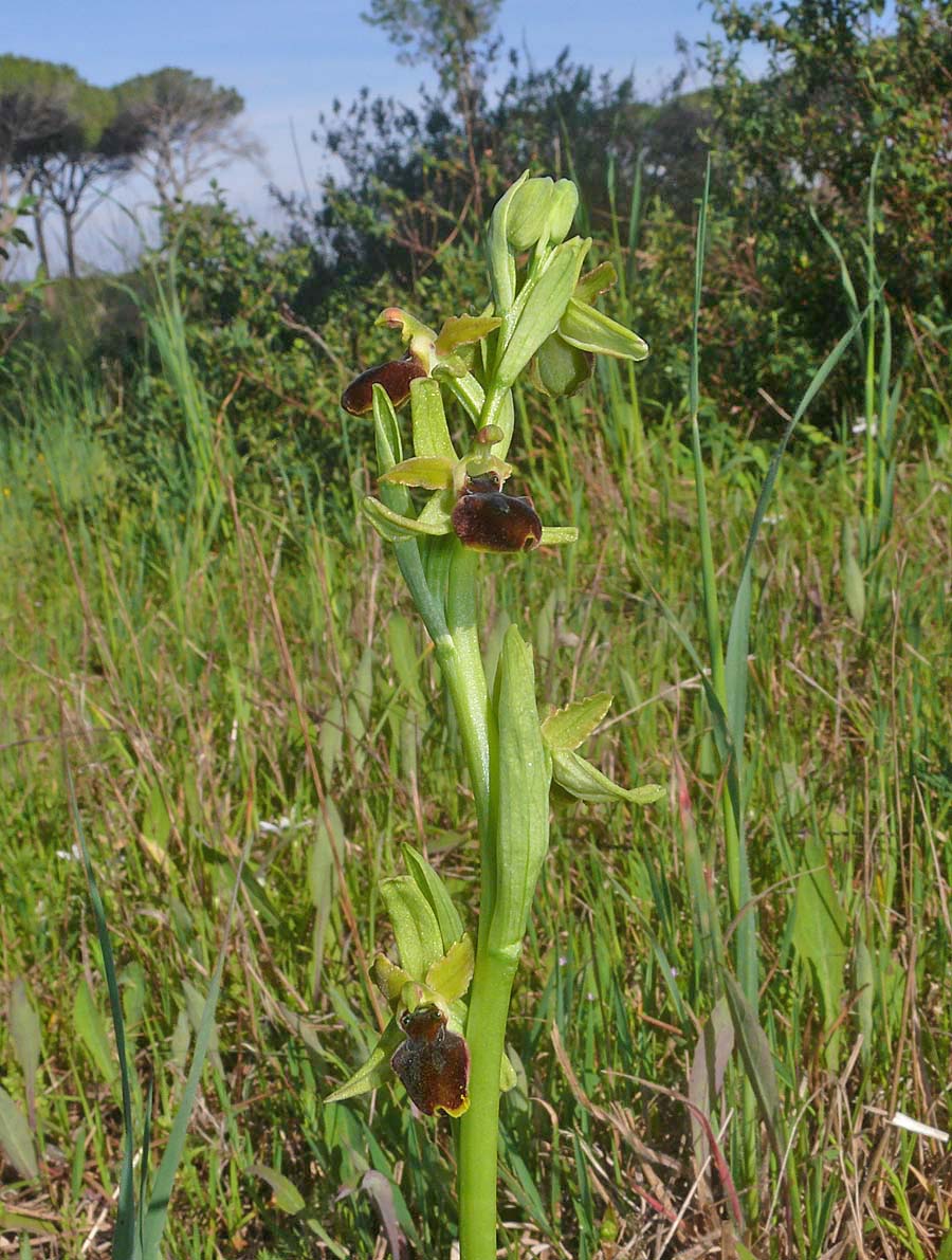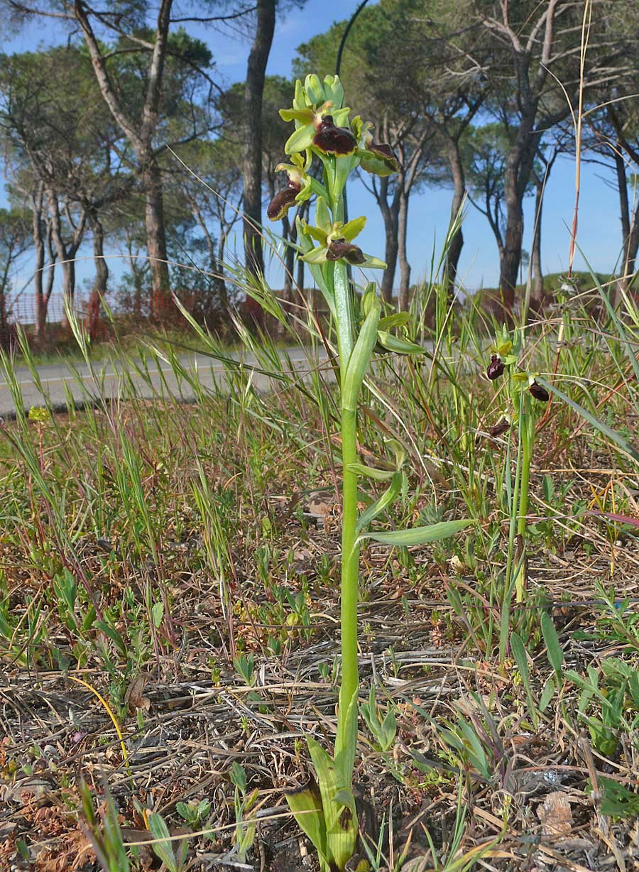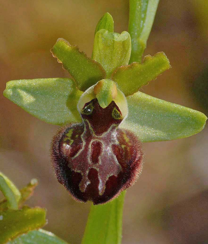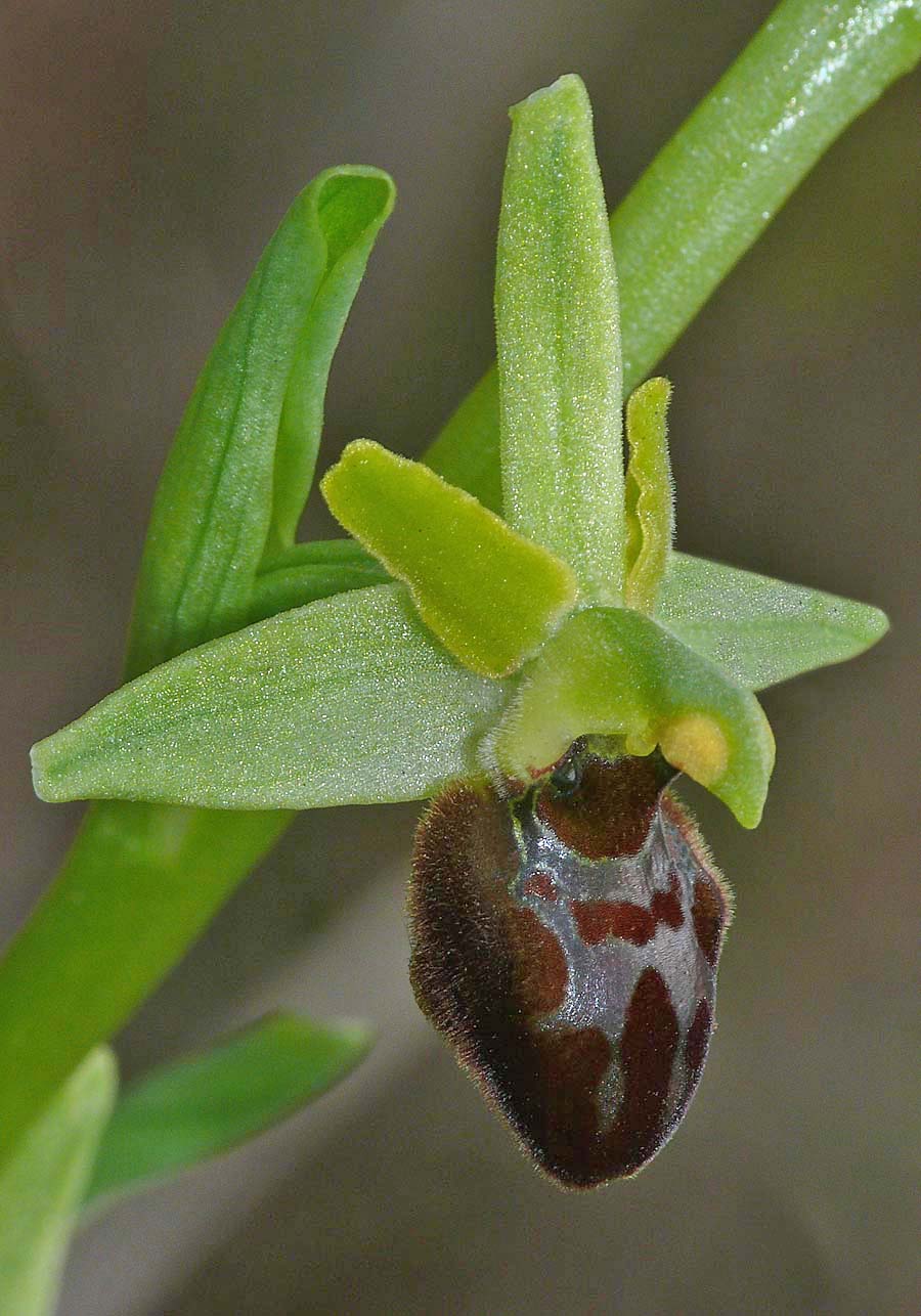This Ophrys is an Italian endemic ranging from La Spezia in the north to the Latium region south of Rome. As its name suggests O. argentaria is at its most frequent in the Grosetto area of southern Tuscany and it's here that its range overlaps with several other closely related species. There are three other Ophrys taxons that may be found in flower concurrently with O. argentaria between March and early May, O. classica, O. tarquinia and O. sphegodes. All these species have individual distinguishing features but years of introgression have created intermediate populations that defy accurate identification. The following characteristics are typical of O. argentaria but as can be seen from the photographs, it is a variable species which as mentioned above has recieved significant gene interference. 1. Most importantly it is the smallest flowered of the four species. 2. The specular pattern is usually complex, often extensive and fragmented with extensions, marbling and ocelli. 3. Basal swellings are normally small or absent. 3; It tends to be a shorter plant, spindlier than the other species and with a laxer inflorescence, frequently containing fewer than six individual flowers. O. argentaria is a localized orchid but can grow in large numbers in its favoured locations and although generally associated with alkaline soils, can tolerate slightly acidic or sandy conditions. All the photographs come from Tuscany, between Sienna and Monte Argentaria, dating from the first week of April.  |
