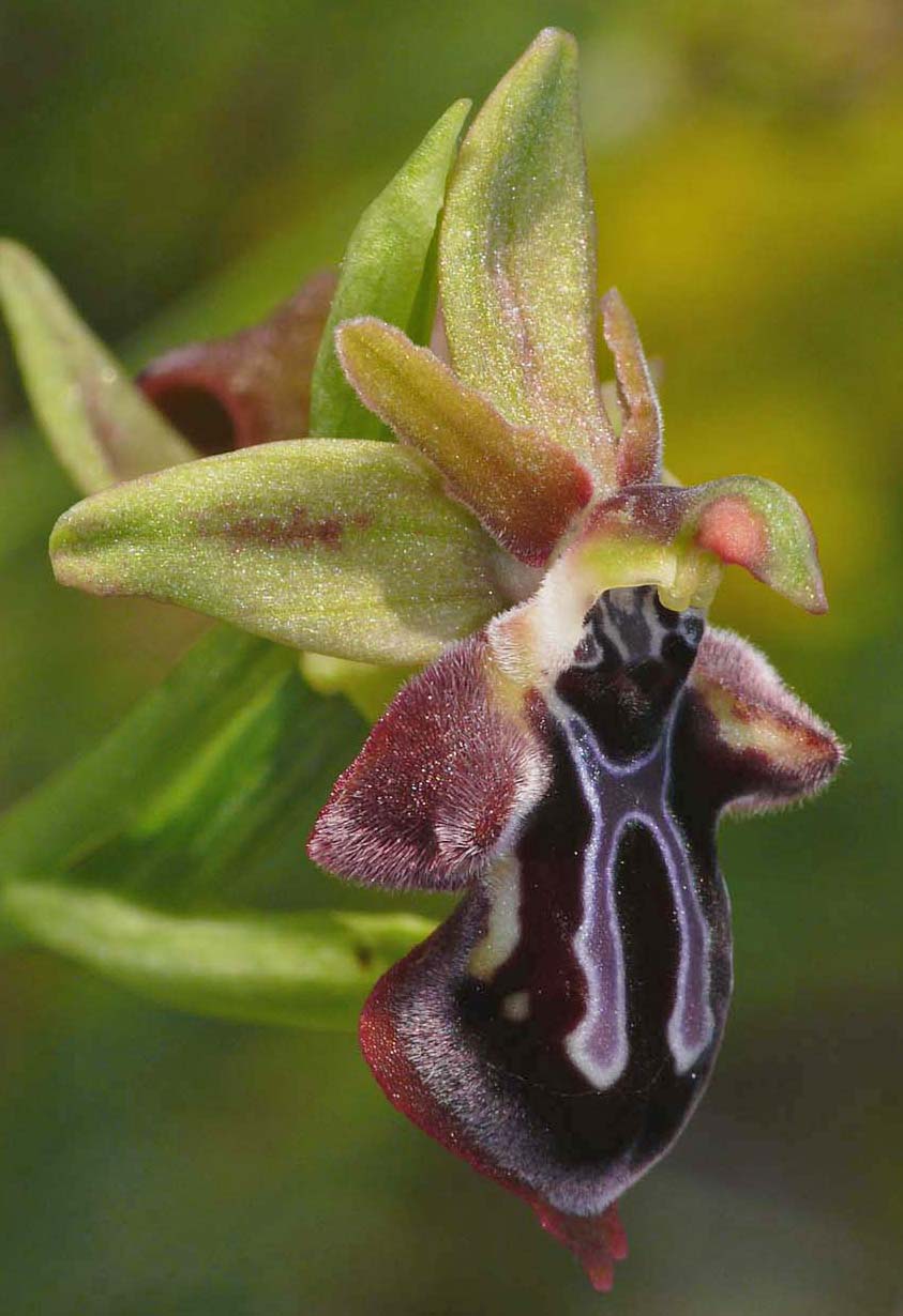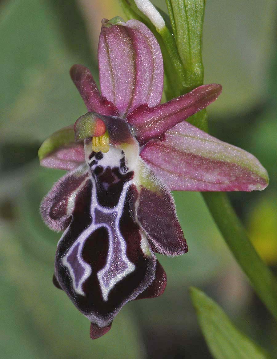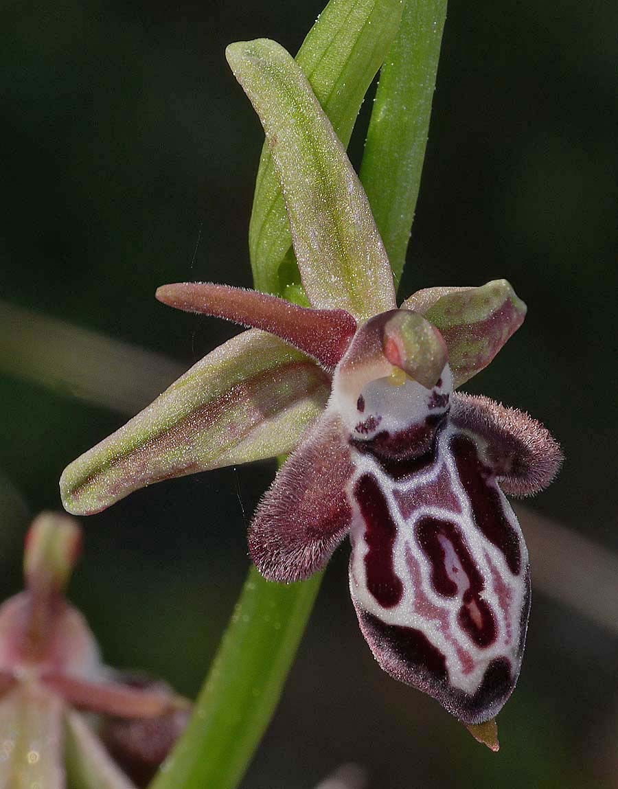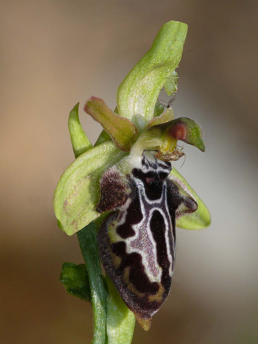 This species is a Greek endemic being found in the Cyclades, Karpathos and Crete where it is not uncommon on the eastern side of the island. It has also been recently discovered in small numbers on the mainland in both Attica and the southern Peloponnese. It is a very similar plant to O. cretica and on Crete itself, the two species are known to hybridize, though the scope for this is limited by minimal geographical overlap and significant differences in flowering times. Even in pure populations, natural variation ensures distinguishing between O. ariadnae and O. cretica is not always straightforward. In typical forms however, two features in particular serve to separate the taxons. The first of these is the stigmatic cavity which in O. cretica is constricted at the base, creating the appearance of a neck, whereas in O. ariadnae, it widens at the base or at least rises straight up from the shoulders (see pictures 4 and 13). A second characteristic is the normally more complex and extensive specular pattern of O. ariadnae. Commencement of flowering can vary, sometimes appearing up to a month before its close relative. They both however bloom for lengthy periods and can easily be found flowering concurrently, though rarely side by side. O. ariadnae starts flowering as early as February and is normally over by the end of April. The pictures are all from Crete and date from the first two weeks of April. |